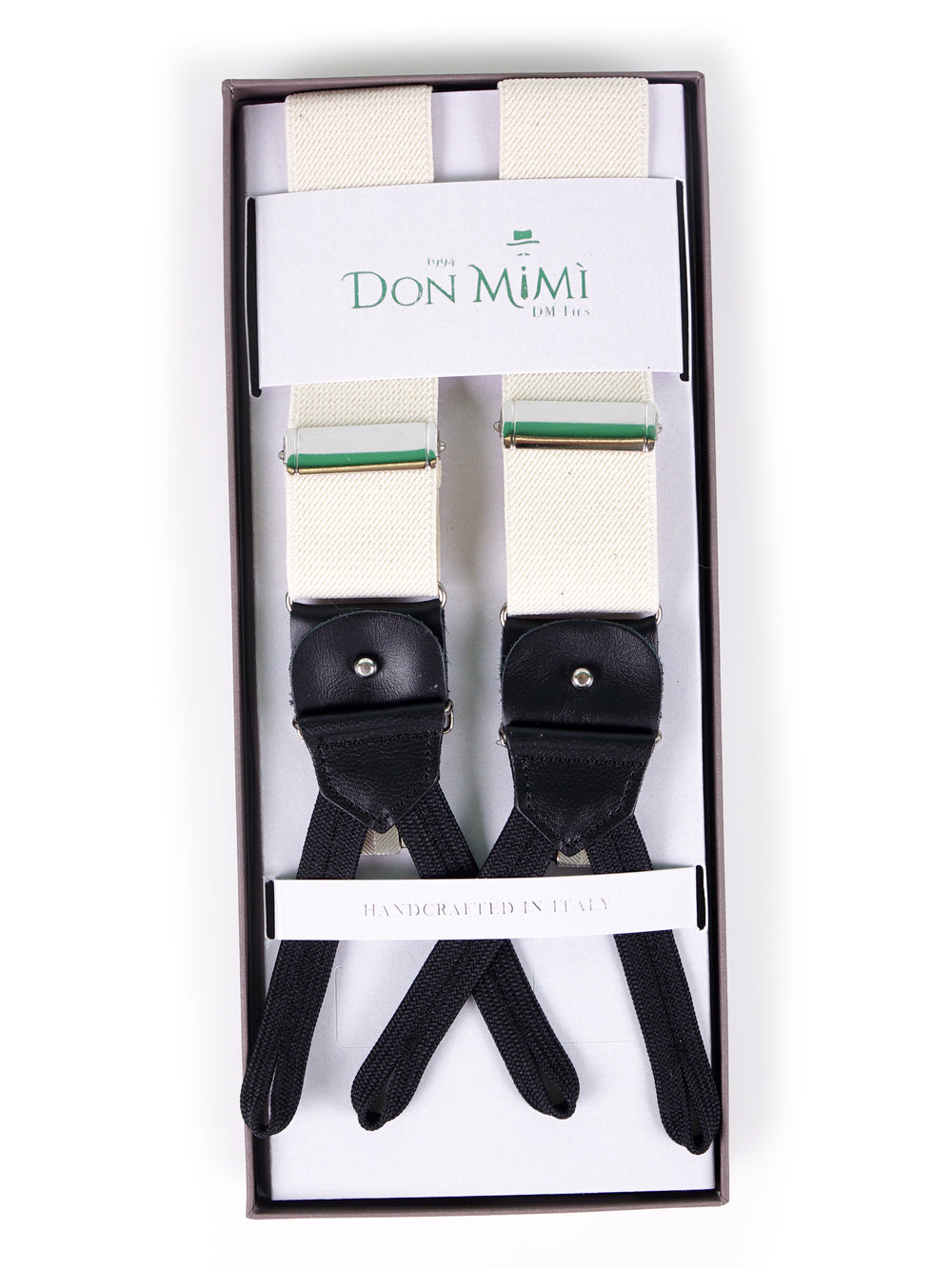 Il consiglio del sarto: Queste bretelle presentano i classici lacci in tessuto per l'aggancio ai bottoni. Per onorare la tradizione Don Mimì, assicuratevi che il vostro sarto applichi i bottoni all'interno della cintura del pantalone (e non all'esterno). Questo dettaglio, invisibile agli altri, è il segreto per una vestibilità superiore e un comfort senza pari durante tutta la giornata.