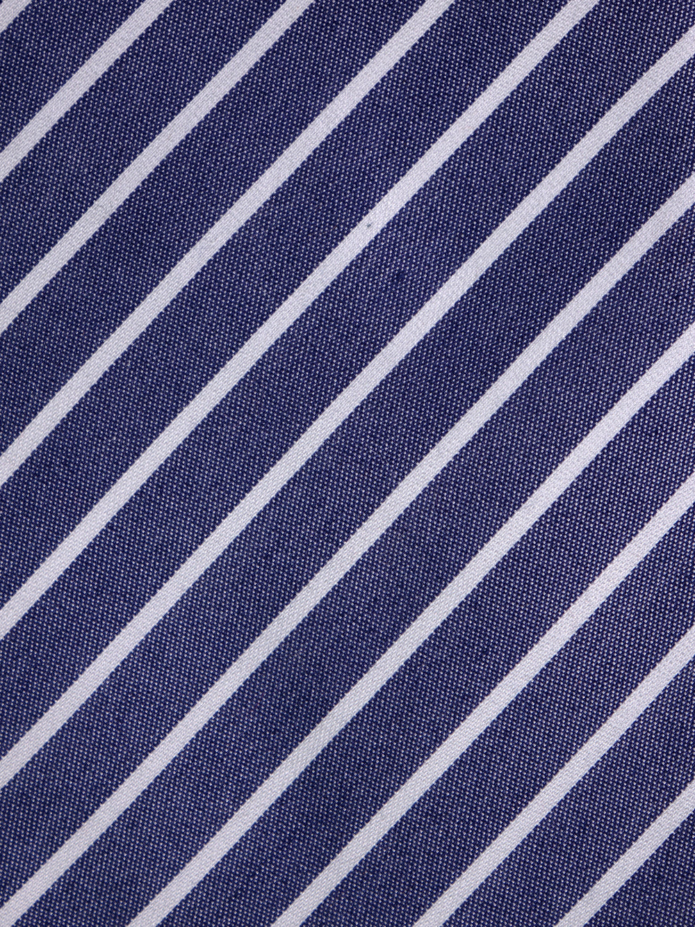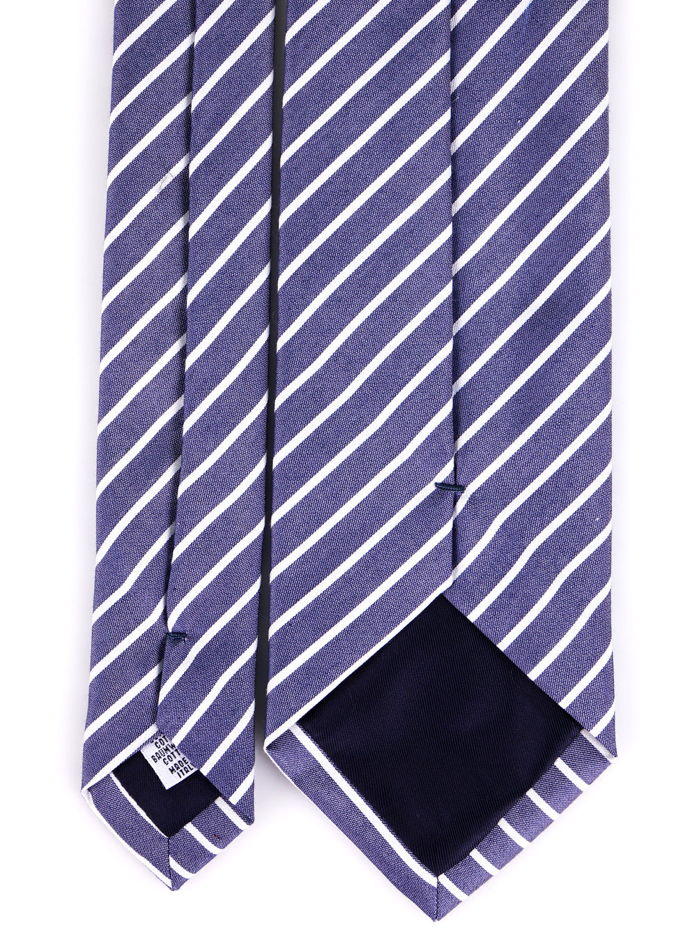 Il consiglio del sarto: Il cotone è un tessuto che tende ad avere una mano più "asciutta" e meno scivolosa della seta. Per questo motivo, il nodo ideale è il Four in Hand (Semplice) leggermente asimmetrico: esalta la natura casual-chic della cravatta e non crea un volume eccessivo sul collo della camicia estiva.
