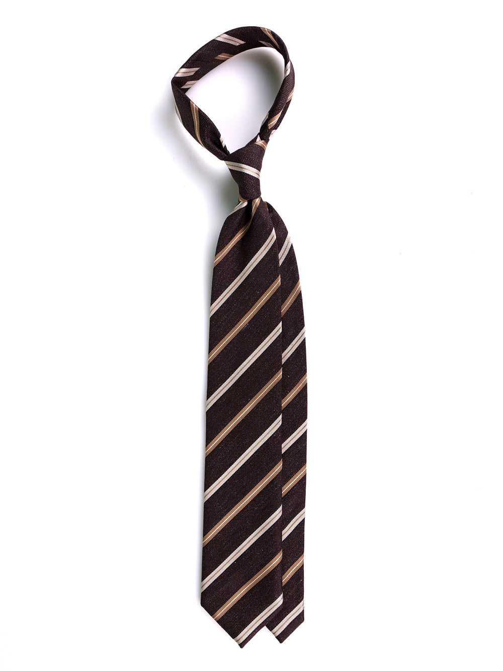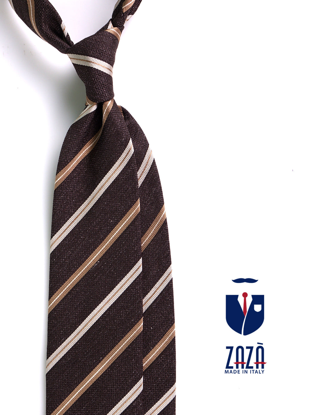 Dinamismo puro e stile "cool & sophisticated". La cravatta Mogano firmata Zazà è l'accessorio chiave per l'uomo che vive la città con grinta e personalità. La mischia intima di seta e cotone crea una texture asciutta e moderna, perfetta per spezzare la formalità troppo rigida. Il fondo marrone, caldo e deciso, viene elettrizzato dalle righe diagonali oro e bianco, creando un ritmo visivo che parla di viaggio, ambizione e voglia di distinguersi. Non è solo una cravatta, è il tuo biglietto da visita per non passare inosservato.