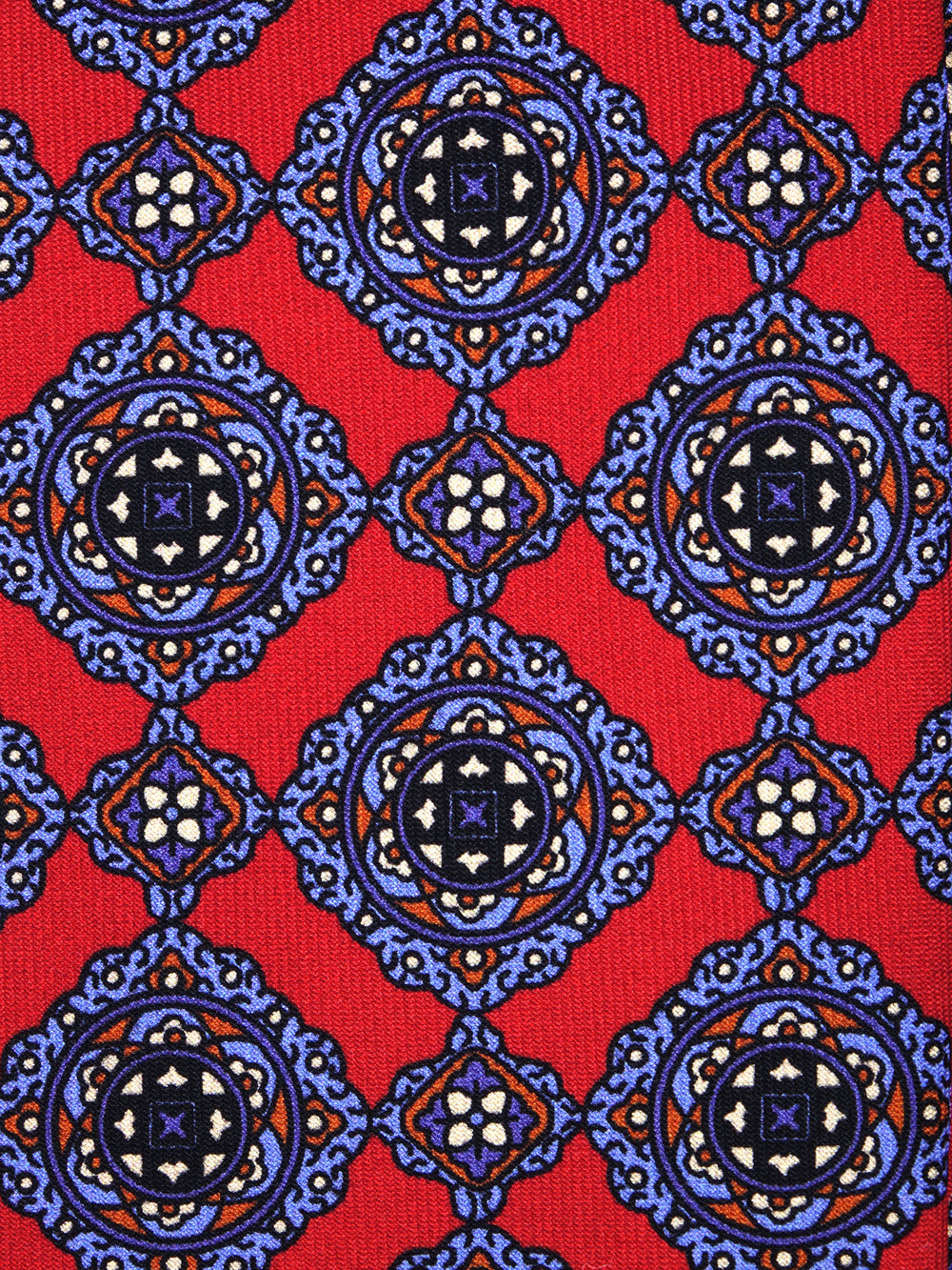 Fondo rosso con macrodisegno stilizzato in celeste, marrone e avorio