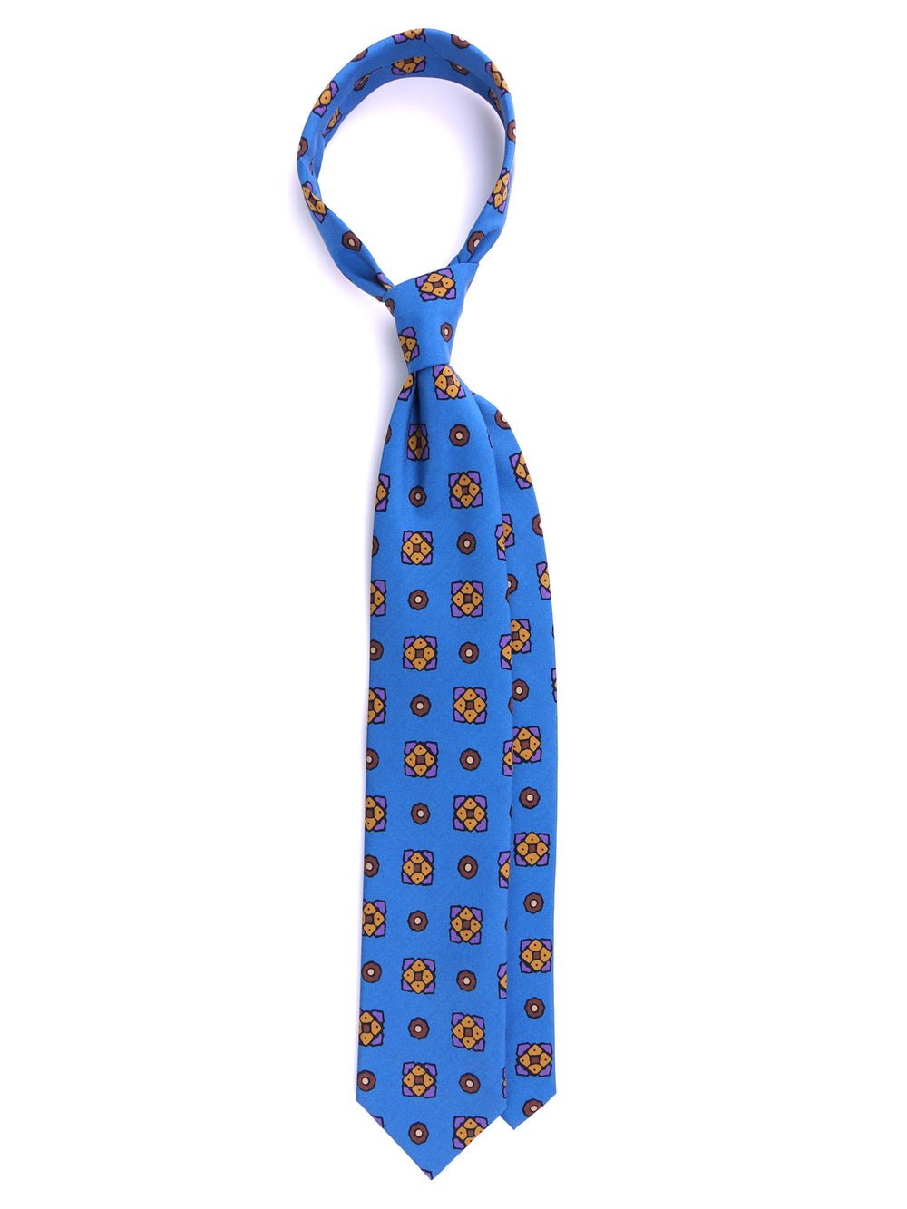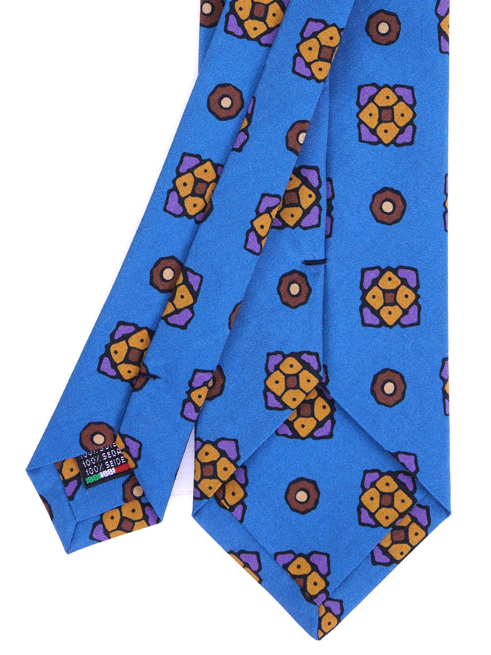 Fondo blu elettrico con disegni geometrici grandi rossi, gialli, bianchi e marroni