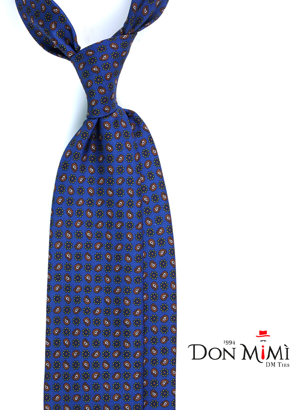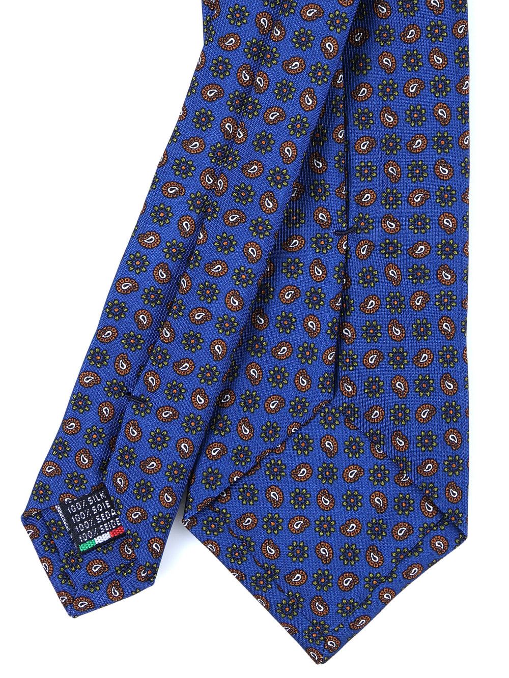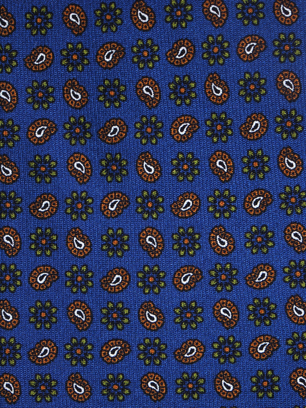Questa cravatta, pezzo forte della collezione Autunno/Inverno, è un viaggio nel cuore dell'eleganza maschile. Realizzata in pregiata seta inglese, presenta una fantasia che alterna due motivi iconici: il Paisley e un delicato fiorellino. Ma è la palette di colori a renderla unica: un brillante Blu Avion fa da sfondo a calde note di terracotta e a tocchi di verde oliva. È una cravatta che racconta storie di club per gentiluomini, di biblioteche e di passeggiate in campagna.