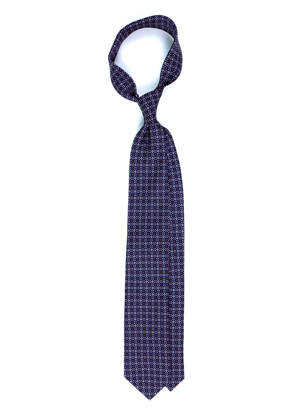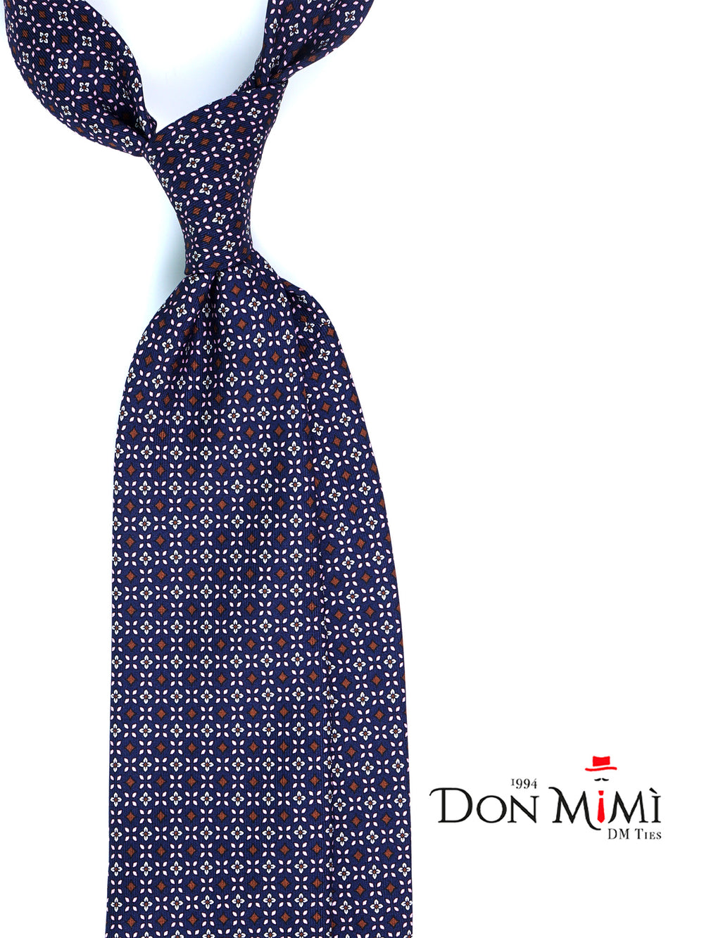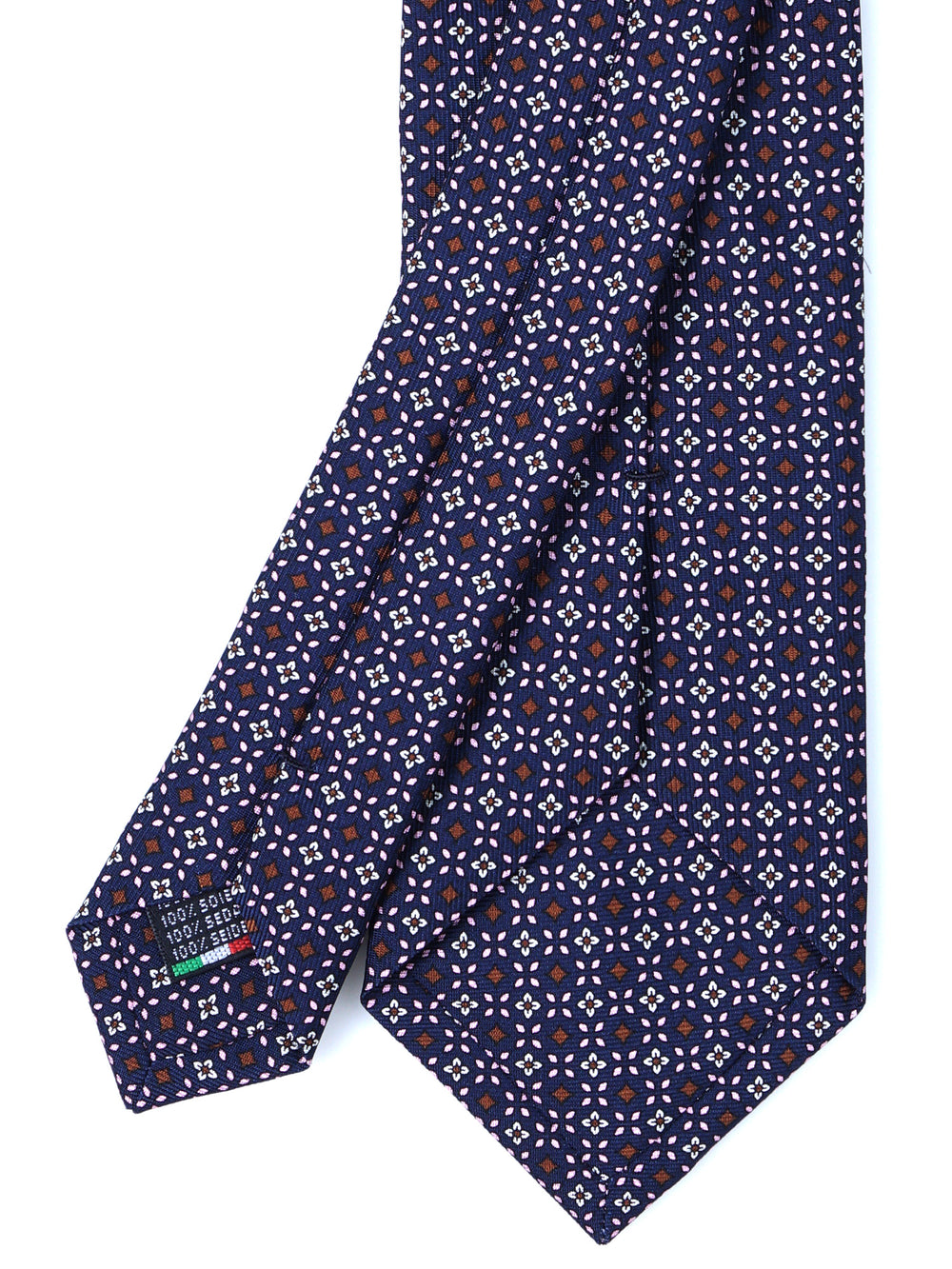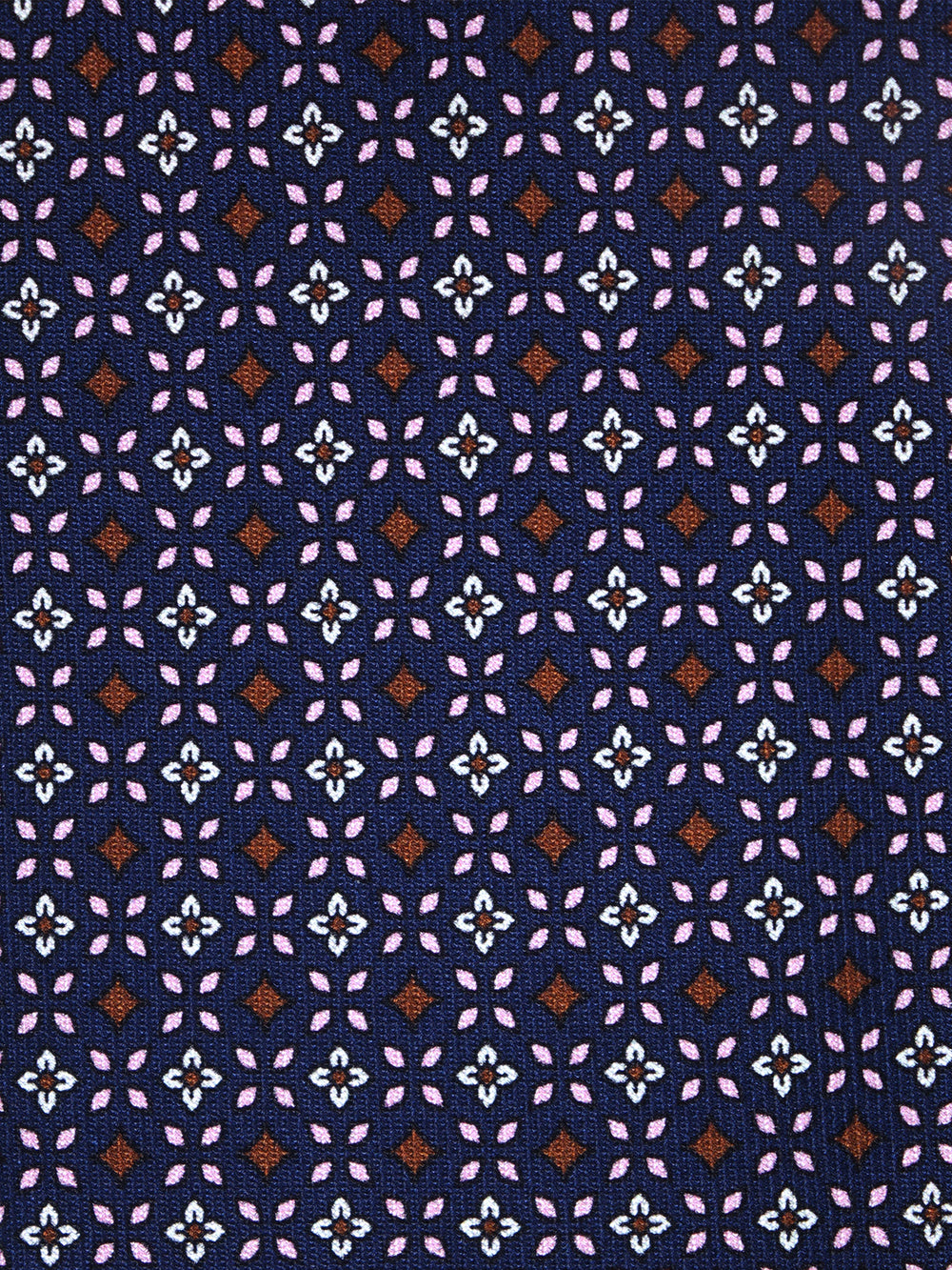Questa cravatta è un capolavoro di sottigliezza, un pezzo chiave della collezione Autunno/Inverno per l'uomo che trova l'eleganza nei dettagli nascosti. Su un fondo blu navy classico e rassicurante, fiorisce una fantasia che dialoga con colori inaspettati: un caldo marrone e un tocco di rosa antico. Realizzata in pregiata seta inglese, questa cravatta è un accessorio colto, che non grida ma sussurra stile, perfetto per chi apprezza un lusso discreto e personale.