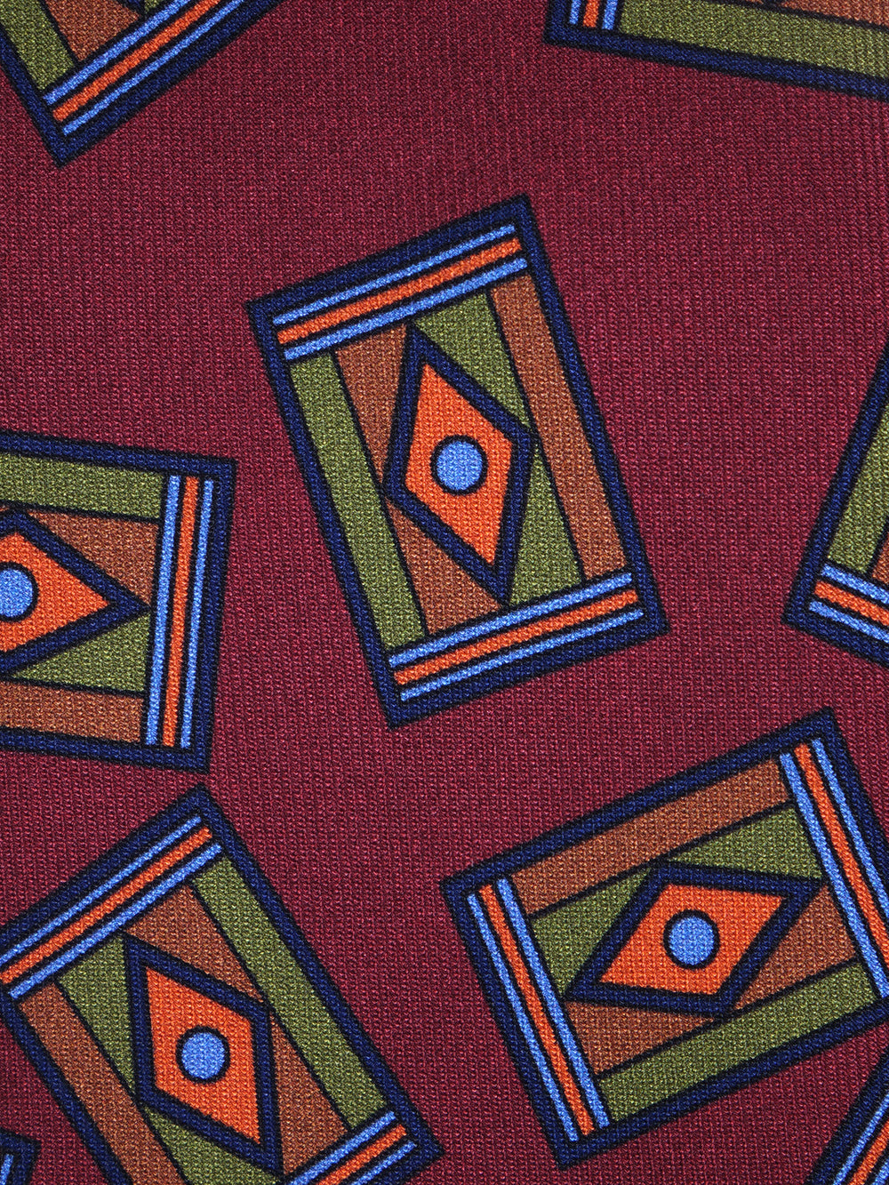 Questa cravatta, pezzo forte della collezione Autunno/Inverno, è un'opera d'arte tessile. Su un fondo bordeaux profondo e sontuoso, si sviluppa un disegno geometrico audace, di ispirazione vintage, che gioca con i caldi colori della terra. Realizzata in pregiata seta inglese, questa cravatta è pensata per l'uomo che non si nasconde, ma che usa lo stile per esprimere la propria personalità. È un accessorio che da solo può raccontare una storia.
