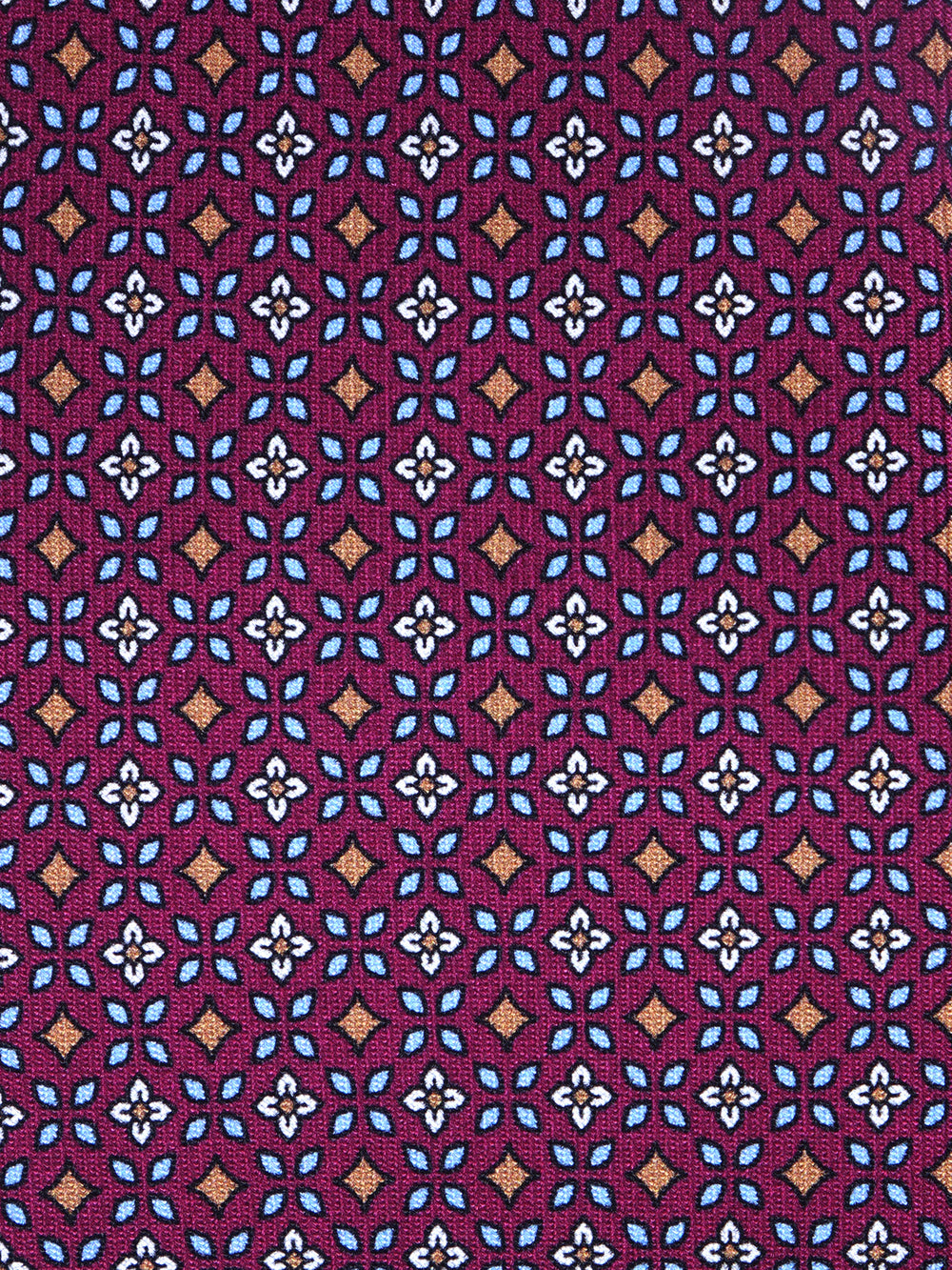 Questa cravatta è un inno alla stagione autunnale, un pezzo chiave della nostra collezione pensato per l'uomo che ama i colori caldi e le combinazioni ricercate. Il suo colore protagonista è un profondo Bordeaux, stampato su pregiata seta inglese per una resa cromatica satura e lussuosa. Il complesso disegno a mosaico, con dettagli giallo ocra e azzurro polvere, aggiunge un livello di complessità visiva, trasformando la cravatta in un vero e proprio punto focale di ogni outfit.