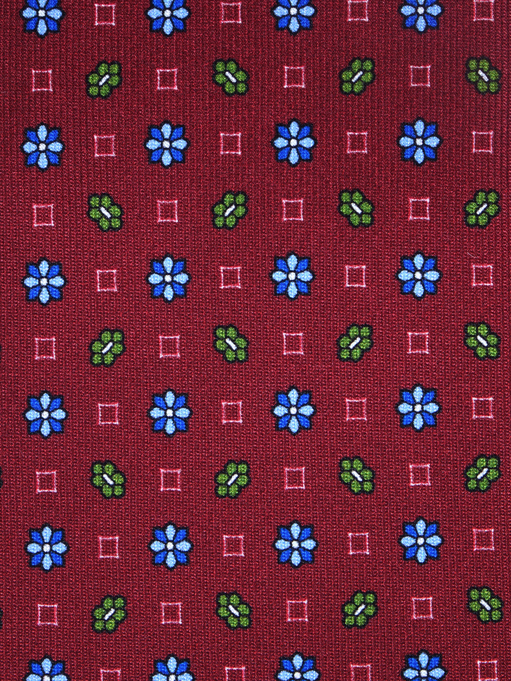 Questa cravatta è un capolavoro cromatico, un pezzo forte della collezione Autunno/Inverno per l'uomo che non teme di esprimere la propria personalità. Su un fondo Bordeaux caldo e lussuoso, fiorisce una fantasia che dialoga con colori audaci e ricercati: il blu e il verde. Realizzata in pregiata seta inglese, questa cravatta è un accessorio colto, che parla di stile, cultura e una profonda conoscenza dei colori. La sua trama in saia di seta garantisce un nodo impeccabile.