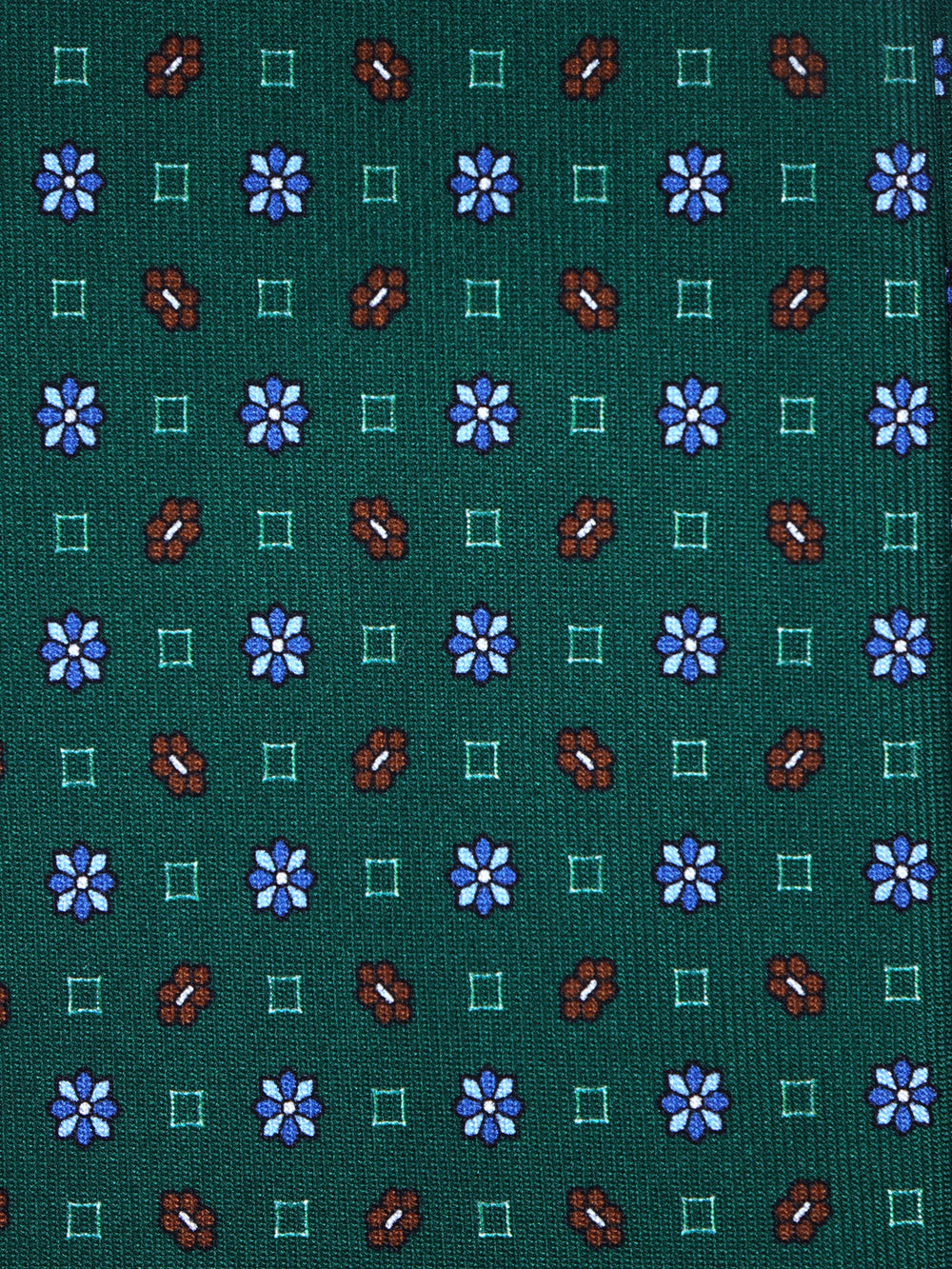 Questa cravatta è un caposaldo della collezione Autunno/Inverno, un pezzo che affonda le sue radici nello stile più colto e tradizionale. Il suo colore protagonista è un profondo Verde Bosco, stampato su pregiata seta inglese per una resa cromatica ricca e impeccabile. La complessa palette, che include tocchi di marrone e diverse sfumature di blu, e la trama in saia di seta ne fanno un accessorio pensato per dialogare con i tessuti più nobili del guardaroba maschile, esprimendo un'eleganza che non ha bisogno di gridare.