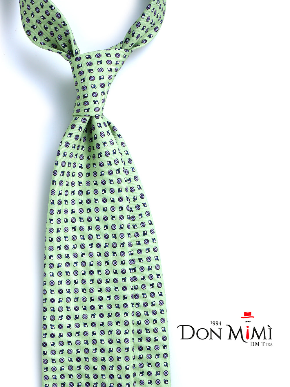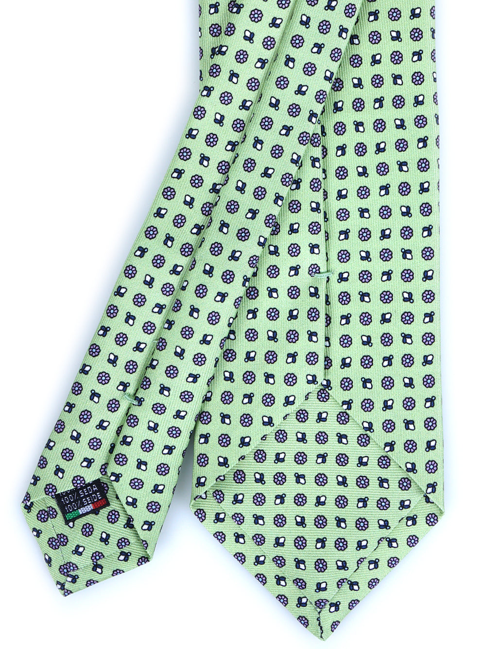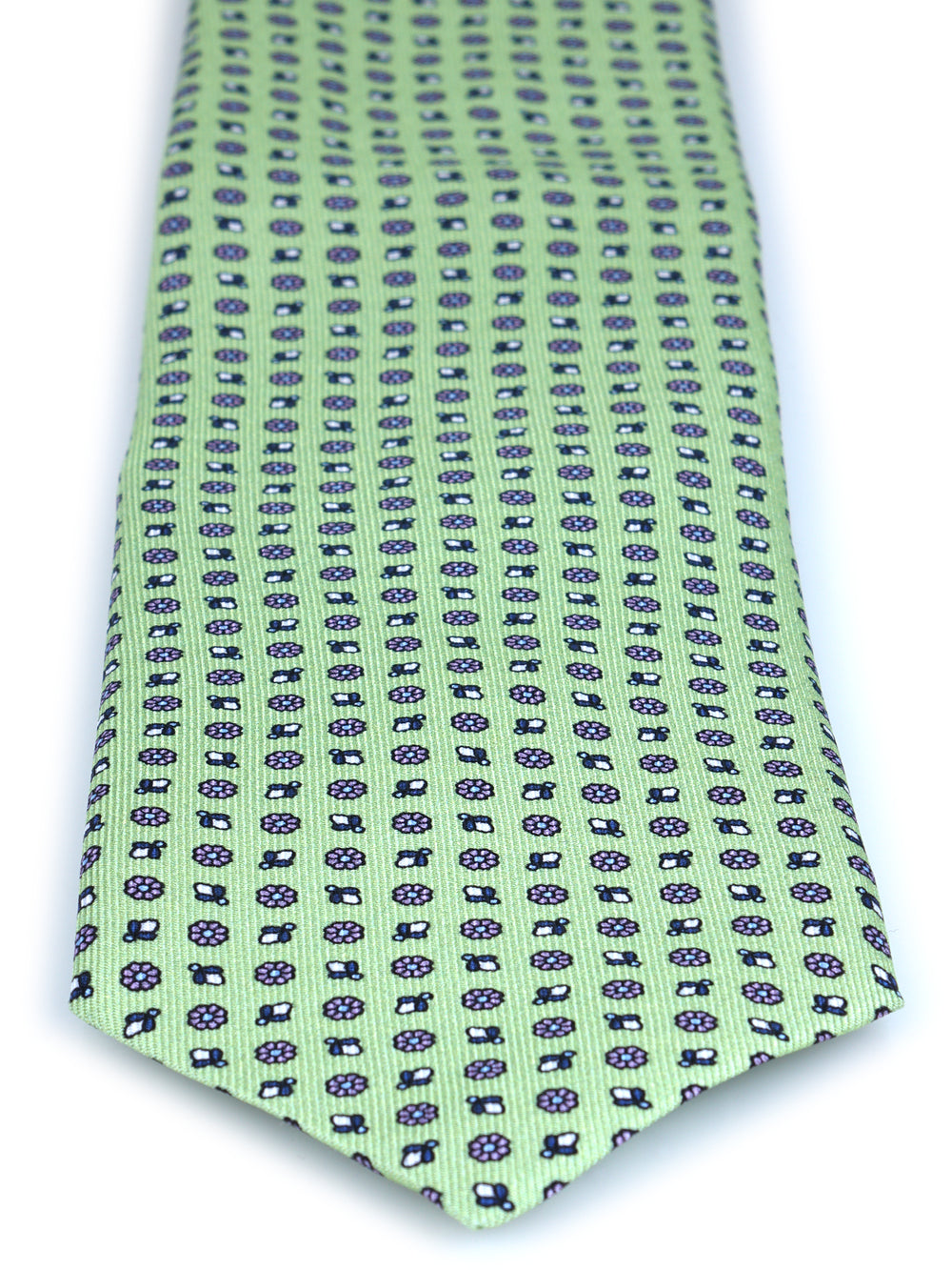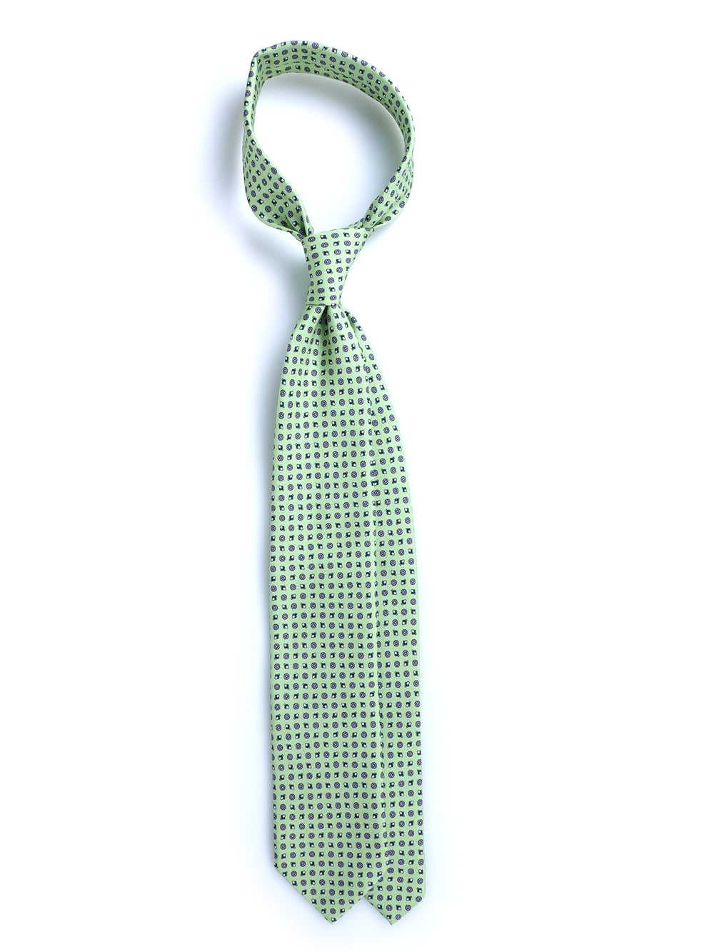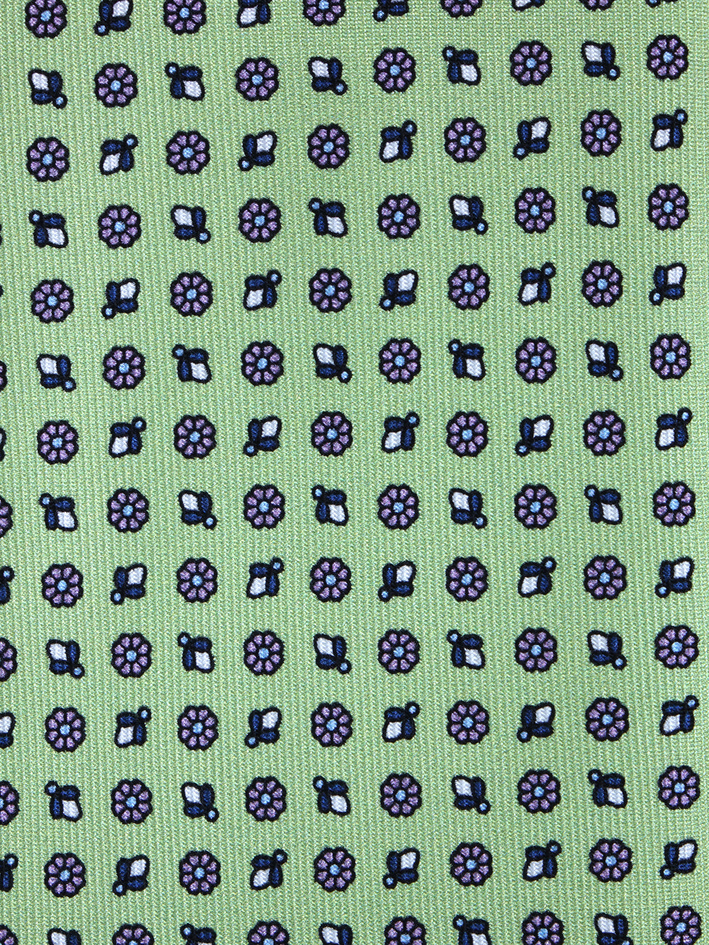Questa cravatta in seta inglese stampata verde chiaro con micro-motivi lilla e blu è l’accessorio perfetto per chi ama distinguersi con gusto ed eleganza. Un connubio tra tradizione sartoriale e stile contemporaneo.