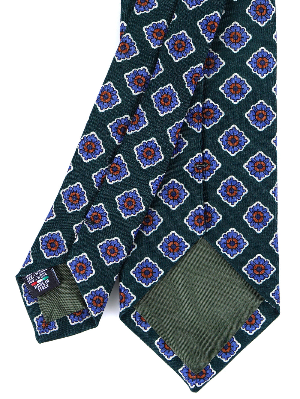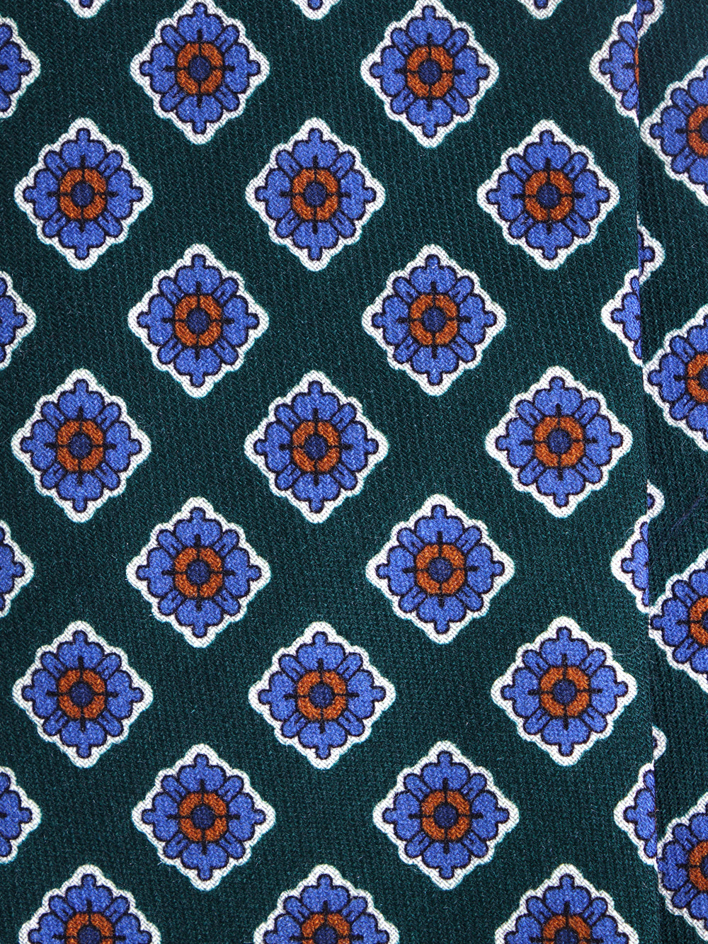 Un'immersione nelle atmosfere esclusive della campagna inglese. Questa cravatta 3 pieghe Don Mimì è realizzata in autentica lana Challis, un tessuto pregiato e raro, amato dagli intenditori per la sua mano vellutata, la leggerezza e la finitura opaca. Il fondo verde foresta, profondo e aristocratico, ospita un raffinato disegno a medaglioni nei toni del blu e del ruggine. È l'accessorio definitivo per l'uomo che predilige un'eleganza colta, fatta di materiali nobili e accostamenti cromatici senza tempo.