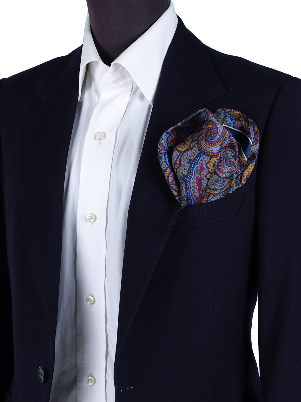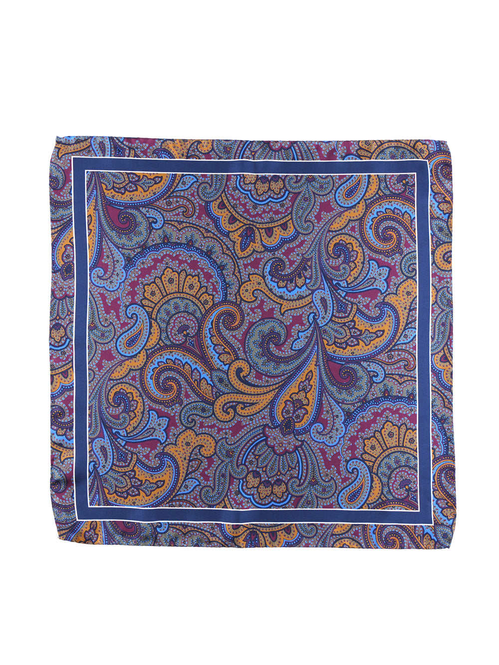 Fondo blu con disegno cashmere grande in giallo, marrone e bianco il tutto con cornice blu