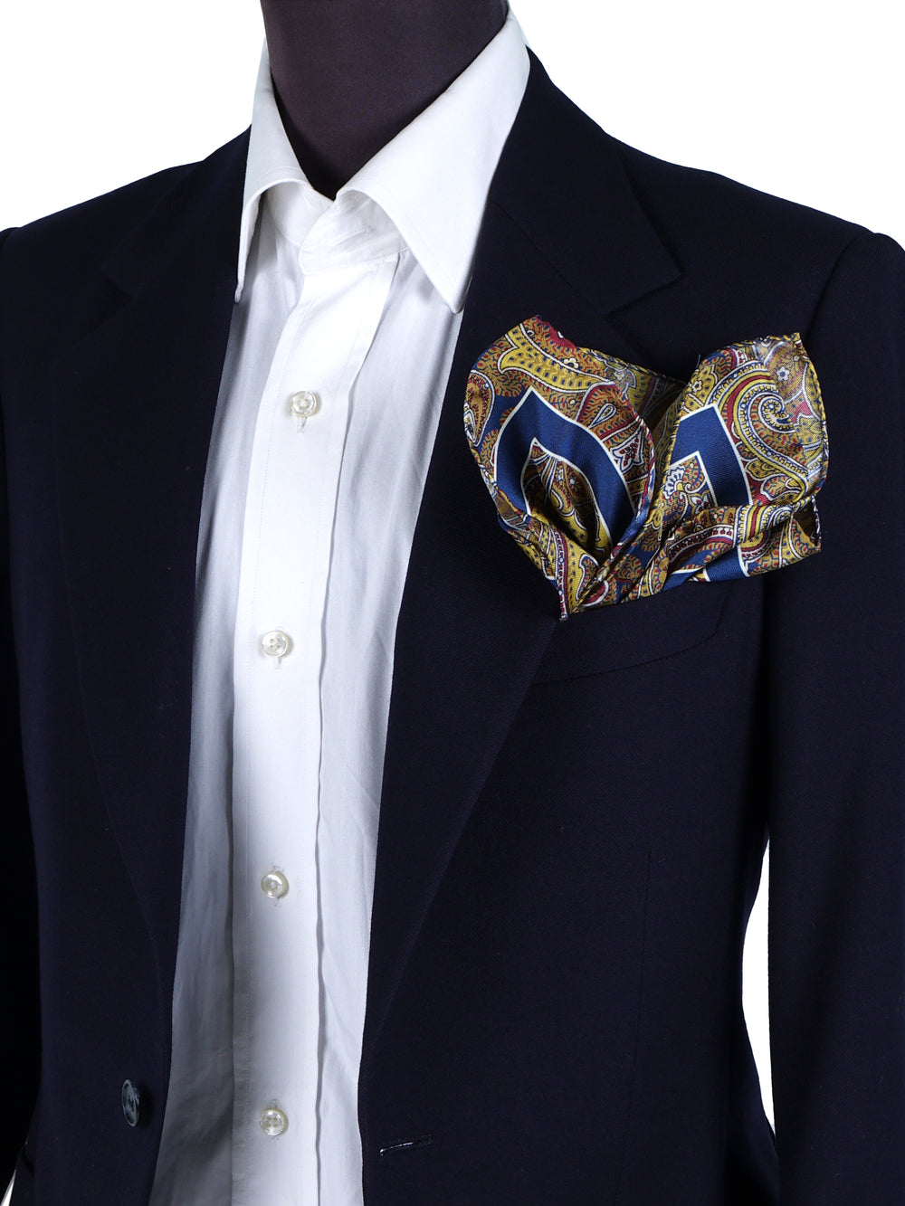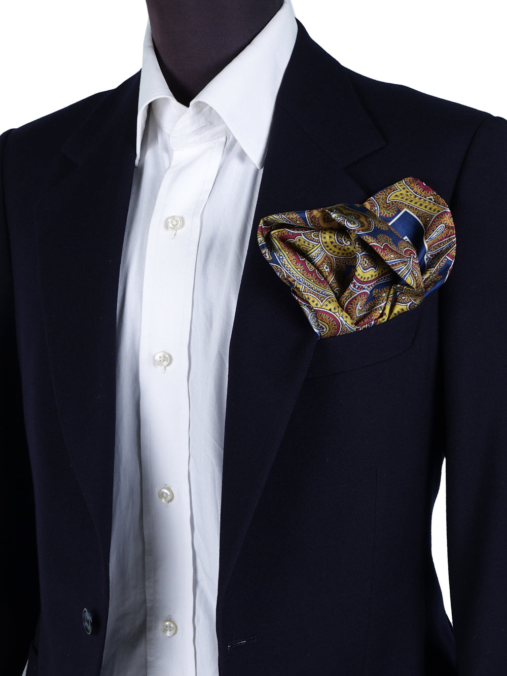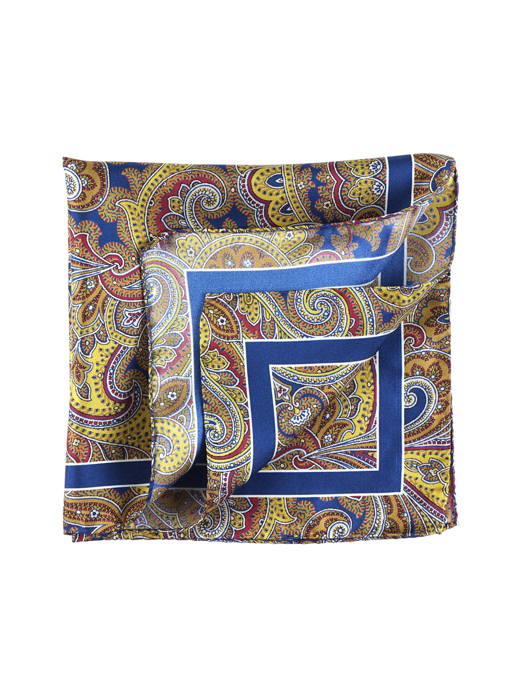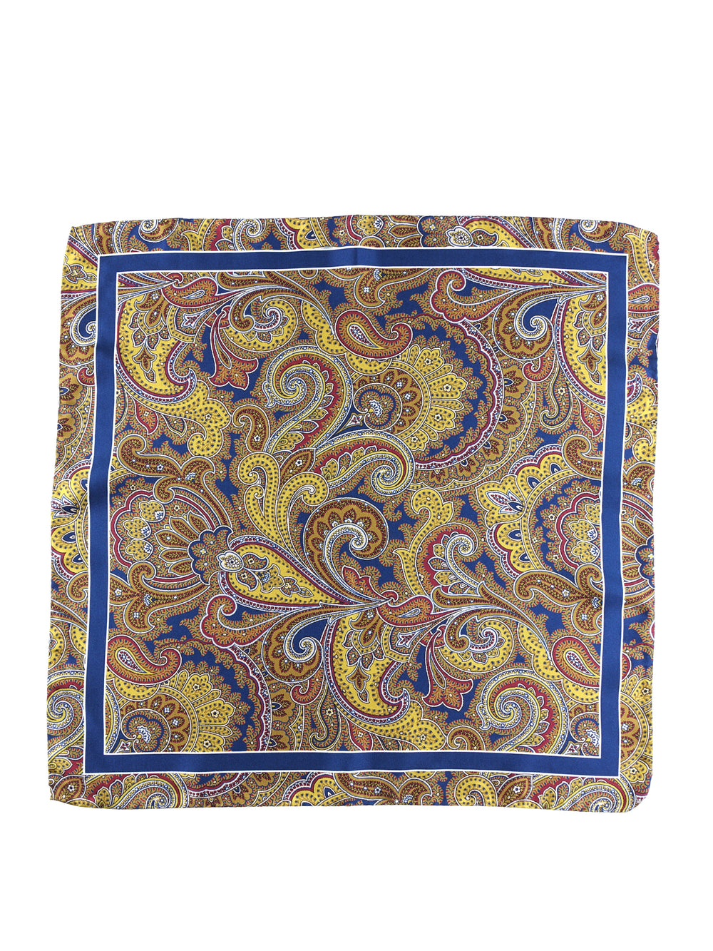 Fondo blu con disegno cashmere grande in giallo, marrone e bianco il tutto con cornice blu
