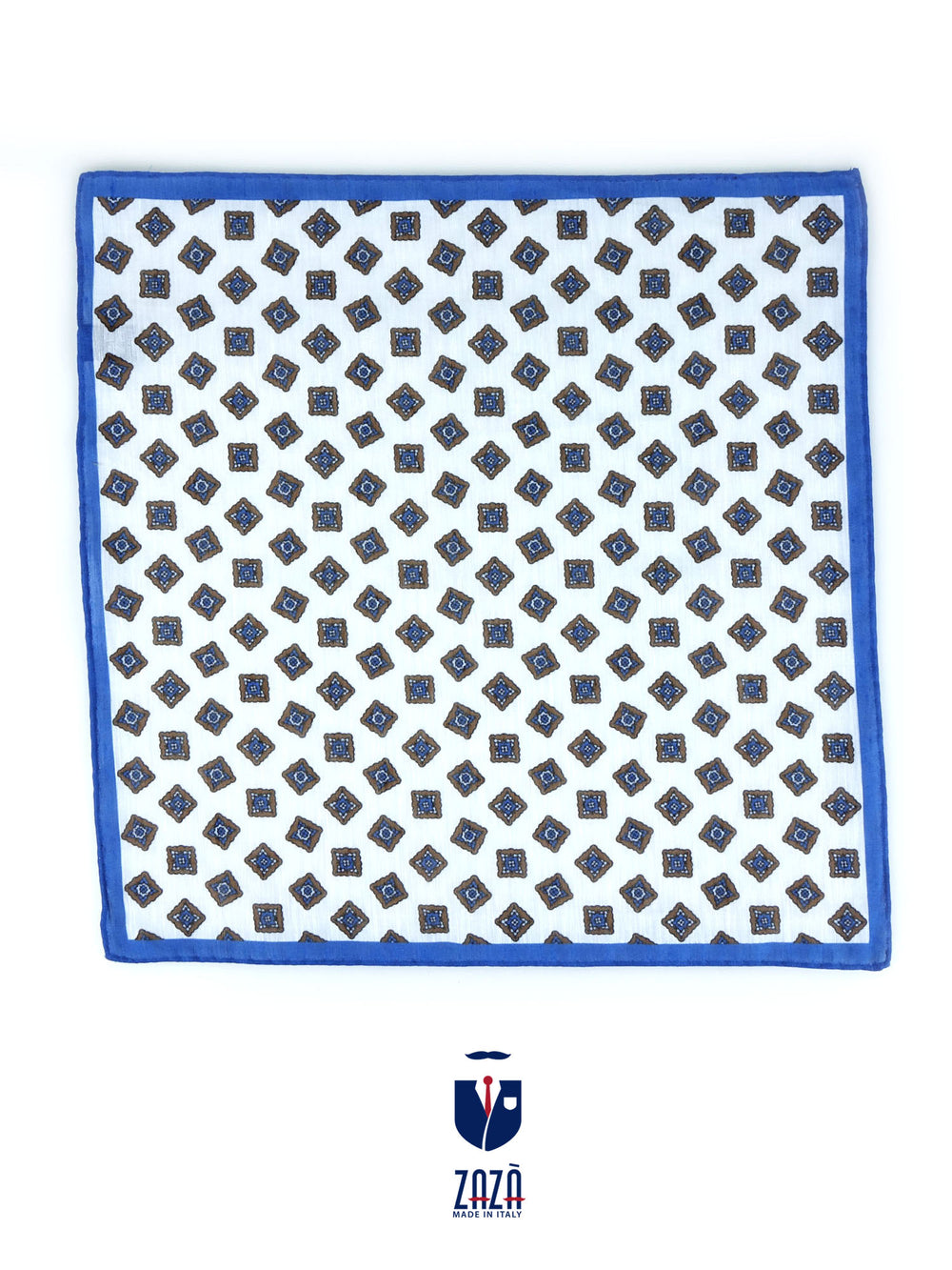 Fondo bianco con quadrati celesti e marroni il tutto in una cornice blu elettrico