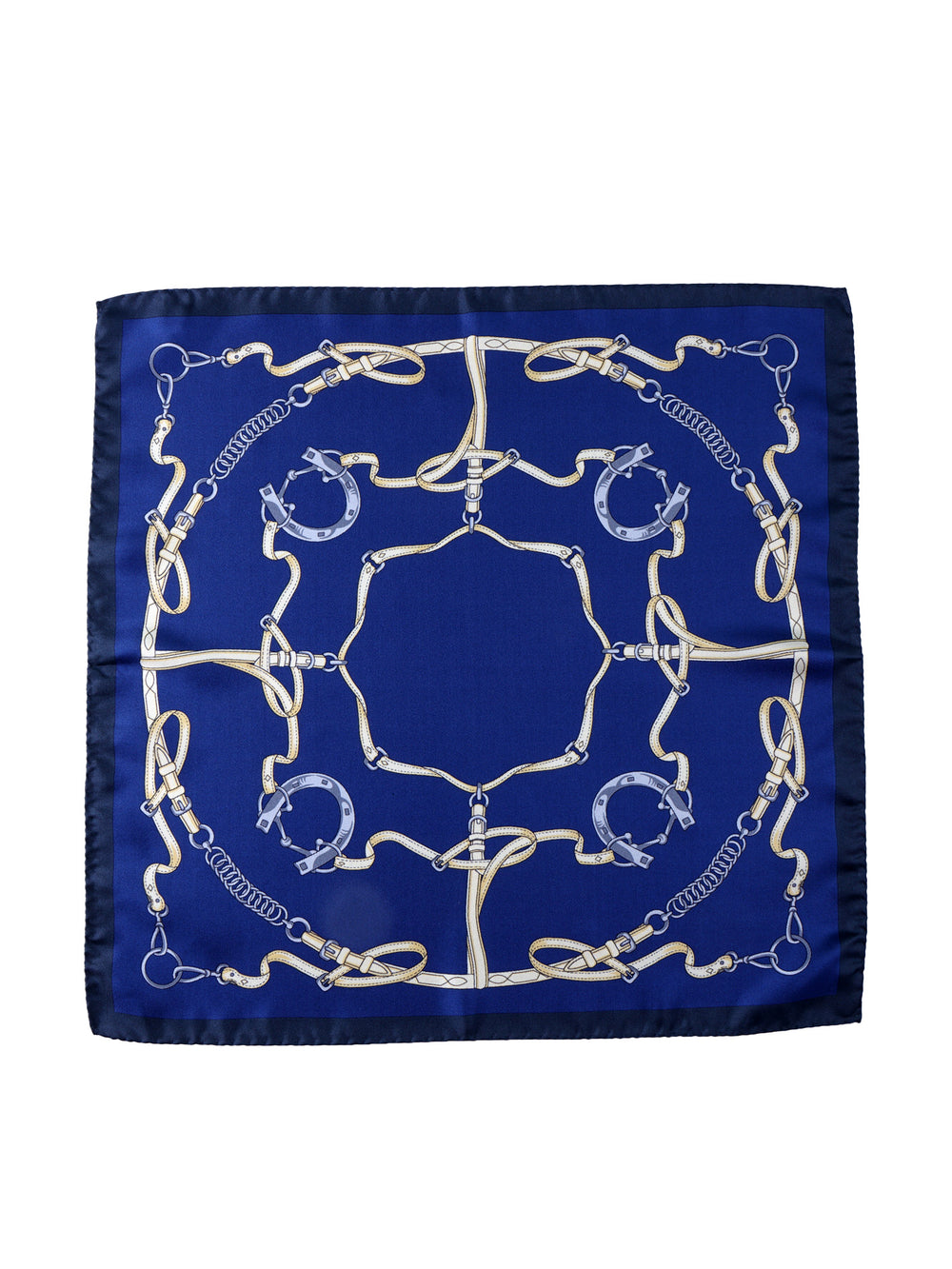 Un accessorio che è una vera e propria dichiarazione di eleganza. Questo fazzoletto da taschino Don Mimì, nelle sue generose dimensioni di 45x45 cm, è realizzato in purissima seta stampata italiana, un tessuto che garantisce una mano lussuosa e la capacità di creare pieghe ricche e scenografiche. La stampa, un omaggio all'arte della selleria, intreccia finimenti e morsi su un vibrante fondo blu royal, incorniciato da un profondo bordo blu navy. È il dettaglio per l'uomo che non lascia nulla al caso e sceglie accessori che raccontano una storia di tradizione e di stile.