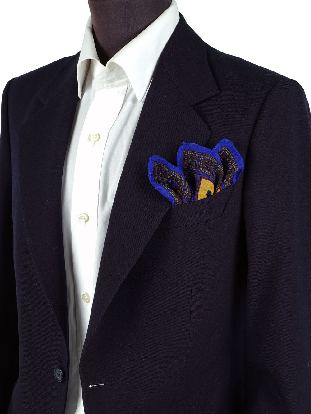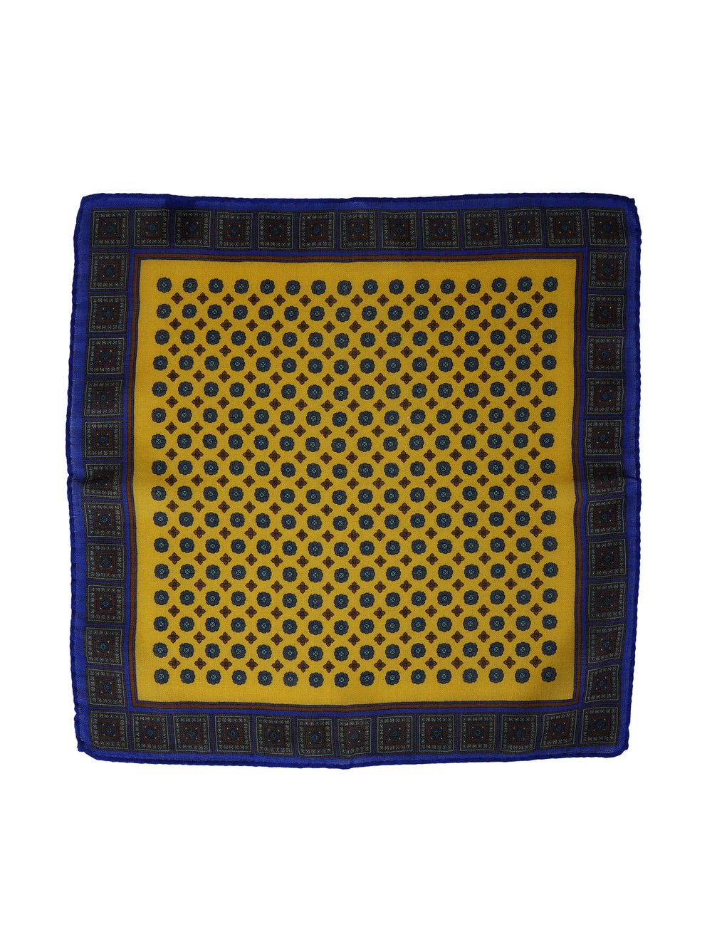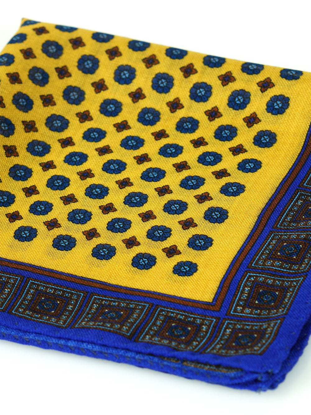 Fondo giallo con fiori in blu e marrone, il tutto in una cornice disegnata in blu elettrico