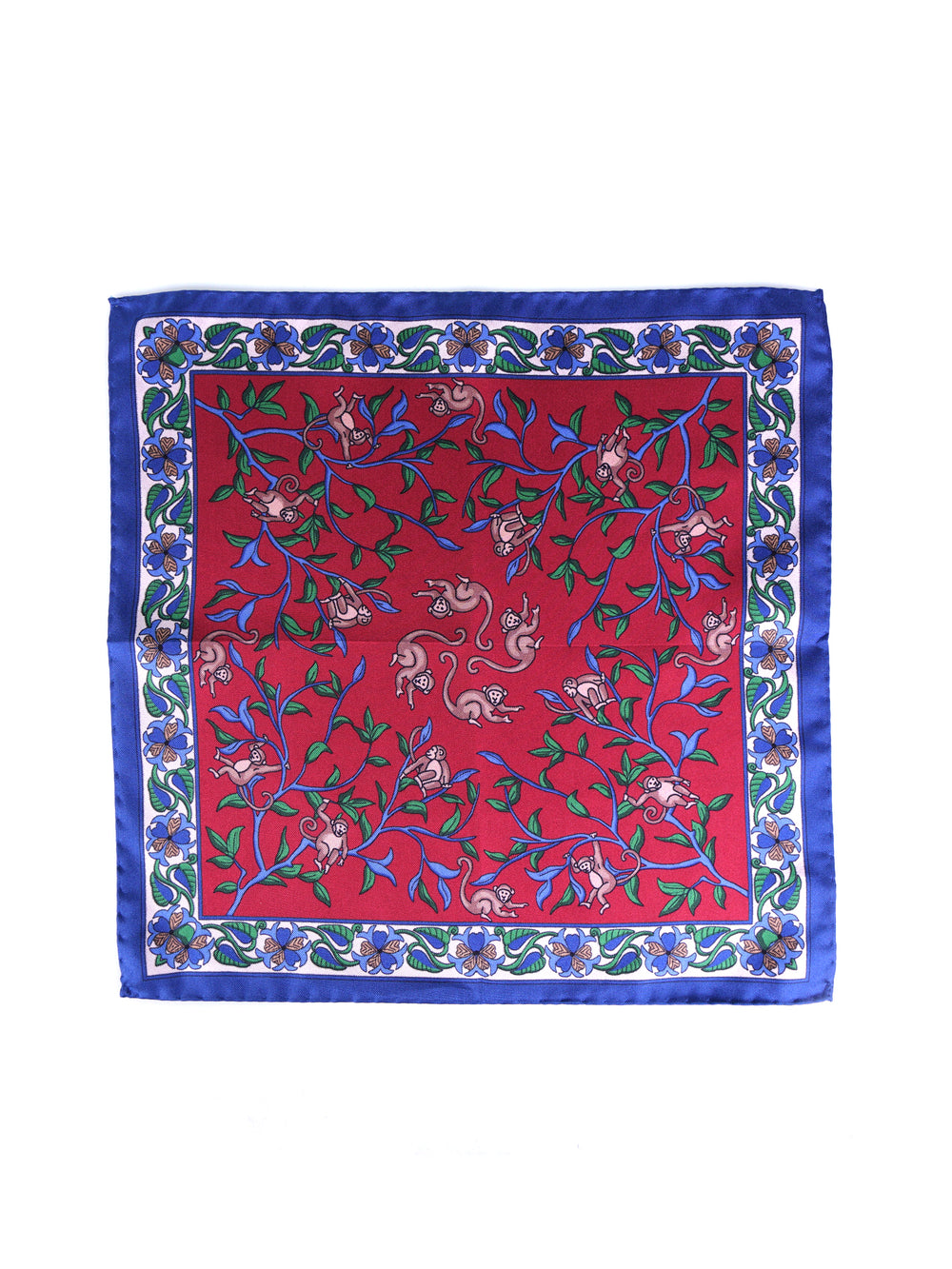 Un accessorio che è un'esplosione di colore e di fantasia, pensato per l'uomo che non teme di osare con stile e raffinatezza. Questo fazzoletto da taschino è realizzato in purissima seta stampata italiana, dalla lucentezza vibrante e dalla mano morbida e scivolosa. Il suo design è un'immersione in una "giungla" stilizzata: simpatiche scimmie si muovono tra liane e fiori esotici, in una palette cromatica audace che unisce un vibrante fondo rosso a toni gioiello come il blu royal e il verde smeraldo. È il pezzo perfetto per l'uomo che usa gli accessori per definire il proprio stile e comunicare la propria personalità.