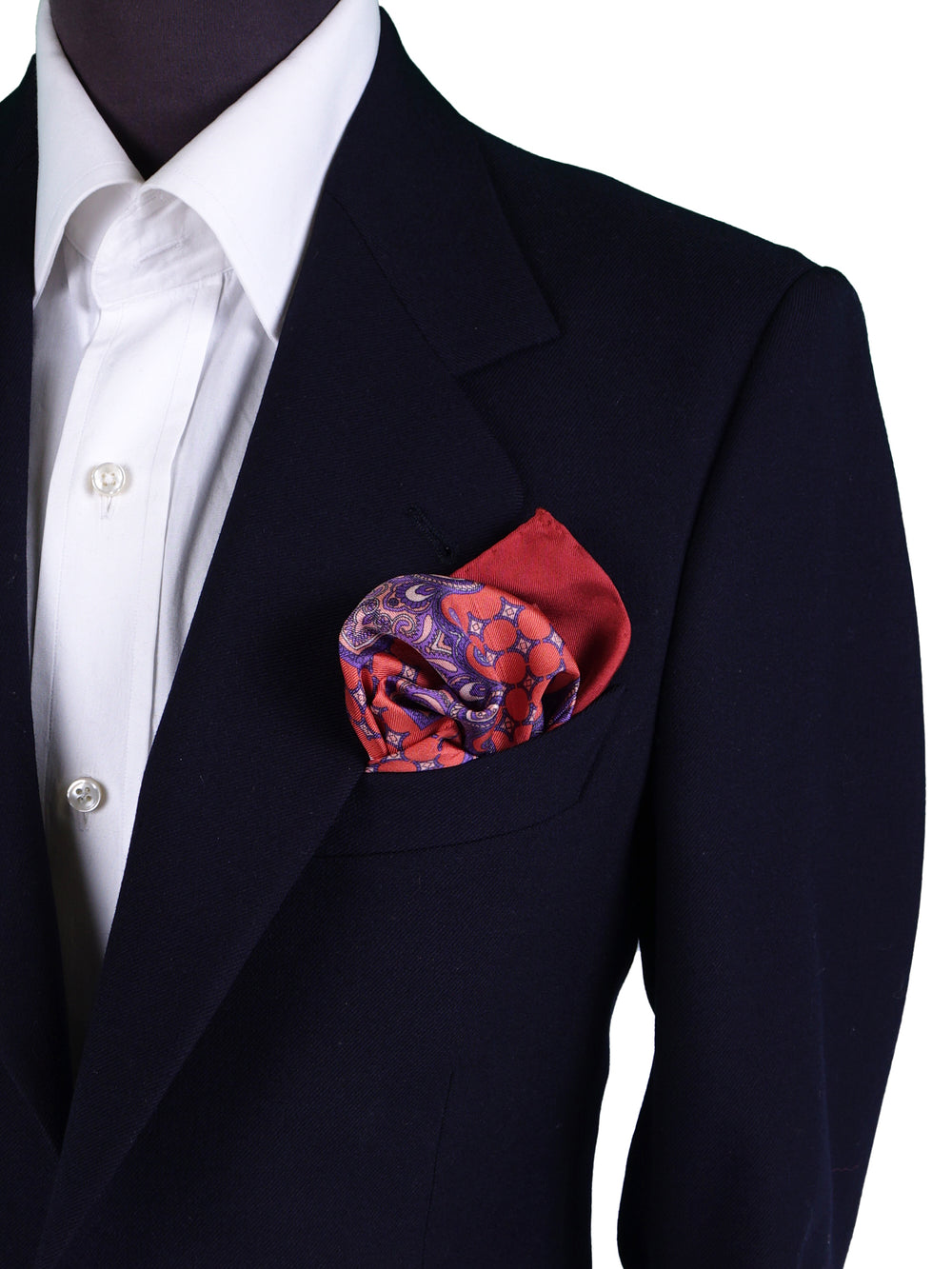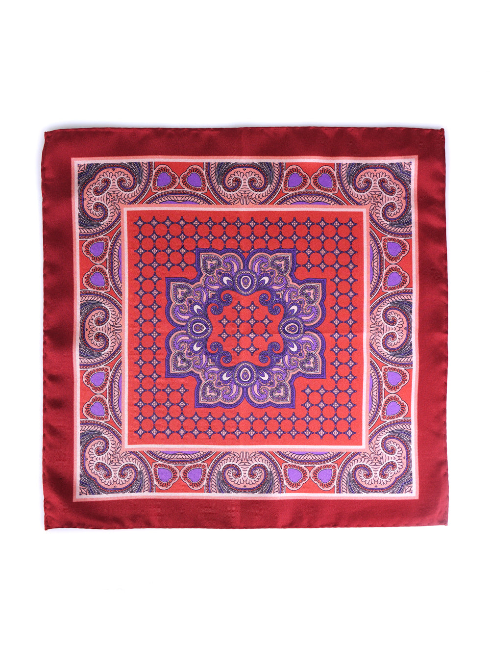 Un accessorio che è un'esplosione di colore e di arte, pensato per l'uomo che non teme di osare con stile e raffinatezza. Questo fazzoletto da taschino è realizzato in purissima seta stampata italiana, dalla lucentezza vibrante e dalla mano morbida e scivolosa. Il suo design è un'interpretazione sontuosa dell'iconico motivo Cachemire (Paisley), in una palette cromatica audace che unisce toni gioiello come il rosso, il viola, il blu e il rosa. Il tutto è incorniciato da un caldo bordo color ruggine. È il pezzo perfetto per l'uomo che usa gli accessori per definire il proprio stile e comunicare la propria personalità.