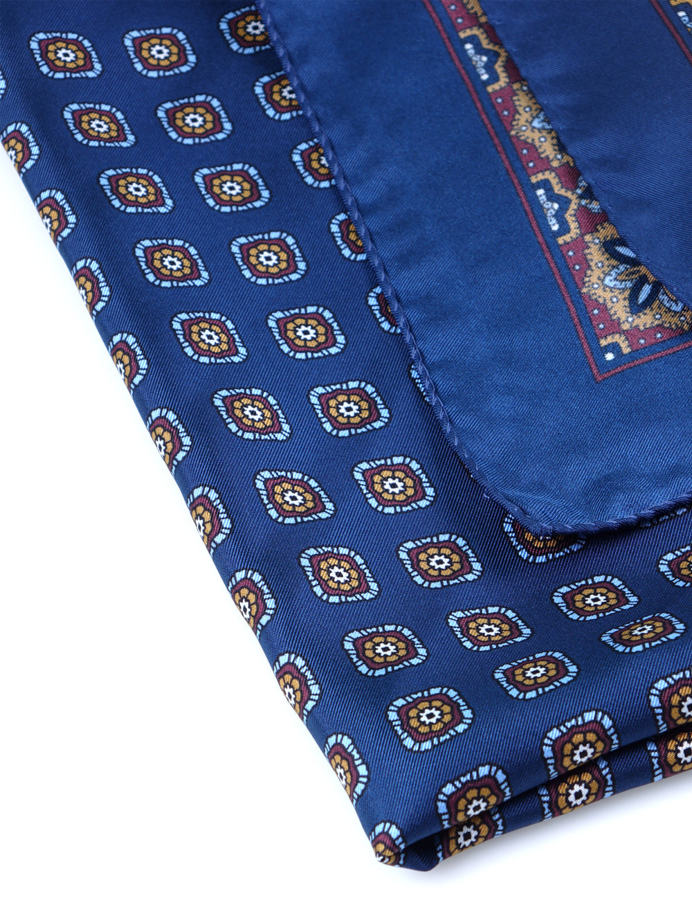 Un accessorio che segna il passaggio da un'eleganza ordinaria a uno stile da vero conoscitore. Questo foulard da uomo è realizzato in purissima seta stampata italiana, un tessuto dal drappeggio impeccabile e dalla mano lussuosa. Il suo design è un capolavoro di equilibrio: un raffinato micro-motivo geometrico centrale è incorniciato da una ricca bordatura a contrasto, che gioca sui toni caldi dell'ocra e del bordeaux. La sua dimensione generosa lo rende perfetto per essere indossato al collo, sostituendo la cravatta con un tocco di classe e personalità unici.