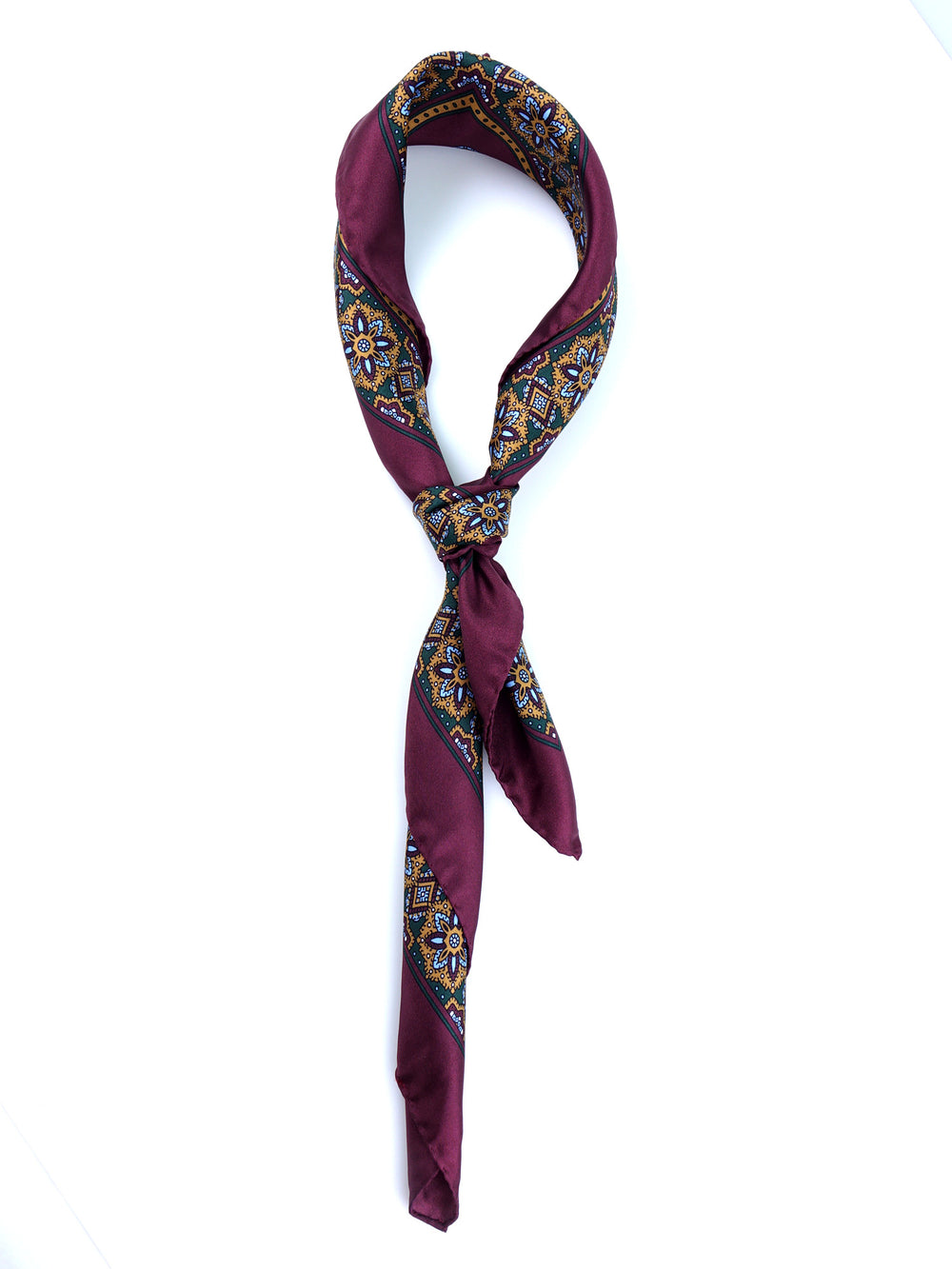 Un accessorio che evoca un'eleganza classica e opulenta, perfetto per chi ama i dettagli che raccontano una storia. Questo foulard è realizzato in purissima seta italiana, un tessuto dal drappeggio impeccabile e dalla mano lussuosa. Il suo design è un capolavoro di equilibrio: un raffinato micro-motivo geometrico centrale su un fondo bordeaux profondo è incorniciato da una ricca bordatura a contrasto, che gioca sui toni dell'ocra, del blu e del verde. Un pezzo iconico che trascende il genere, perfetto per definire il proprio stile con un tocco di classe.