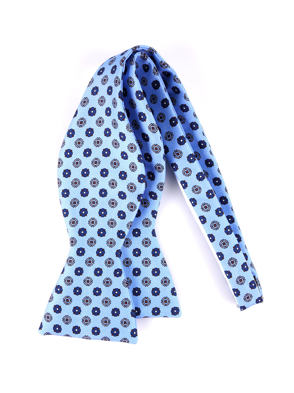 L'eleganza non urla mai, sussurra. Il papillon da annodare "Berry" di Don Mimì è l'quintessenza del gusto sartoriale classico, dedicato all'uomo che conosce il valore della tradizione. Realizzato in pura seta stampata, presenta un fondo celeste luminoso arricchito da un microdisegno geometrico nei toni del blu, marrone e bianco. Un accessorio di prestigio che conferisce un'aria intellettuale e raffinata, perfetto per chi desidera distinguersi con classe intramontabile e rigore stilistico.