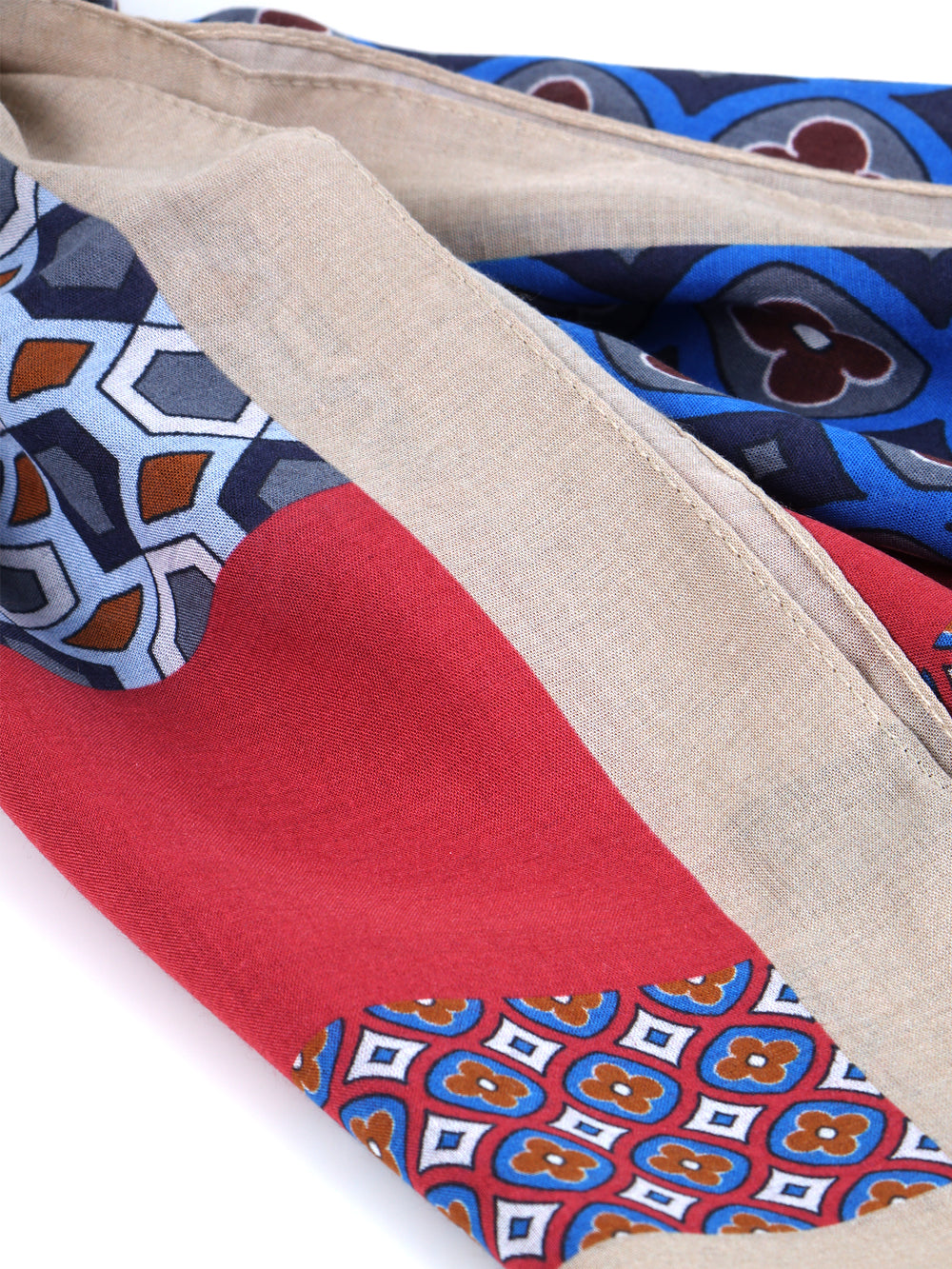 Sciarpa con fascia beige disegno a fantasia con fiori ed esagoni di colore grigio, celeste, blu e beige