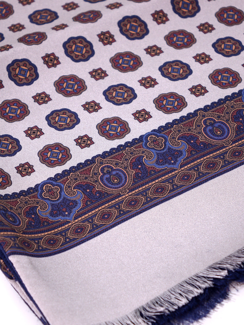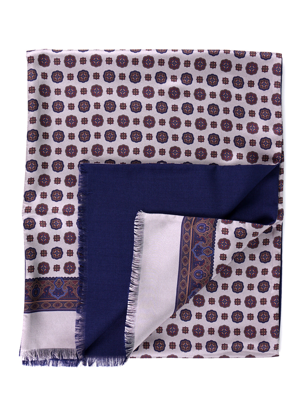 Un accessorio che incarna l'essenza del prestigio maschile, pensato per l'uomo che non scende a compromessi tra estetica e funzionalità. Questa sciarpa "doppiata" firmata Don Mimì rappresenta il perfetto connubio tra due nobili fibre naturali: la seta stampata esterna, con il suo motivo geometrico raffinato su fondo grigio, conferisce luce e distinzione, mentre l'interno in pura lana garantisce un isolamento termico superiore e un comfort avvolgente. Un capo intramontabile, capace di elevare il rigore dei mesi invernali con un tocco di classe discreta ma inequivocabile.