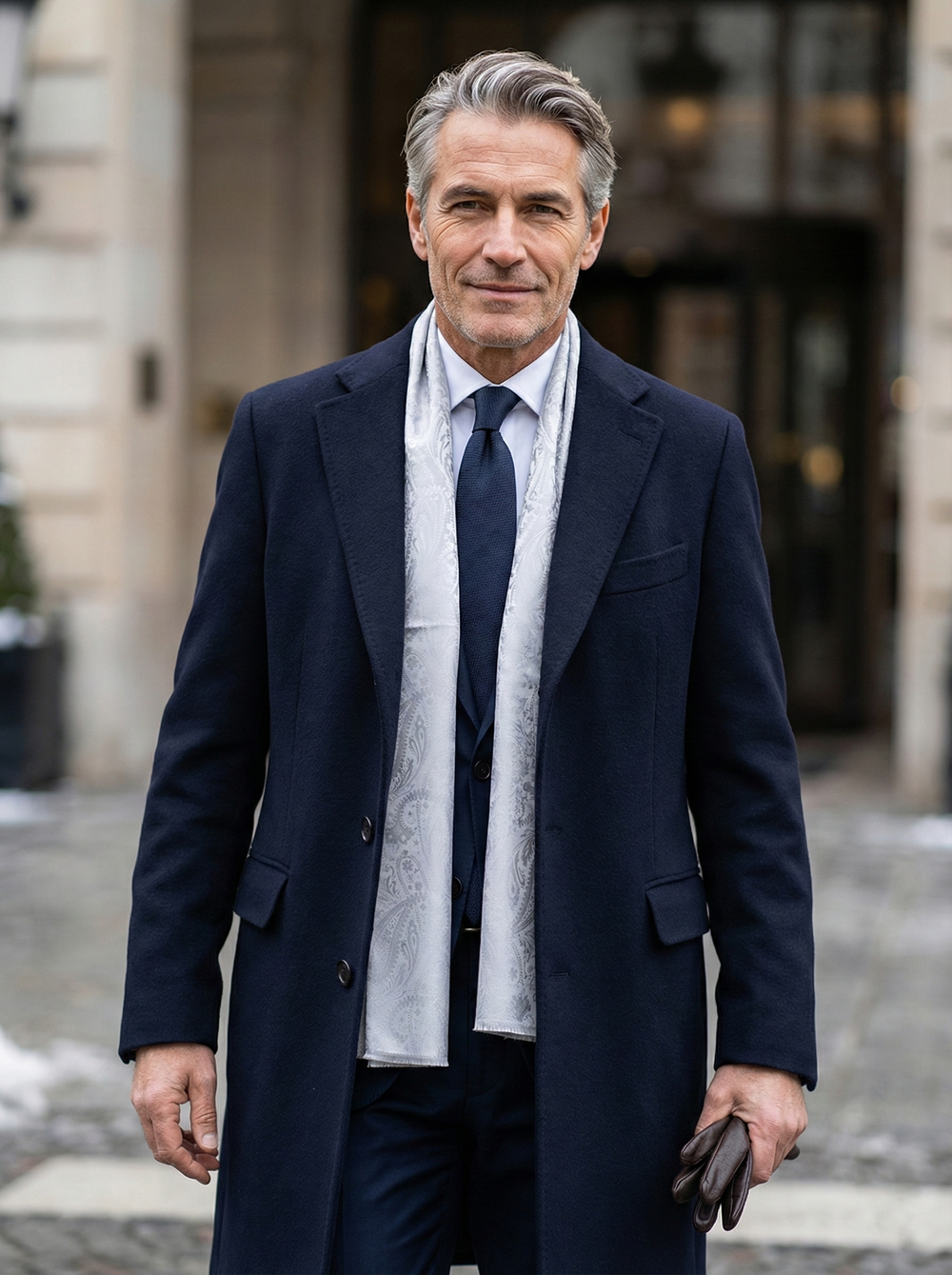 Tailor's tip: This isn't a scarf to wrap up for warmth, but rather a decorative accessory ("drape"). Given its 16 cm width and the preciousness of the silk, it shouldn't be tied tightly. It's worn "draped," resting behind the neck and falling parallel to the lapels of a jacket or coat, or with a single, loose drape over the chest.