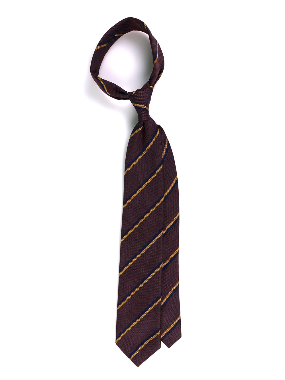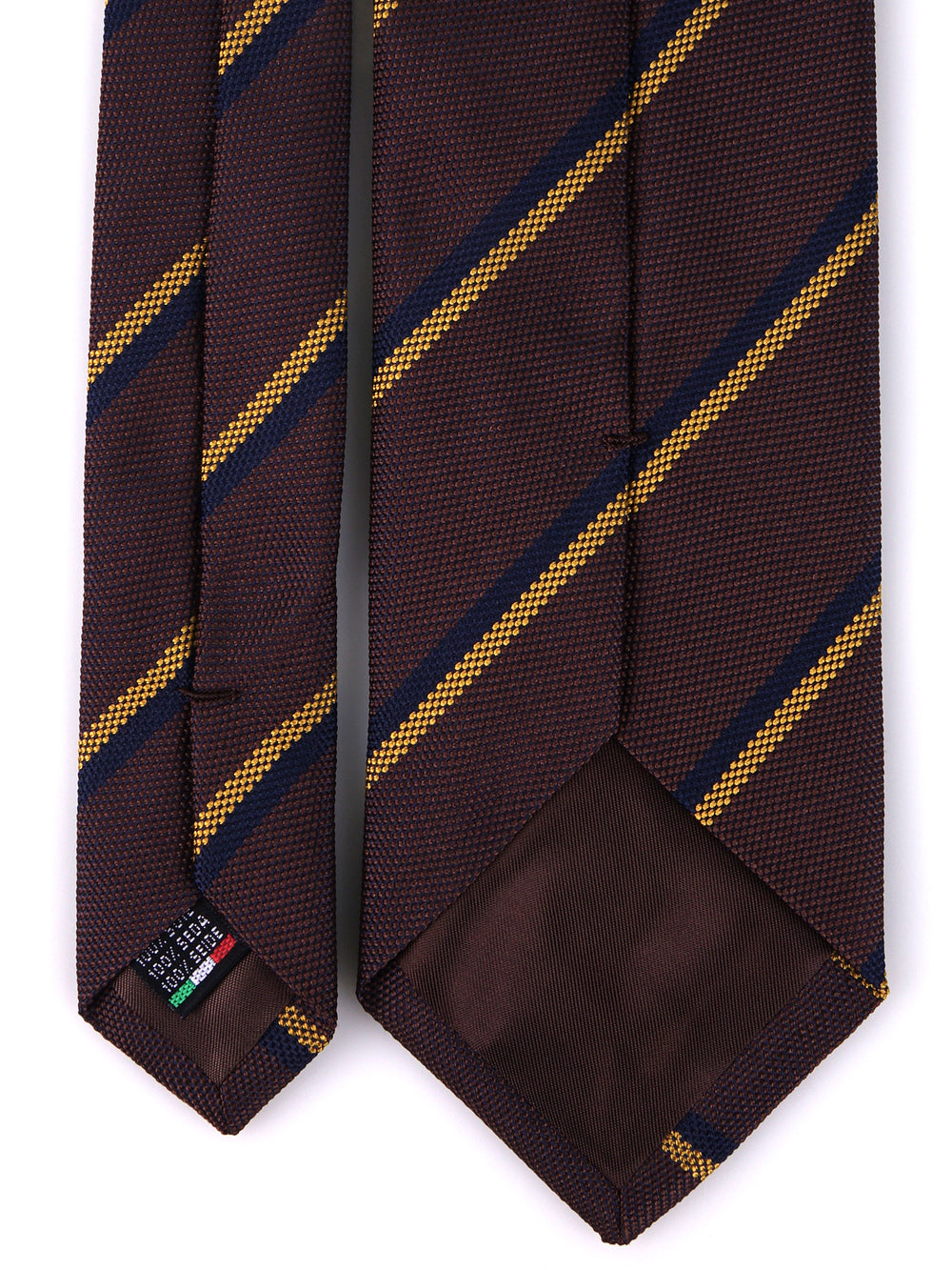 Un vero e proprio statement di stile per l'uomo moderno che non ha paura di farsi notare. Questa cravatta Zazà a tre pieghe in pura seta jacquard è l'accessorio perfetto per esprimere personalità e grinta. Il fondo marrone si accende grazie al dinamismo del pattern regimental con vivaci righe gialle e blu, creando un contrasto magnetico. Il dettaglio perfetto per accompagnarti in ogni avventura metropolitana, trasformando un outfit basico nel trend assoluto della tua giornata, dall'ufficio fino a serata inoltrata.