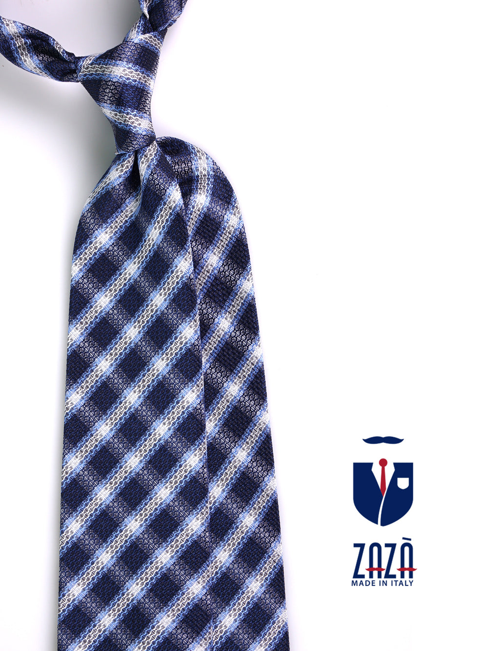 Grinta, texture e luminosità: questa cravatta Zazà è la sintesi dell'eleganza dinamica moderna. La lavorazione "Prismato" della seta jacquard trasforma il classico motivo regimental in un'esperienza visiva tridimensionale, catturando la luce naturale della bella stagione. Il fondo blu profondo, attraversato da righe bianche, grigie e "blu sky", crea un gioco cromatico fresco e deciso, perfetto per l'uomo che vuole distinguersi con personalità tra un meeting importante e un viaggio di piacere.