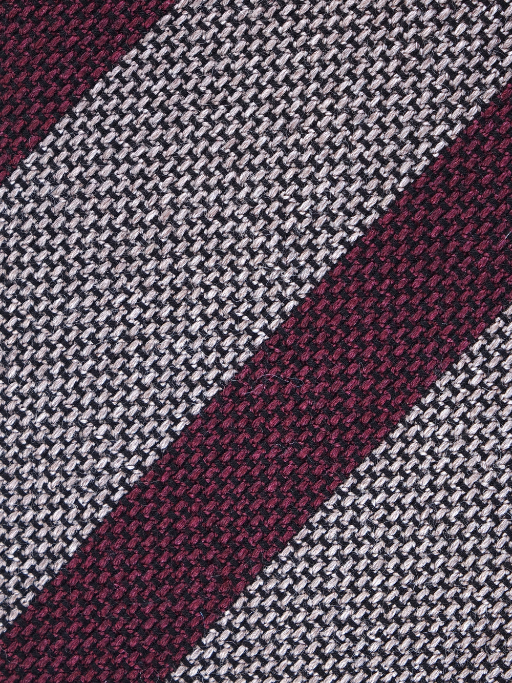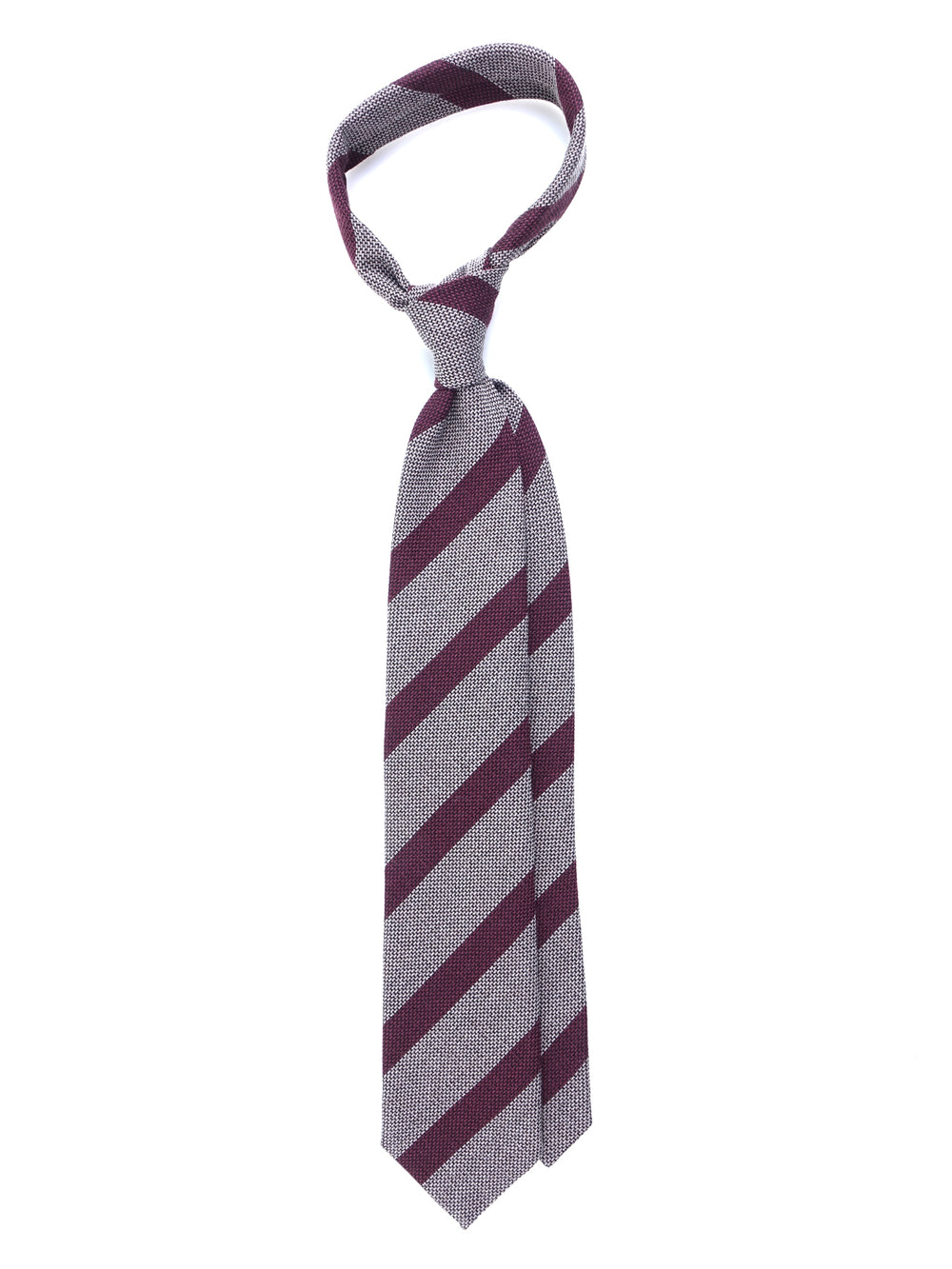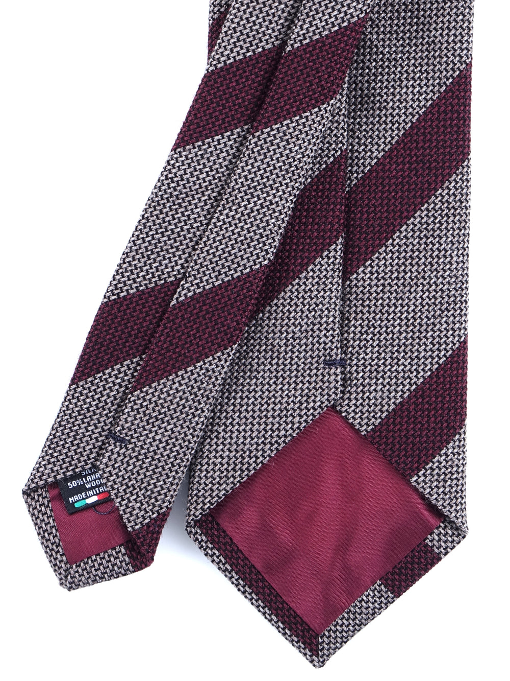 Questa cravatta è un pilastro della collezione Autunno/Inverno, un accessorio che celebra la ricchezza dei tessuti nobili. Realizzata in una pregiata miscela paritaria di lana e seta, possiede il calore e la texture opaca della prima uniti alla lucentezza e fluidità della seconda. Il classico disegno Regimental, che alterna un ricco bordeaux a un luminoso grigio perla, acquista una profondità ineguagliabile grazie a questa lavorazione. È la firma dell'uomo ZAZÀ: elegante, colto e mai banale.