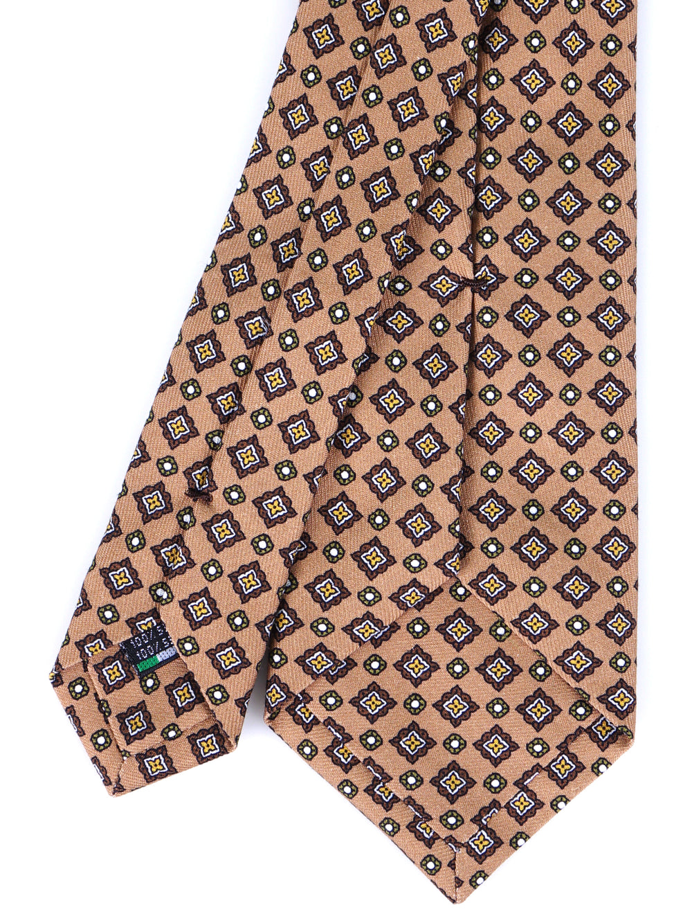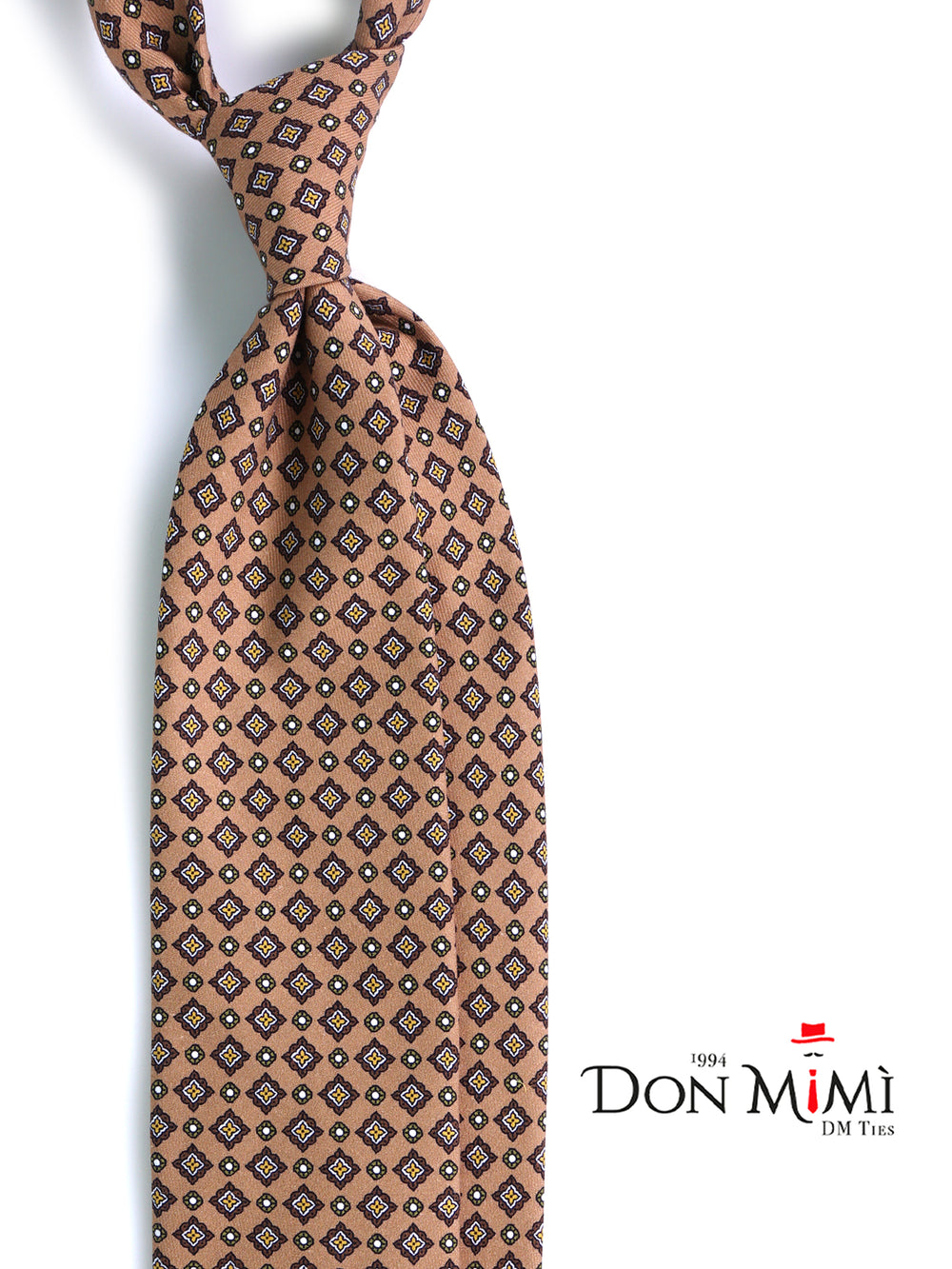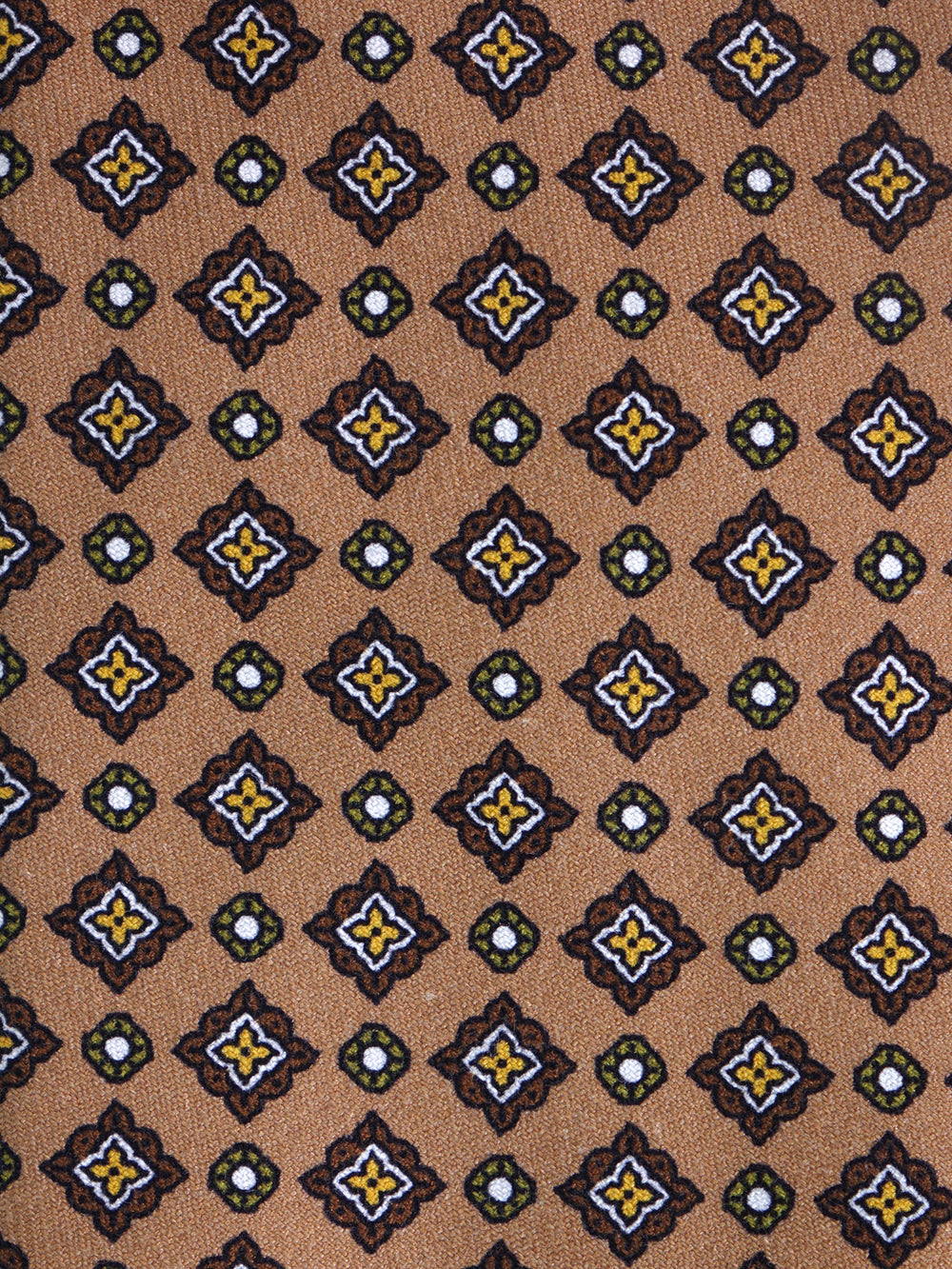 Questa cravatta è un pezzo per veri intenditori, un tributo a una tradizione quasi perduta. È realizzata in Seta Madder, un tessuto leggendario ottenuto attraverso un antico processo di stampa che conferisce alla seta una mano inconfondibile: gessosa, polverosa, quasi simile al cashmere al tatto, con colori profondi ma meravigliosamente opachi. Questa finitura unica, unita alle calde cromie autunnali del cammello, del marrone e del giallo ocra, rende la cravatta un accessorio dall'eleganza colta e sussurrata, firmato con l'eccellenza sartoriale Don Mimì.