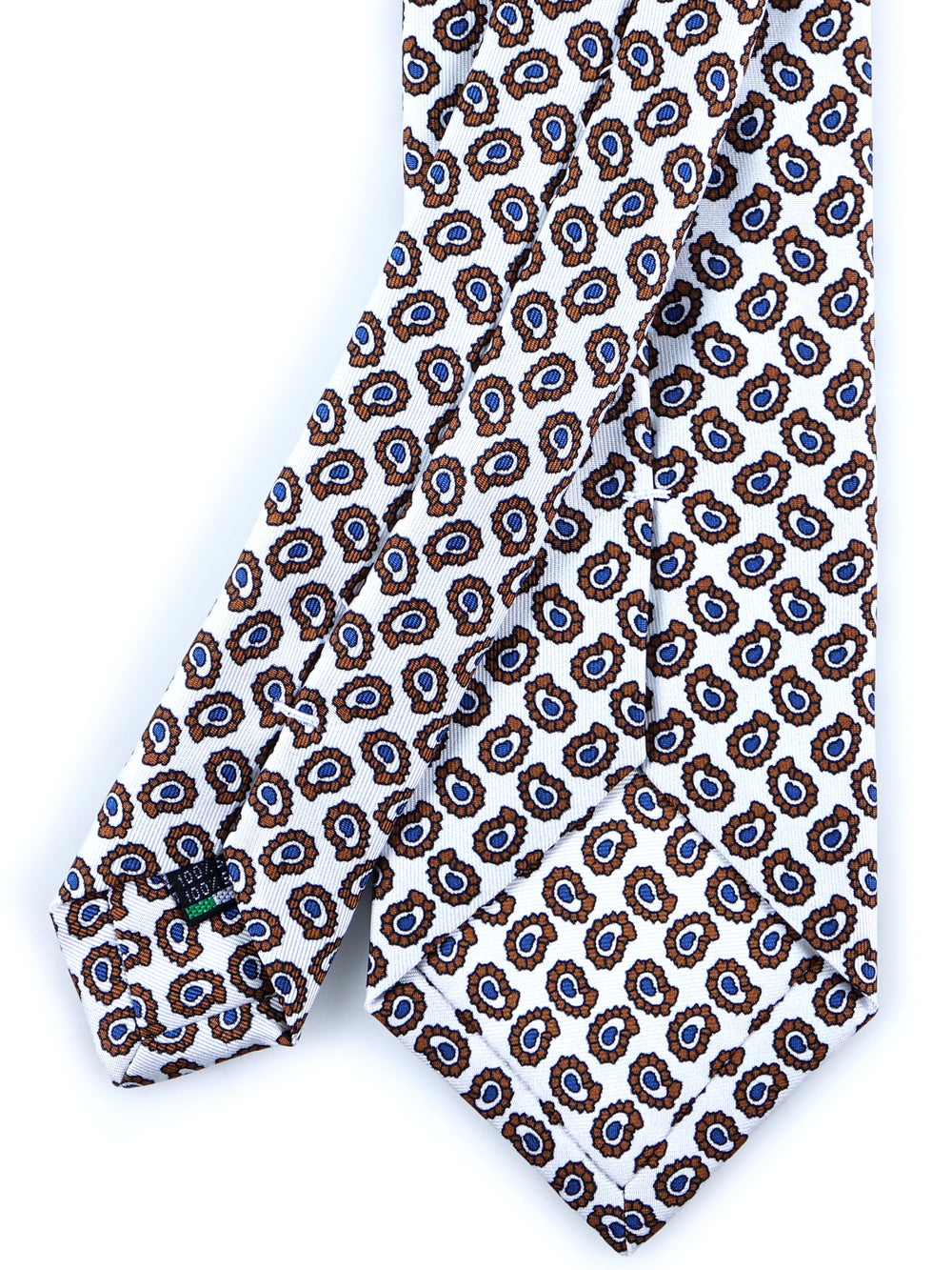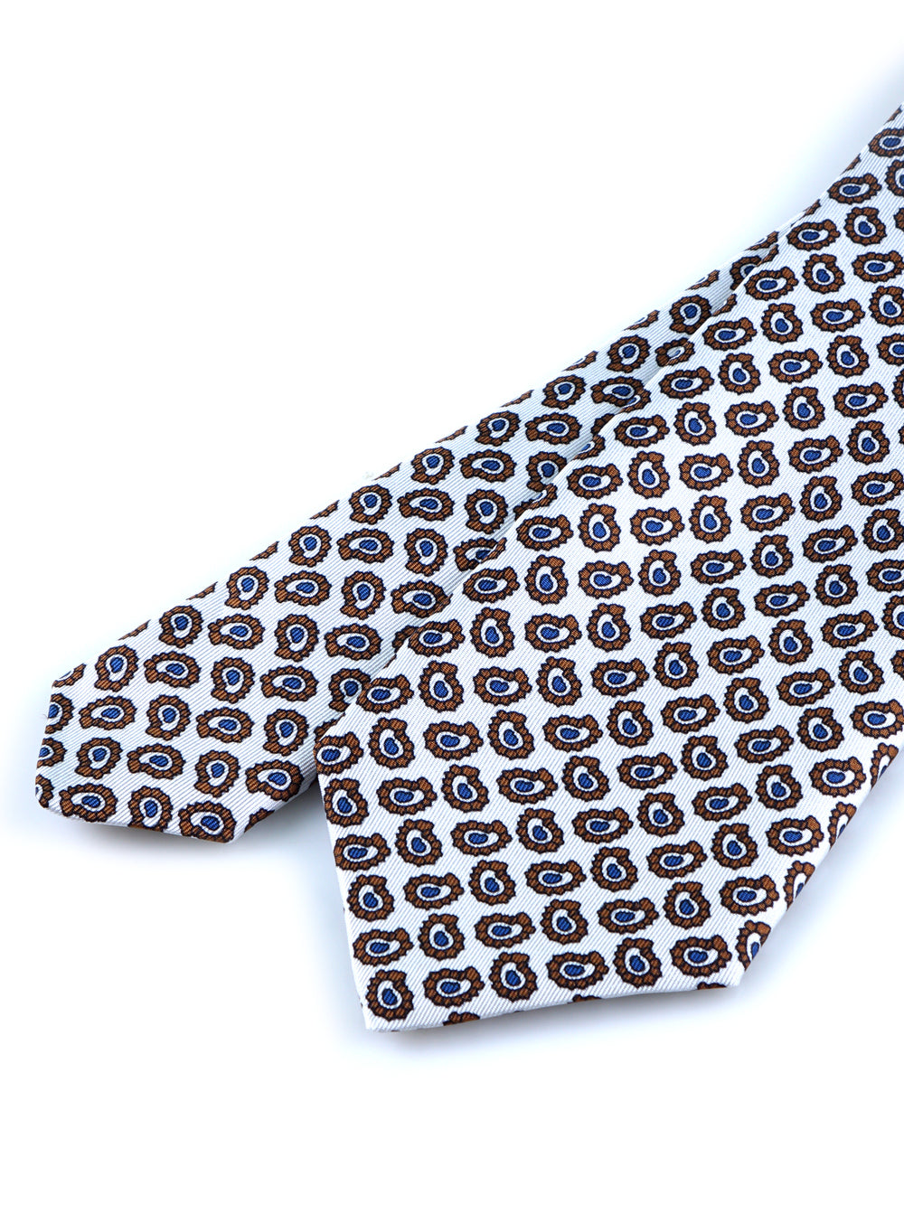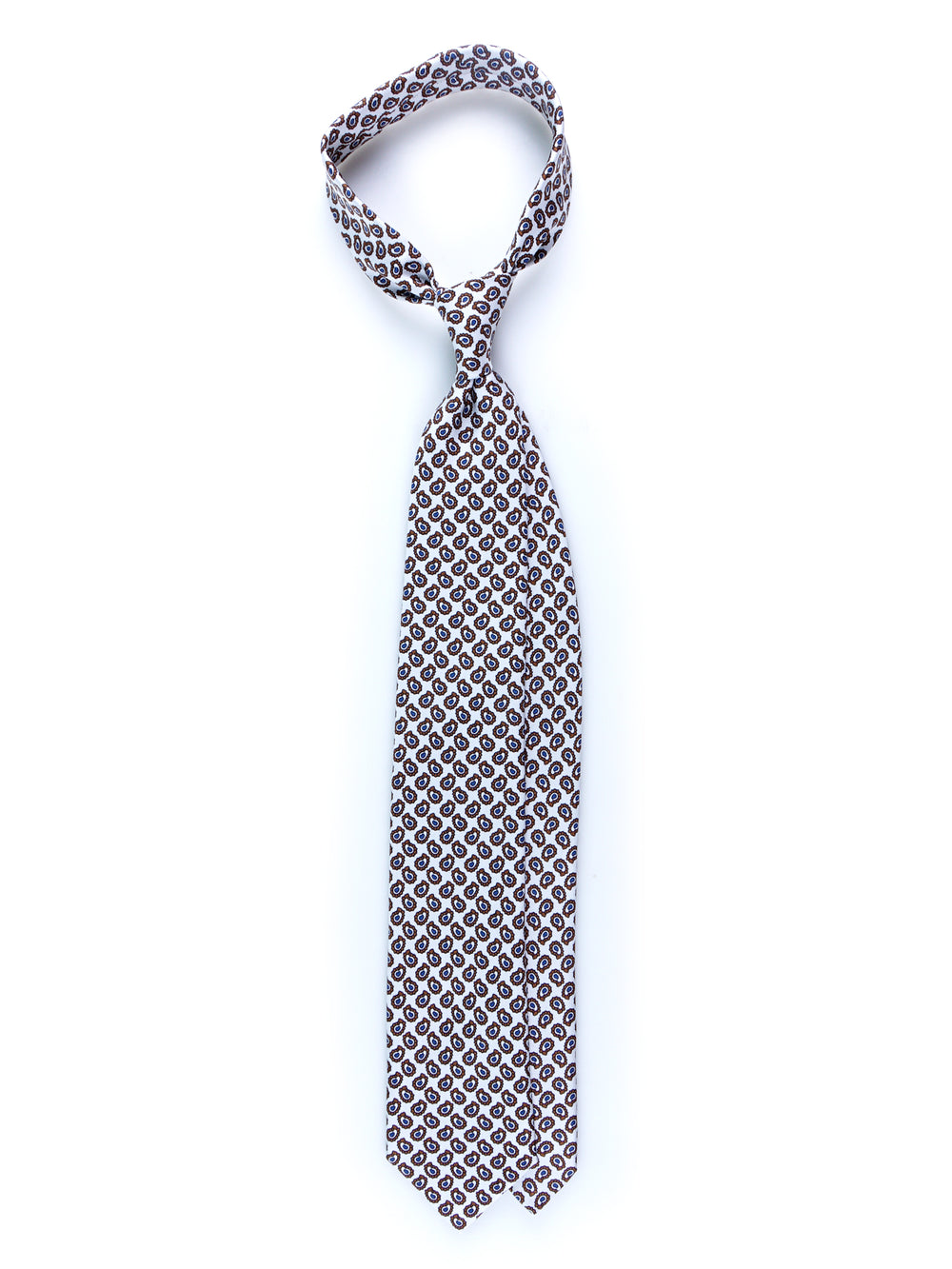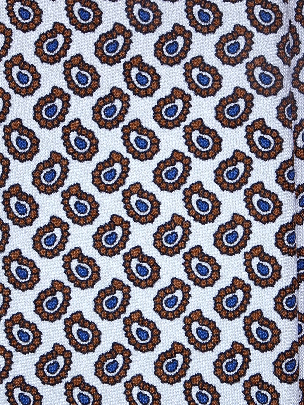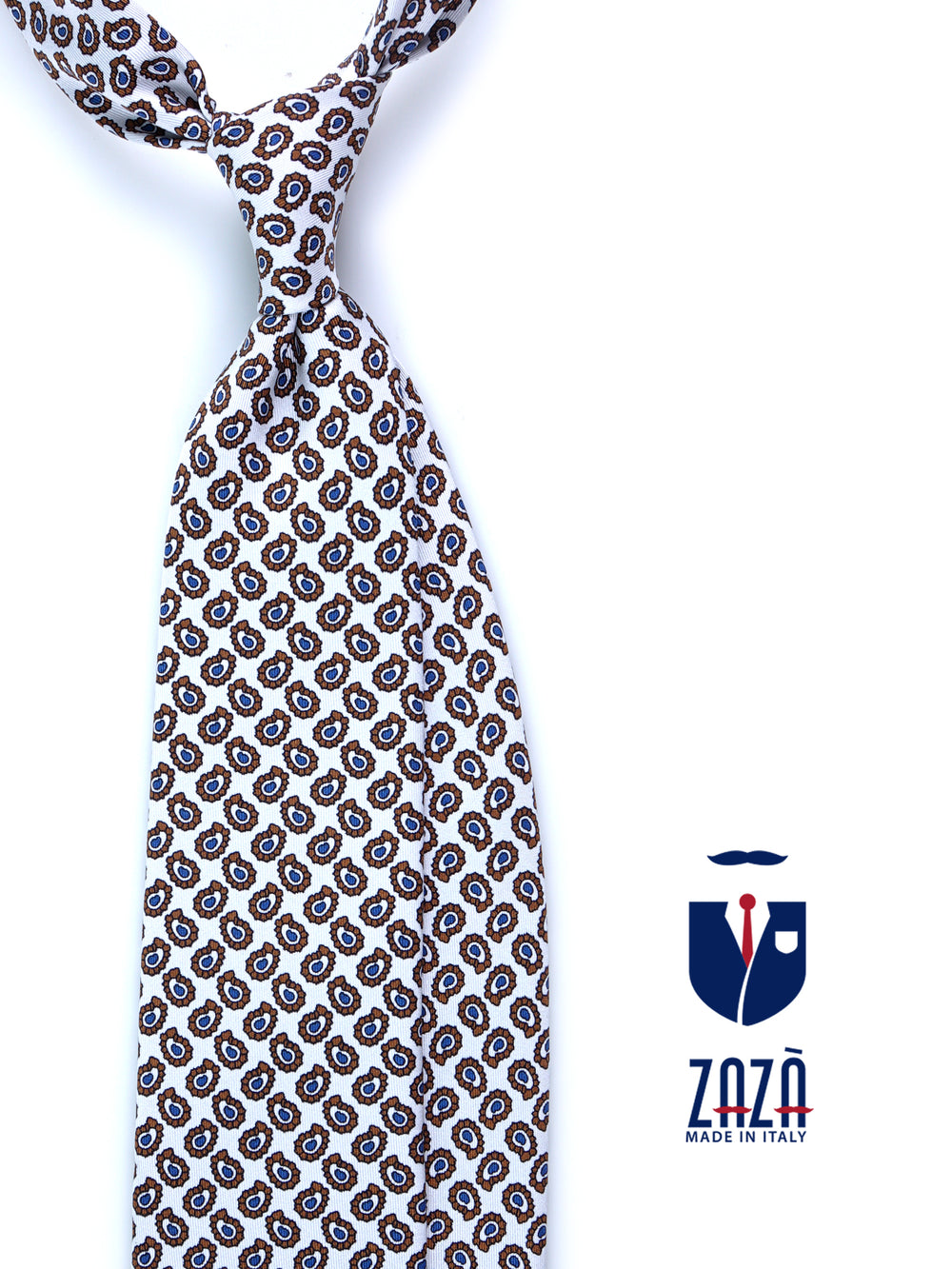 Questa cravatta è un manifesto dello stile ZAZÀ: un'eleganza radicata nella tradizione artigianale italiana, ma con un'anima fresca e contemporanea. Su un fondo luminoso color panna, fiorisce una raffinata fantasia che celebra l'abbinamento iconico tra il marrone caldo e il blu vibrante. Realizzata in una preziosa saia di seta, è un "falso unito" di una versatilità straordinaria, capace di accompagnare l'uomo di stile dall'ufficio alla cerimonia estiva.