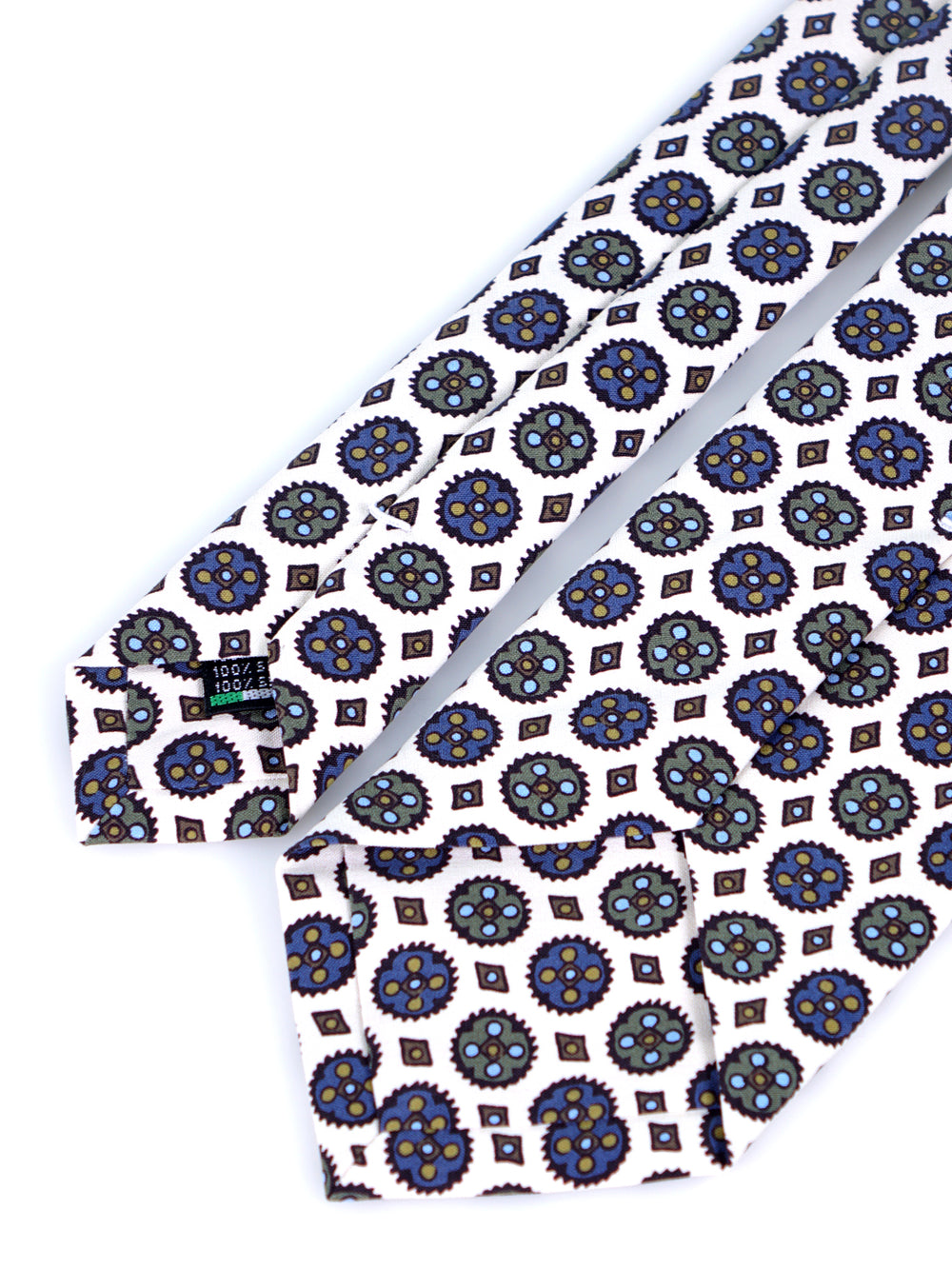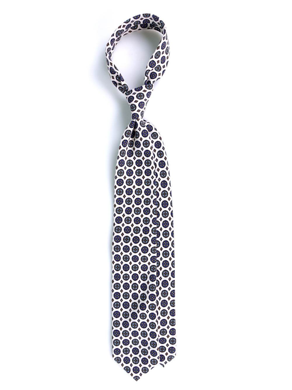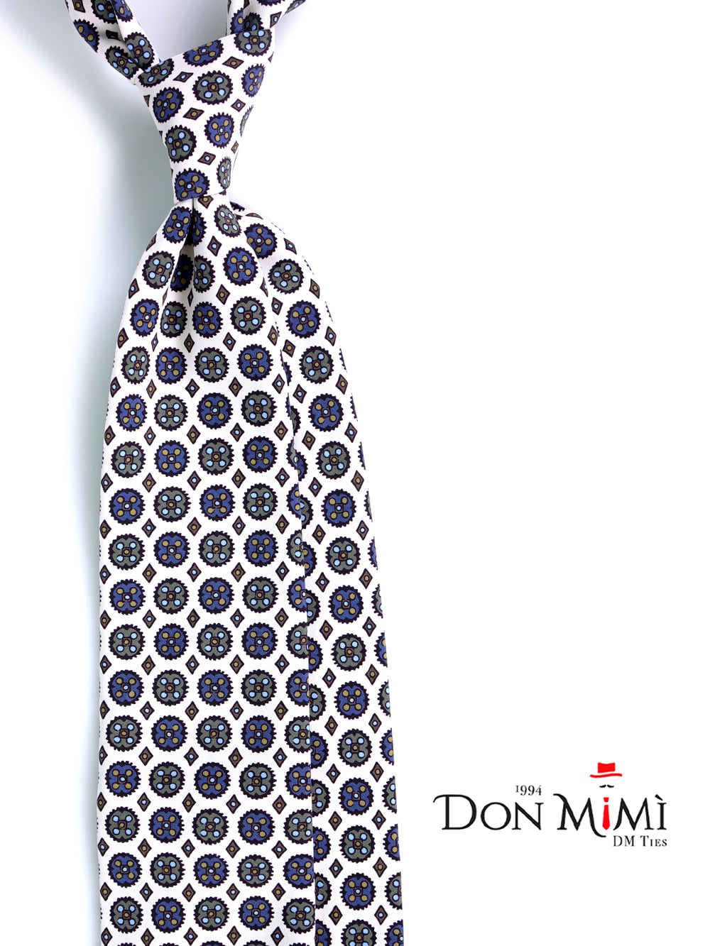 Un pezzo di rara raffinatezza, questa cravatta Don Mimì è una luminosa e audace interpretazione della tradizionale Seta Madder. Contrariamente alle classiche tinte scure, qui il fondo è un elegante bianco panna che esalta la finitura gessosa e opaca del tessuto. Il motivo, un dialogo cromatico tra blu, verde oliva e giallo, acquista una profondità unica grazie a questa lavorazione esclusiva. È l'accessorio perfetto per l'uomo che cerca un'eleganza distintiva e solare, che comunica cultura e una profonda conoscenza dei tessuti pregiati.