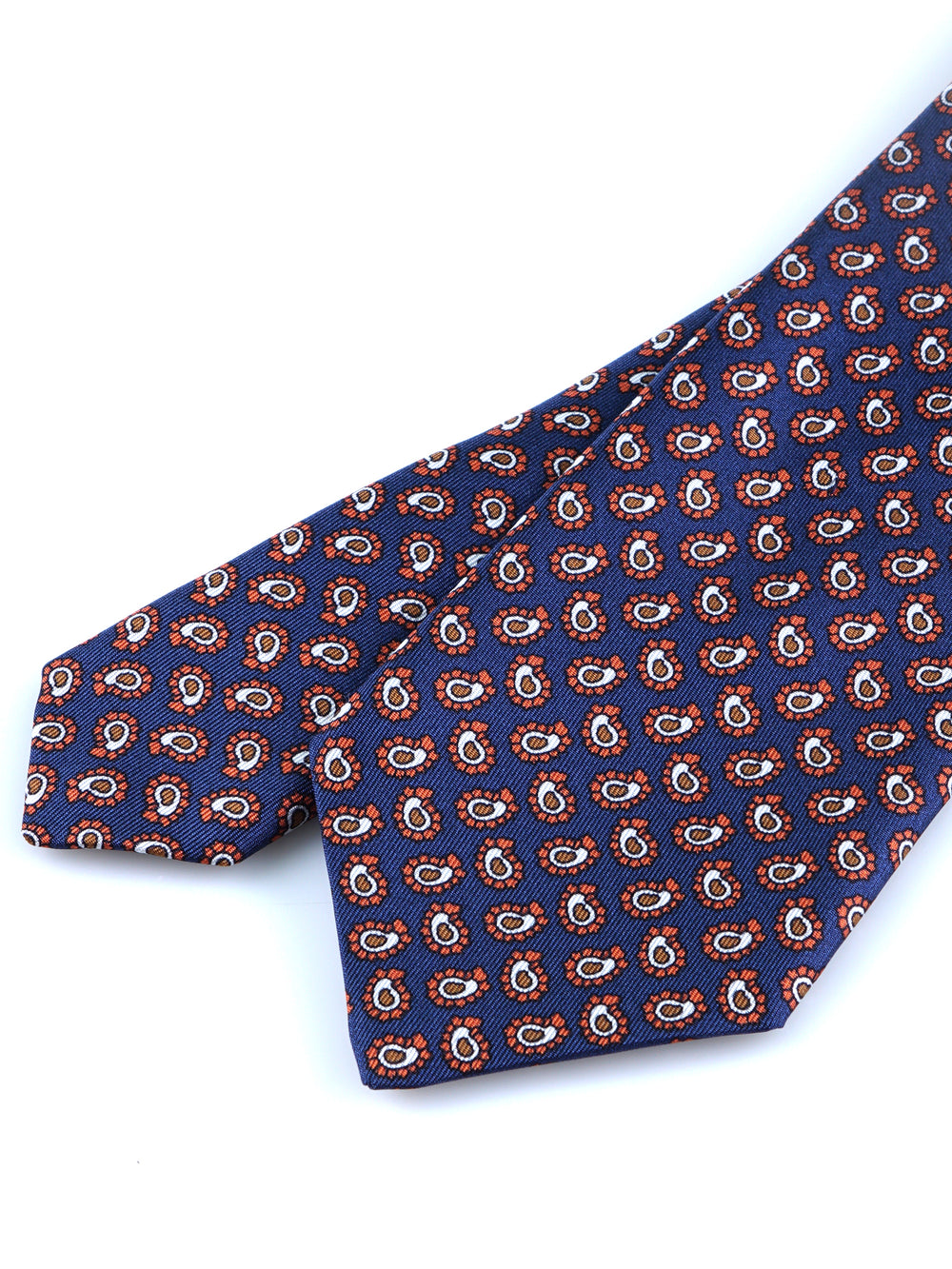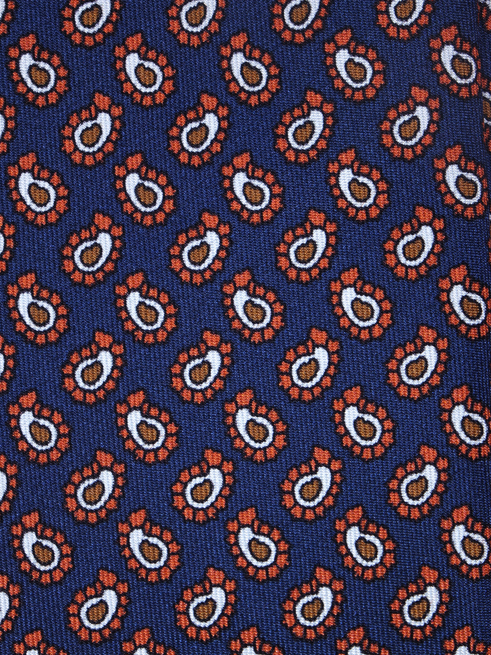 Colore/Fantasia: Fondo Blu Navy con micro-fantasia arancione e marrone.