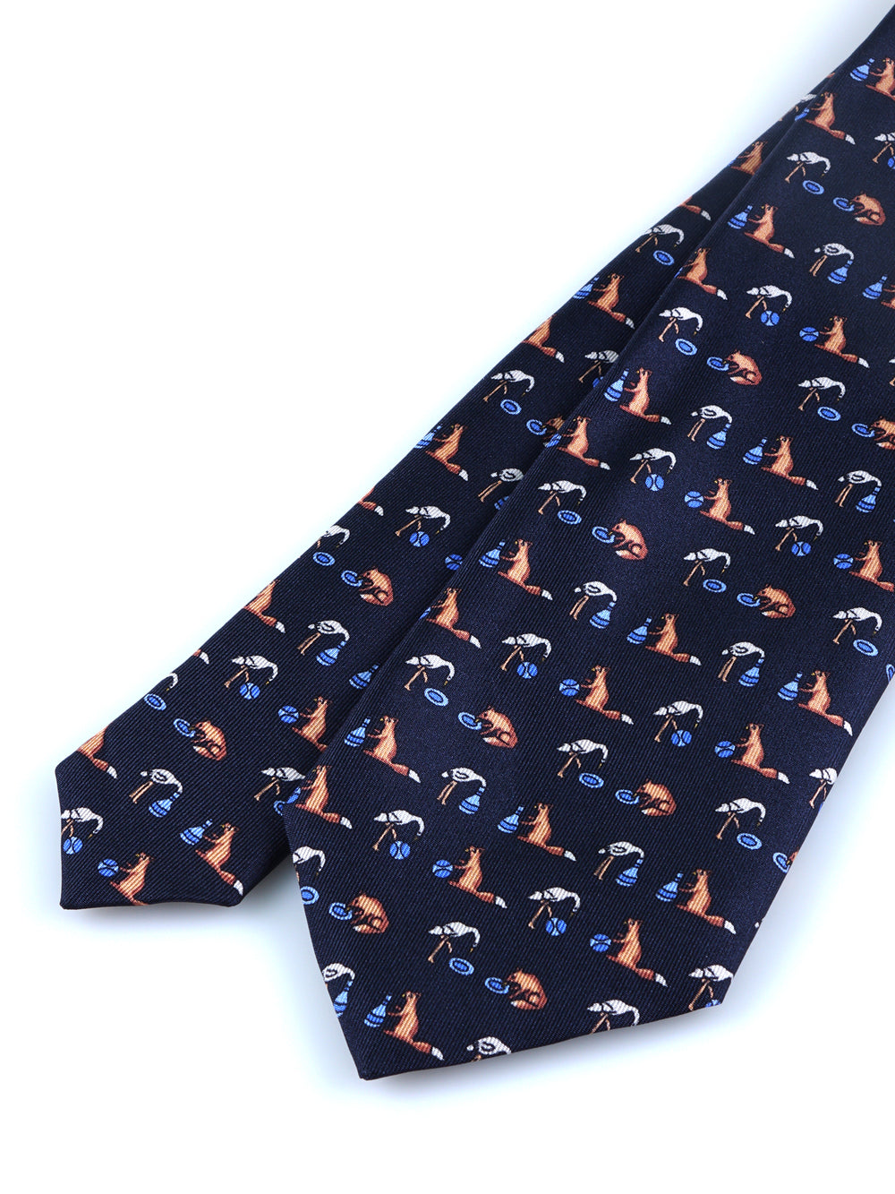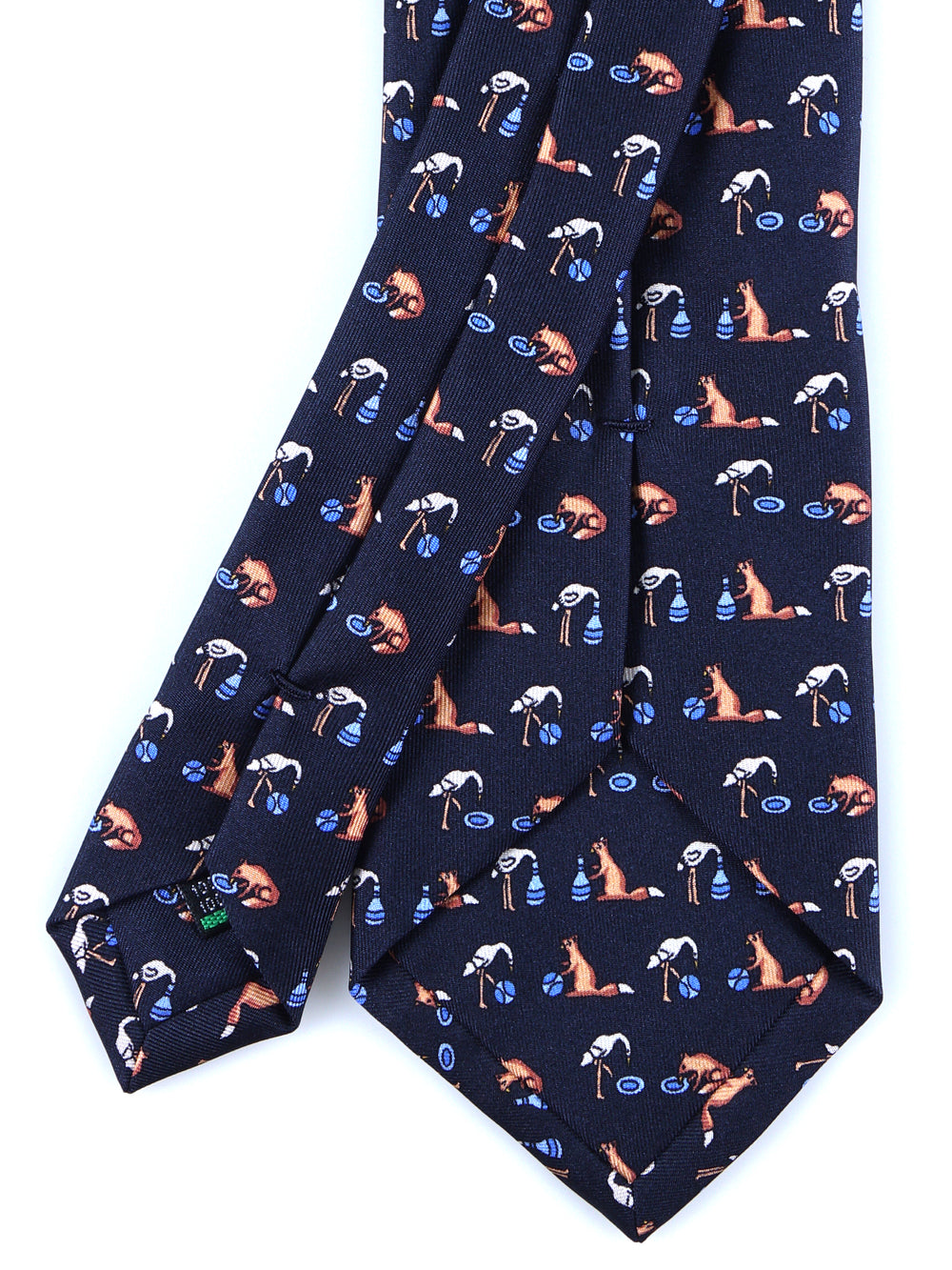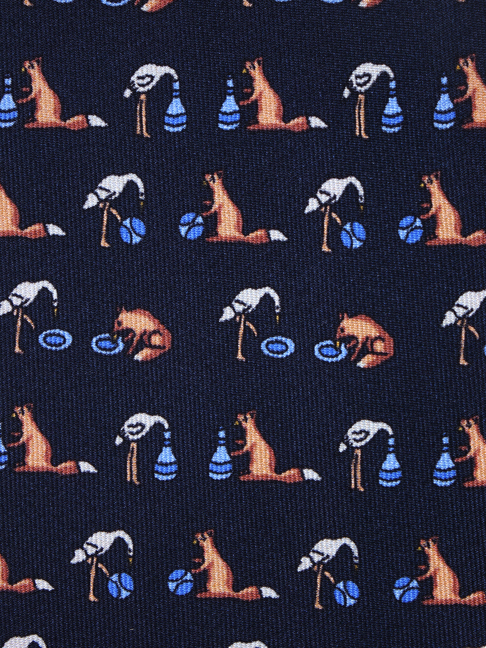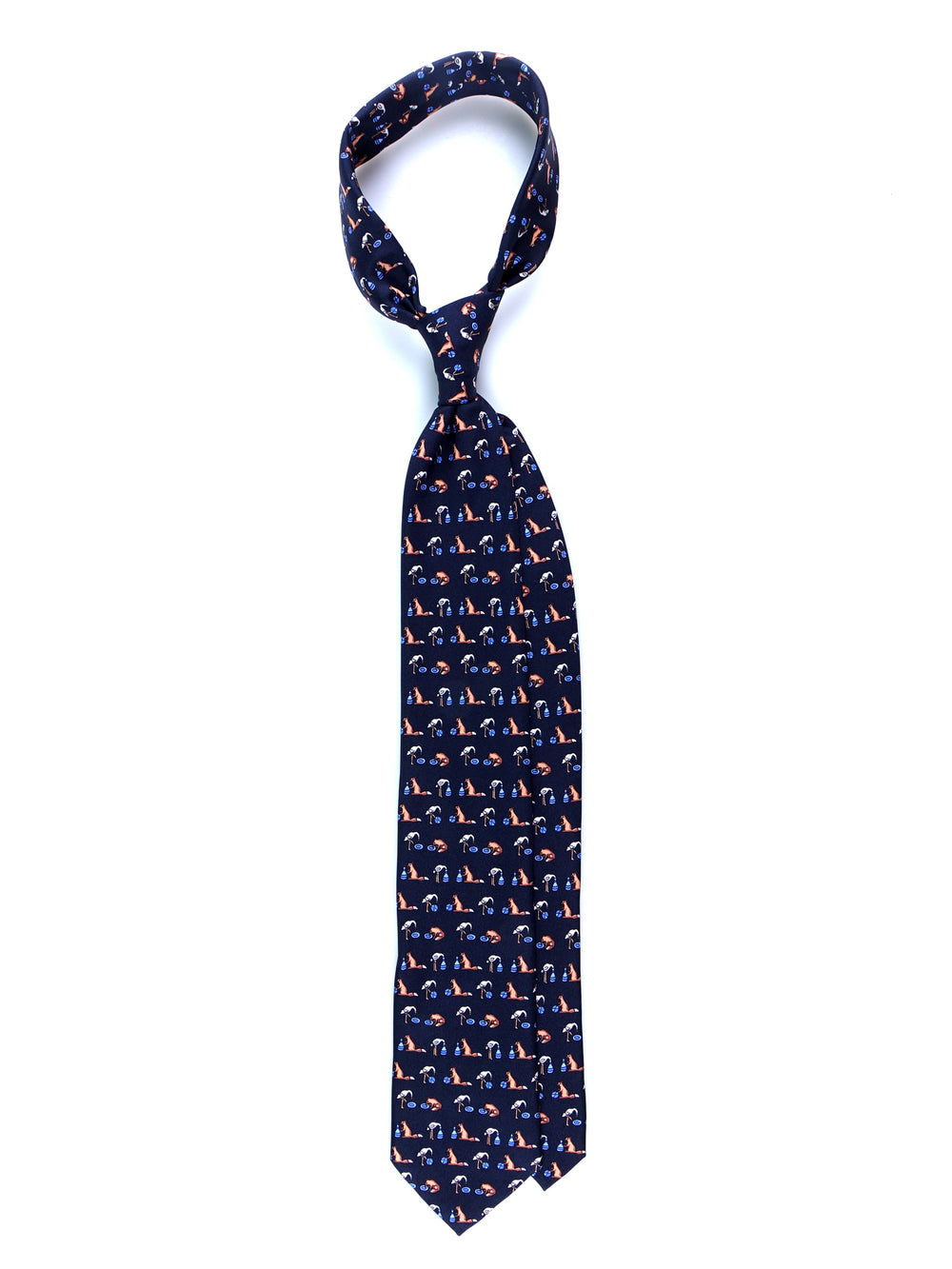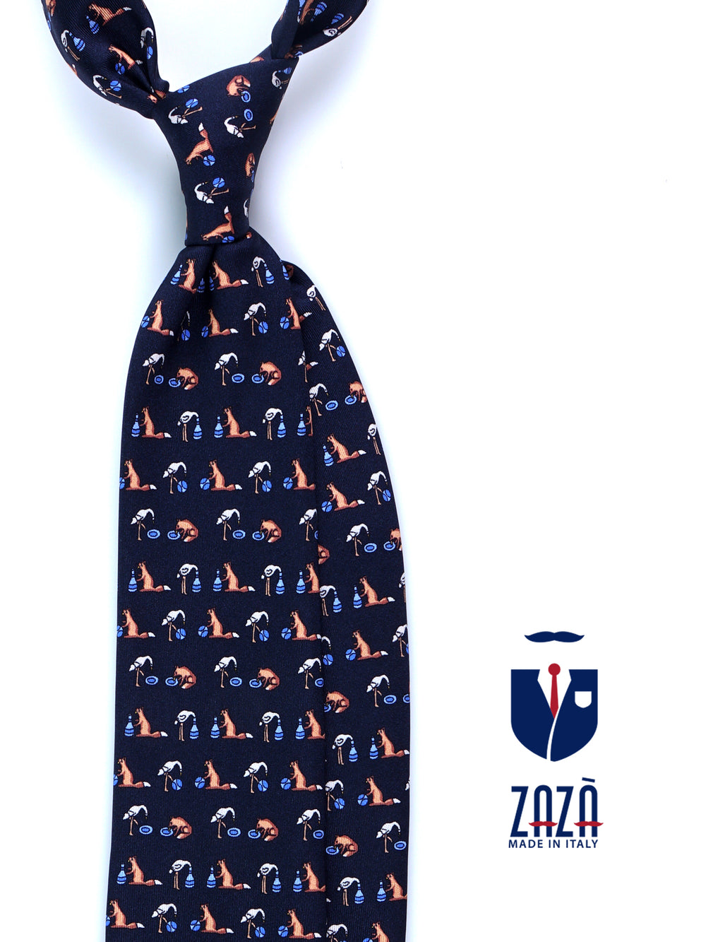 Un tocco di ironia per ravvivare il guardaroba della stagione fredda. Questa cravatta "conversazionale" della collezione Autunno/Inverno ZAZÀ è un accessorio per l'uomo che non prende la moda troppo sul serio, ma non rinuncia mai alla qualità. Realizzata in pregiata seta stampata, si distingue per il suo design unico: su un classico fondo blu navy si alternano fenicotteri rosa in posa yoga e simpatiche volpi che si rilassano con un drink. È un pezzo che esprime una personalità sicura e un'eleganza spiritosa, firmata ZAZÀ Made in Italy.