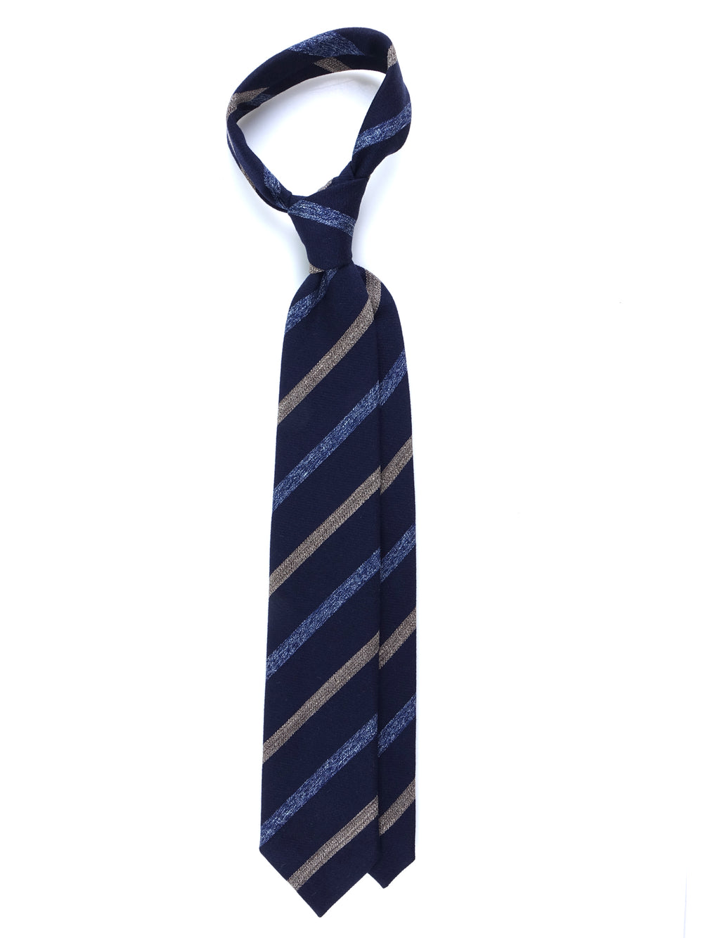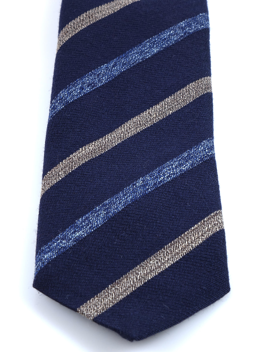 Questa cravatta è un pilastro della collezione Autunno/Inverno, un accessorio che celebra la ricchezza dei tessuti nobili. Realizzata in una pregiata miscela di lana e seta, possiede una mano calda e una texture opaca che la rendono perfetta per la stagione. Il classico disegno Regimental è qui interpretato con una palette di colori intramontabile: il blu navy fa da sfondo a righe beige e azzurre dalla texture melangiata, un dettaglio che denota una qualità superiore. È la firma dell'uomo ZAZÀ: elegante, colto e mai banale.