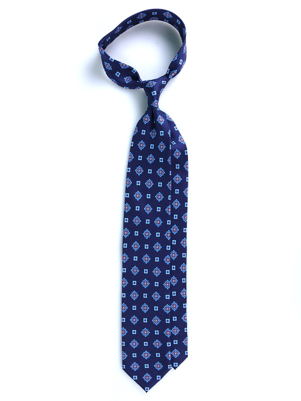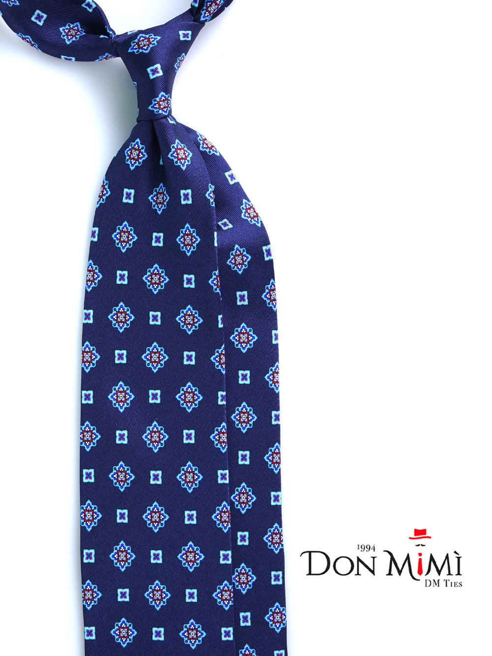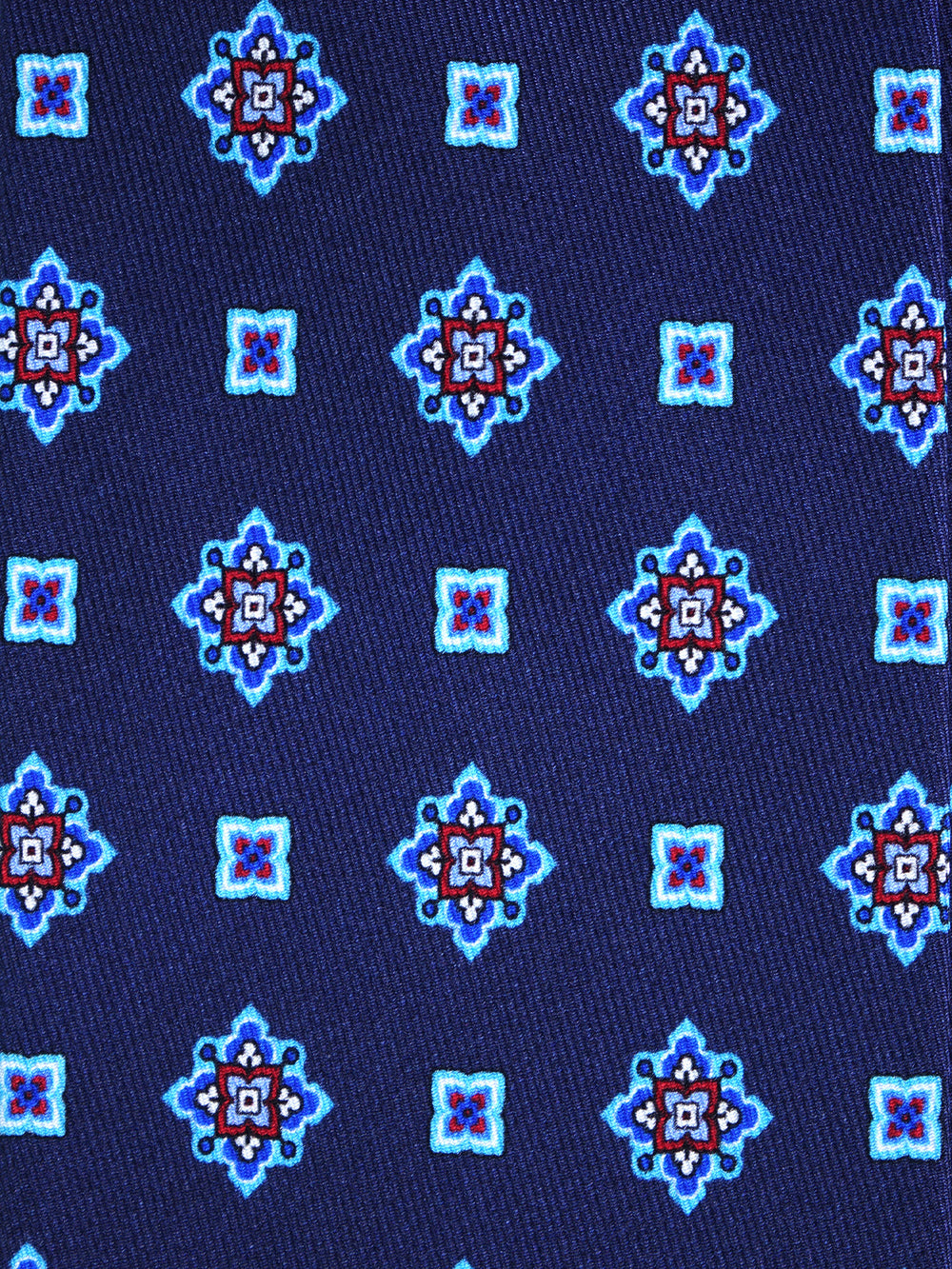 Questa cravatta è un omaggio all'arte e alla creatività italiana. Su un fondo blu notte, profondo e rassicurante, fiorisce un disegno a mosaico che ricorda le geometrie preziose del barocco leccese. La palette cromatica, un dialogo tra un azzurro vibrante e un caldo rosso corallo, è stampata su una pregiata saia di seta, la cui trama diagonale garantisce un nodo perfetto e una caduta impeccabile. È l'accessorio per l'uomo che conosce le regole dello stile per poterle reinterpretare con personalità.
