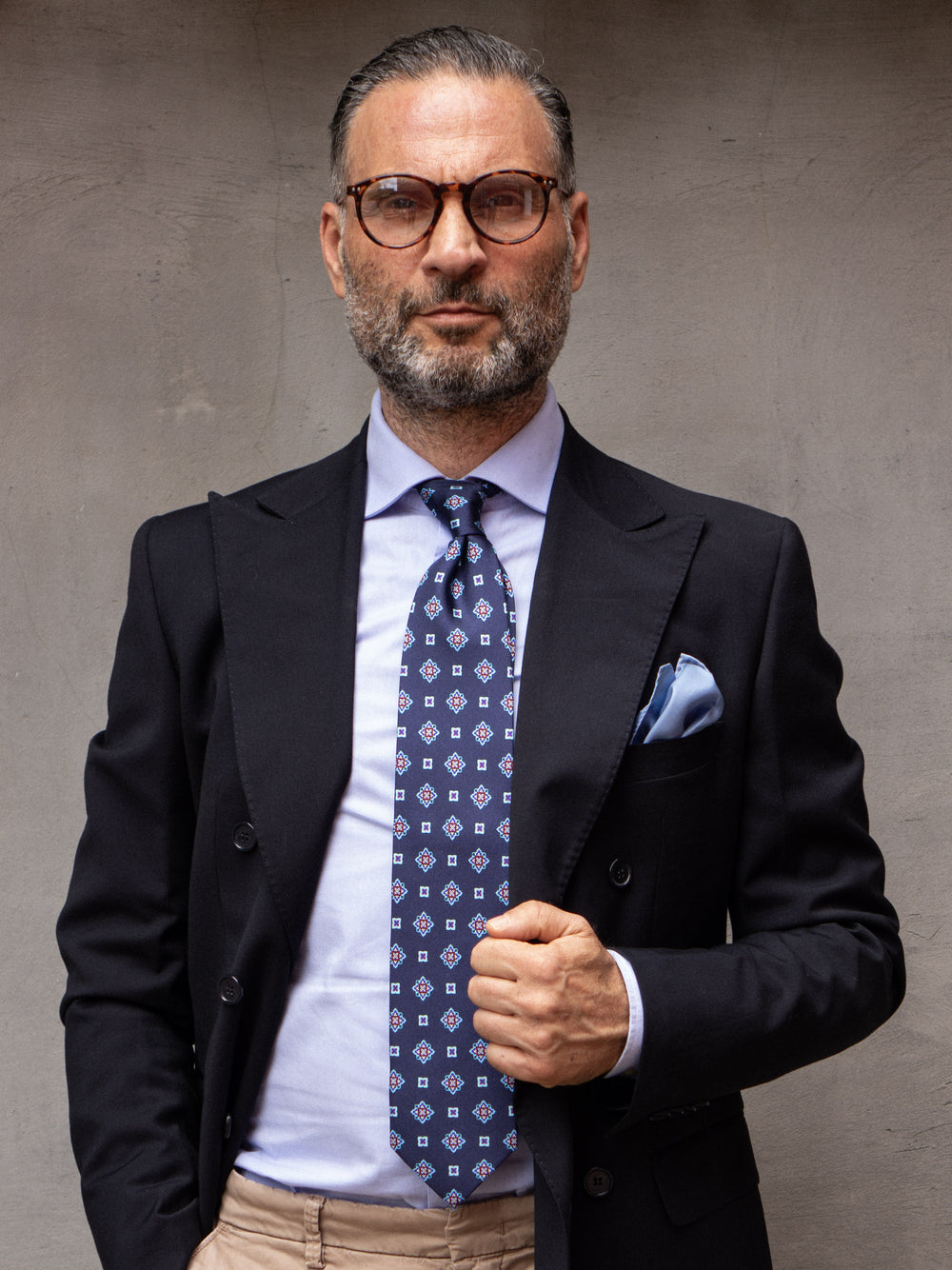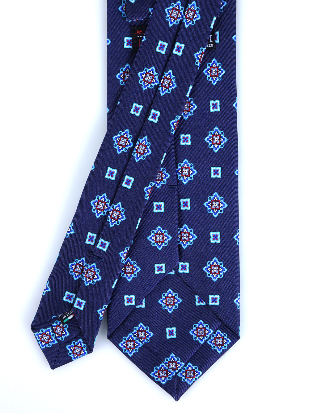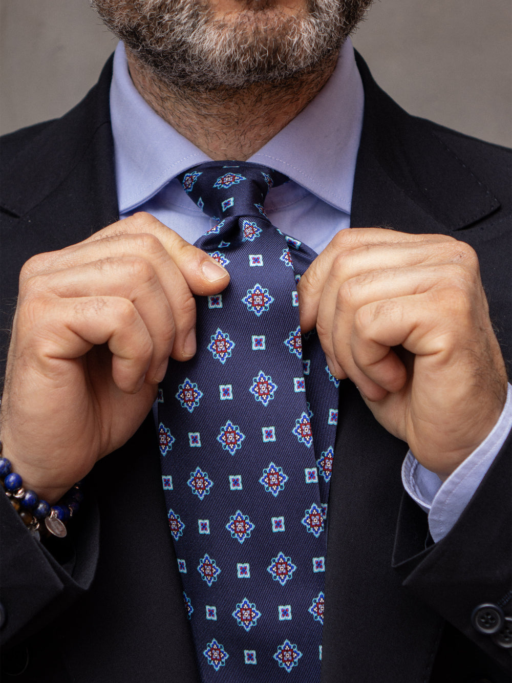 Questa cravatta è un omaggio all'arte e alla creatività italiana. Su un fondo blu notte, profondo e rassicurante, fiorisce un disegno a mosaico che ricorda le geometrie preziose del barocco leccese. La palette cromatica, un dialogo tra un azzurro vibrante e un caldo rosso corallo, è stampata su una pregiata saia di seta, la cui trama diagonale garantisce un nodo perfetto e una caduta impeccabile. È l'accessorio per l'uomo che conosce le regole dello stile per poterle reinterpretare con personalità.