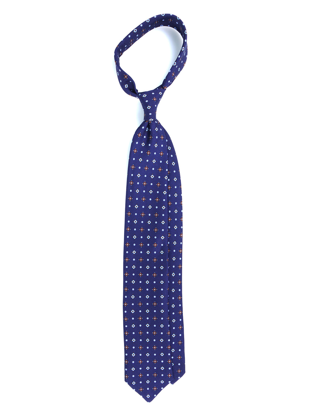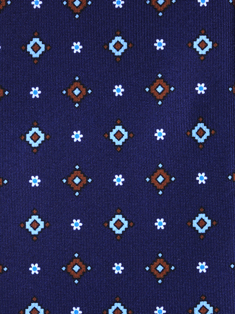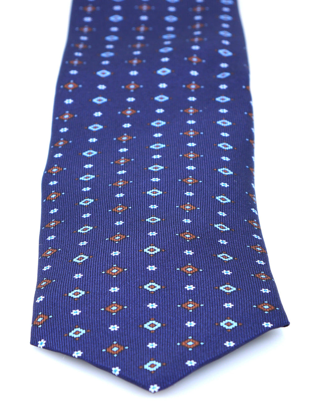 Questa cravatta in seta inglese stampata blu, arricchita da un raffinato motivo geometrico marrone e azzurro, è la scelta ideale per l’uomo che desidera un accessorio distintivo e versatile. Un perfetto equilibrio tra tradizione e modernità, realizzata a mano in Italia.