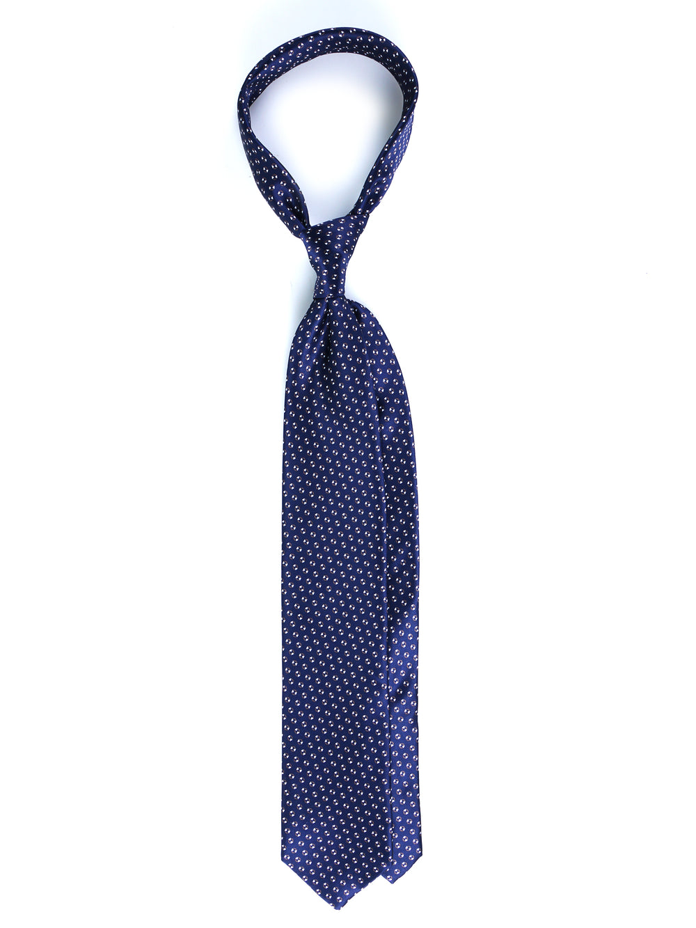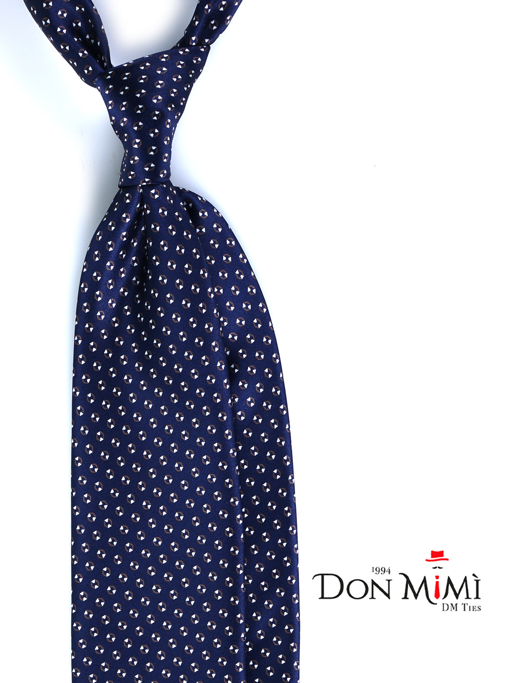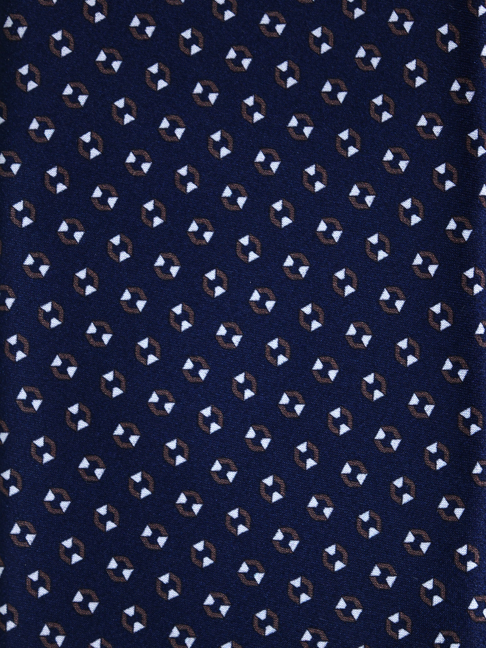 Questa cravatta è il caposaldo della collezione Autunno/Inverno, un vero e proprio "falso unito" che nasconde un'anima ricca di dettagli. Su un fondo blu navy autorevole e senza tempo, fiorisce una delicata fantasia geometrica che gioca con i toni caldi del marrone. Realizzata in una preziosa saia di seta, è un pezzo di una versatilità straordinaria, pensato per essere il punto di partenza su cui costruire un intero outfit da intenditore.