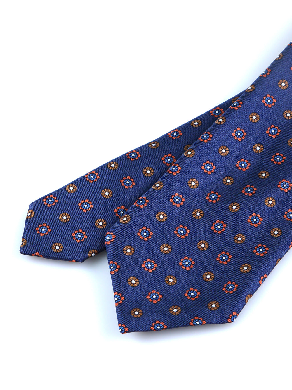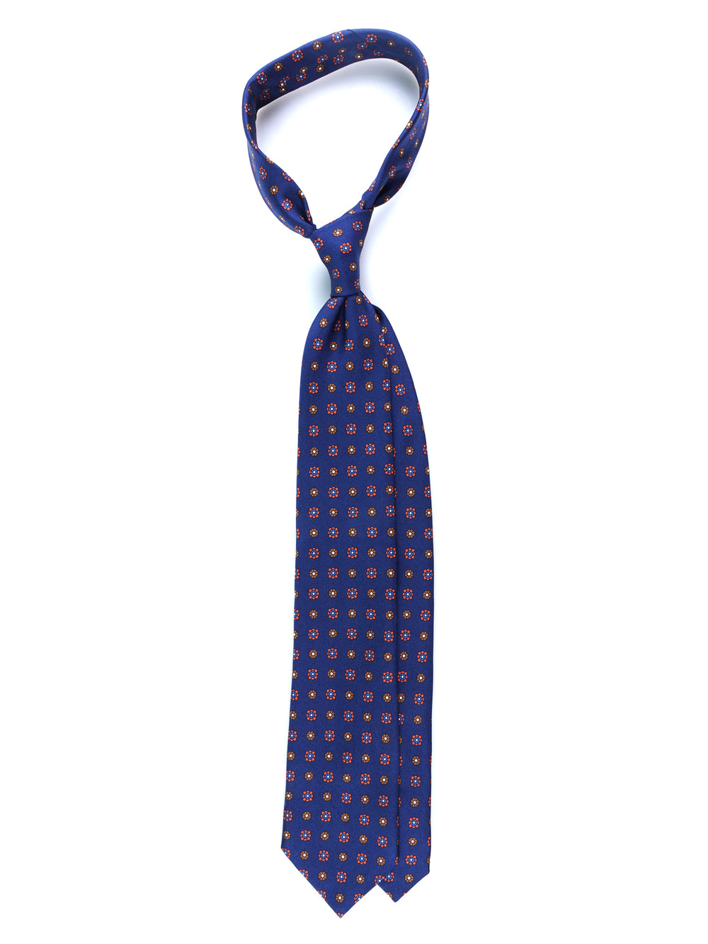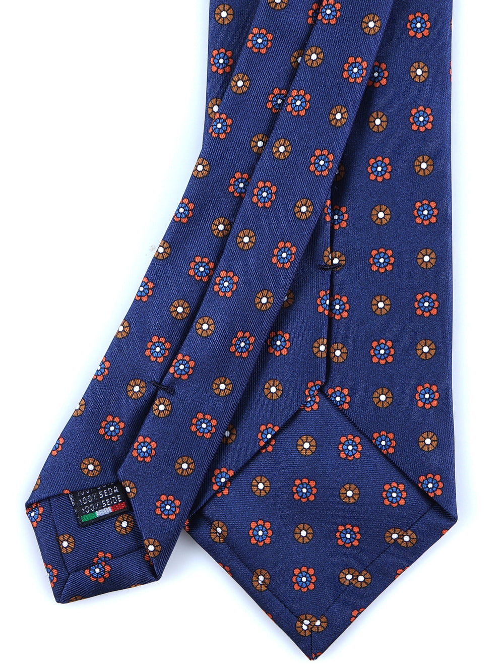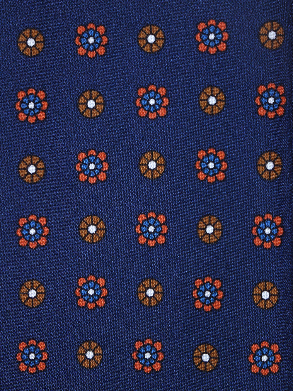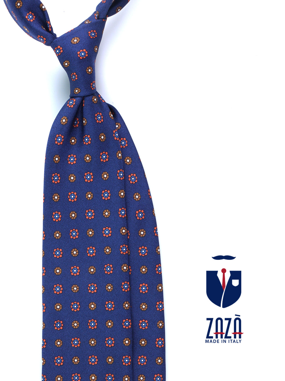 Un accessorio passe-partout del guardaroba maschile, reinterpretato con lo stile e la qualità ZAZÀ Made in Italy. Questa cravatta in pregiata seta stampata si distingue per il suo perfetto equilibrio: il fondo blu, classico e rassicurante, è ravvivato da un delicato micro-motivo floreale dove il calore dell'arancio e del marrone crea un dialogo cromatico sofisticato e di grande gusto. La fantasia discreta la rende incredibilmente versatile, un pezzo chiave per l'uomo che cerca un'eleganza curata in ogni dettaglio.