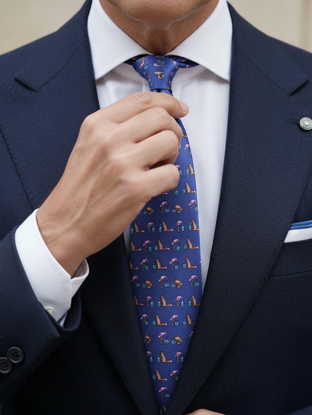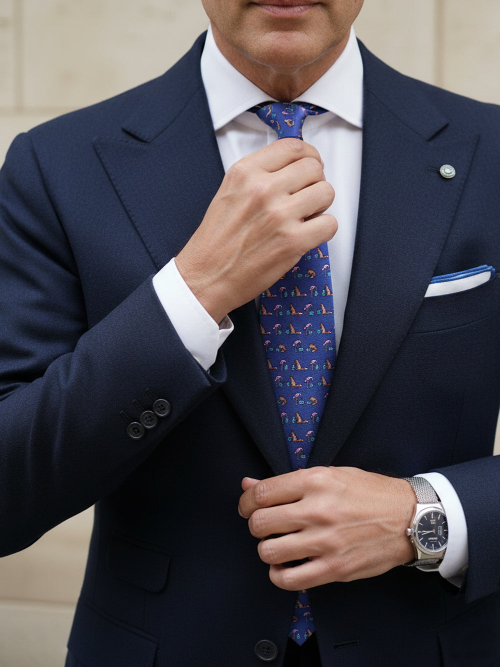 Per portare un tocco di personalità in ufficio (quando il dress code lo permette). L'abbinamento più efficace è con un abito in flanella blu navy, che fornisce una base solida e smorza l'ironia della cravatta. La camicia deve essere un'impeccabile bianca in popeline. Come fazzoletto da taschino, una pochette bianca con bordino blu è la scelta più sicura e di classe. Delle bretelle in elastico blu navy manterranno un'eleganza funzionale.