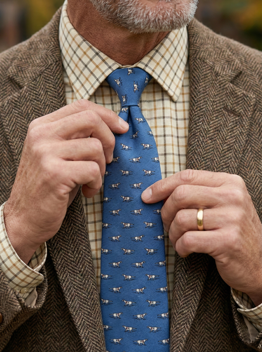 Il consiglio del sarto: La lana Challis permette di realizzare nodi piccoli e molto ordinati. Data la natura figurativa del disegno, raccomandiamo un Four in Hand (Semplice) ben centrato per non distorcere troppo il motivo dei cani sotto il nodo. La "dimple" (fossetta) è d'obbligo per dare movimento e profondità.