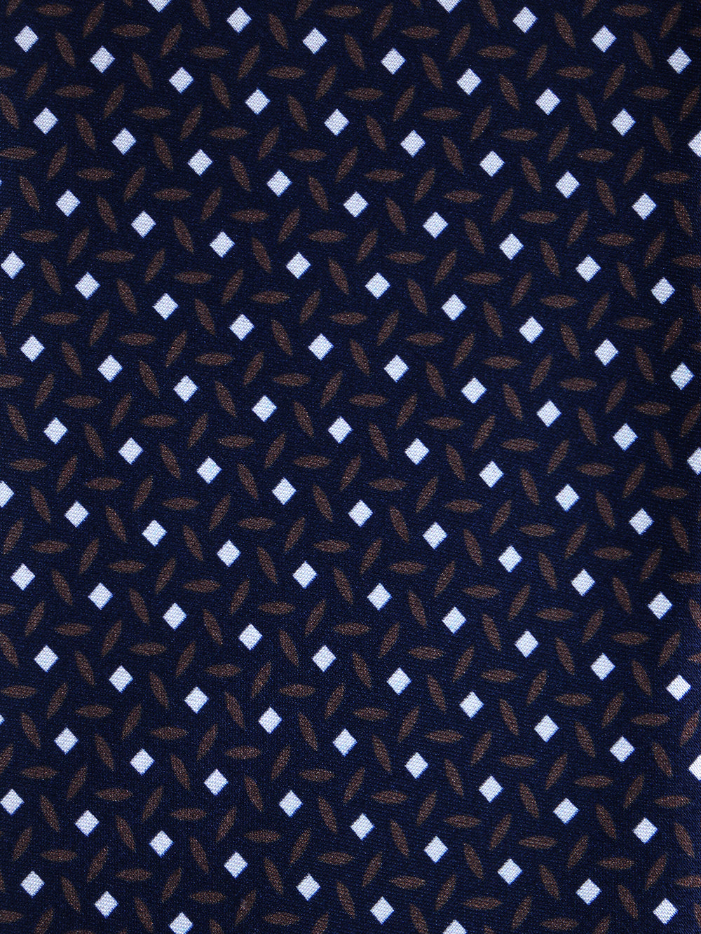 Colore/Fantasia: Fondo Blu Navy con disegno geometrico grigio e bianco.