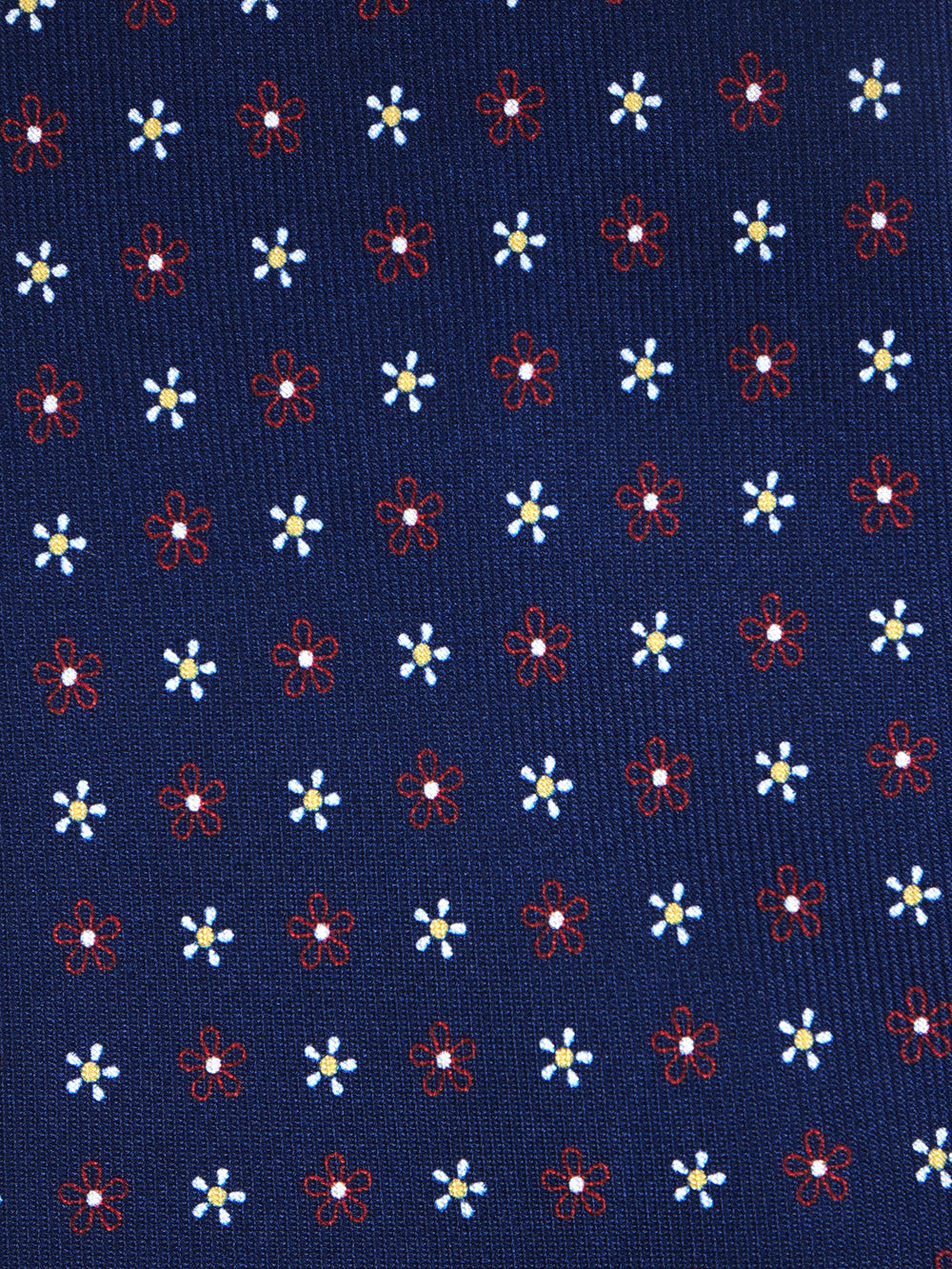 Questa cravatta è un caposaldo della collezione Autunno/Inverno, un vero e proprio "falso unito" che nasconde un'anima ricca di dettagli. Su un fondo blu navy autorevole e senza tempo, fiorisce una delicata fantasia con tocchi di bordeaux e bianco panna. Realizzata in pregiata seta inglese, la sua trama in saia garantisce un nodo impeccabile. È l'accessorio perfetto per l'uomo che cerca un'eleganza impeccabile in ogni occasione, dall'ufficio alla cerimonia.