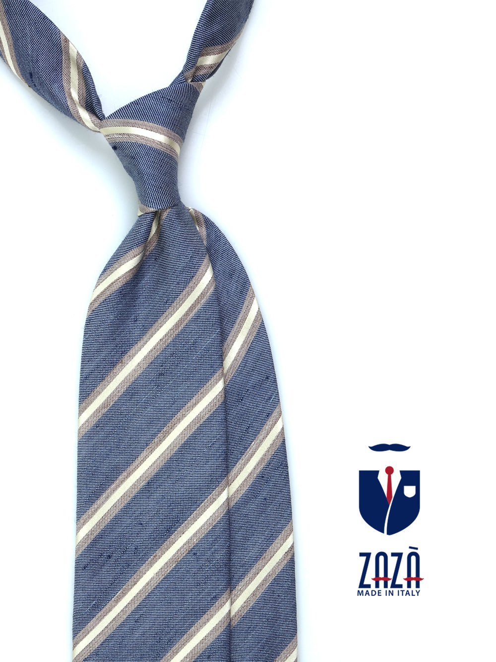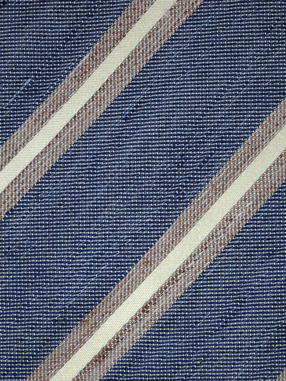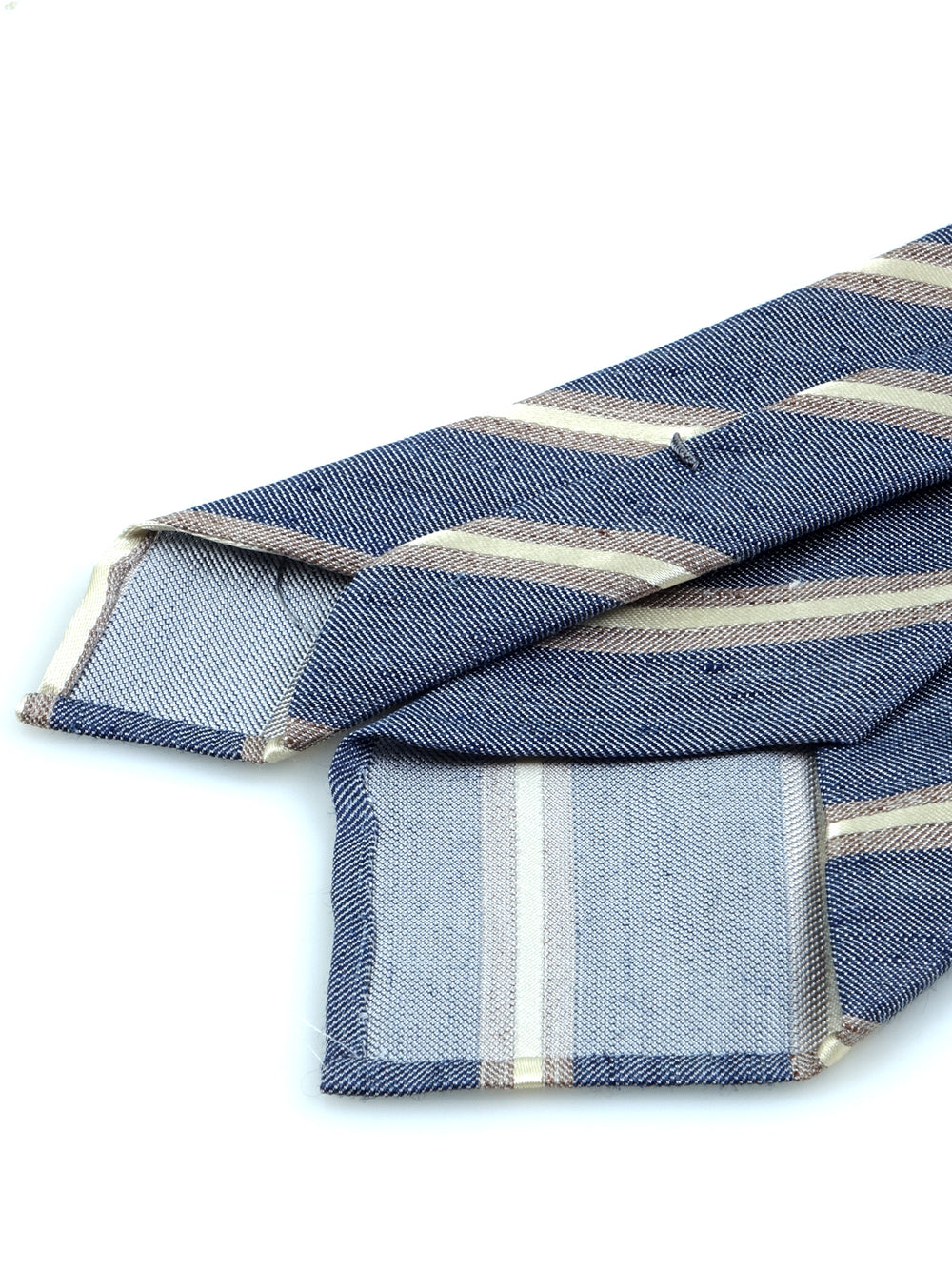 Cravatta 3 pieghe sfoderata in lino e seta blu con righe regimental marroni e beige