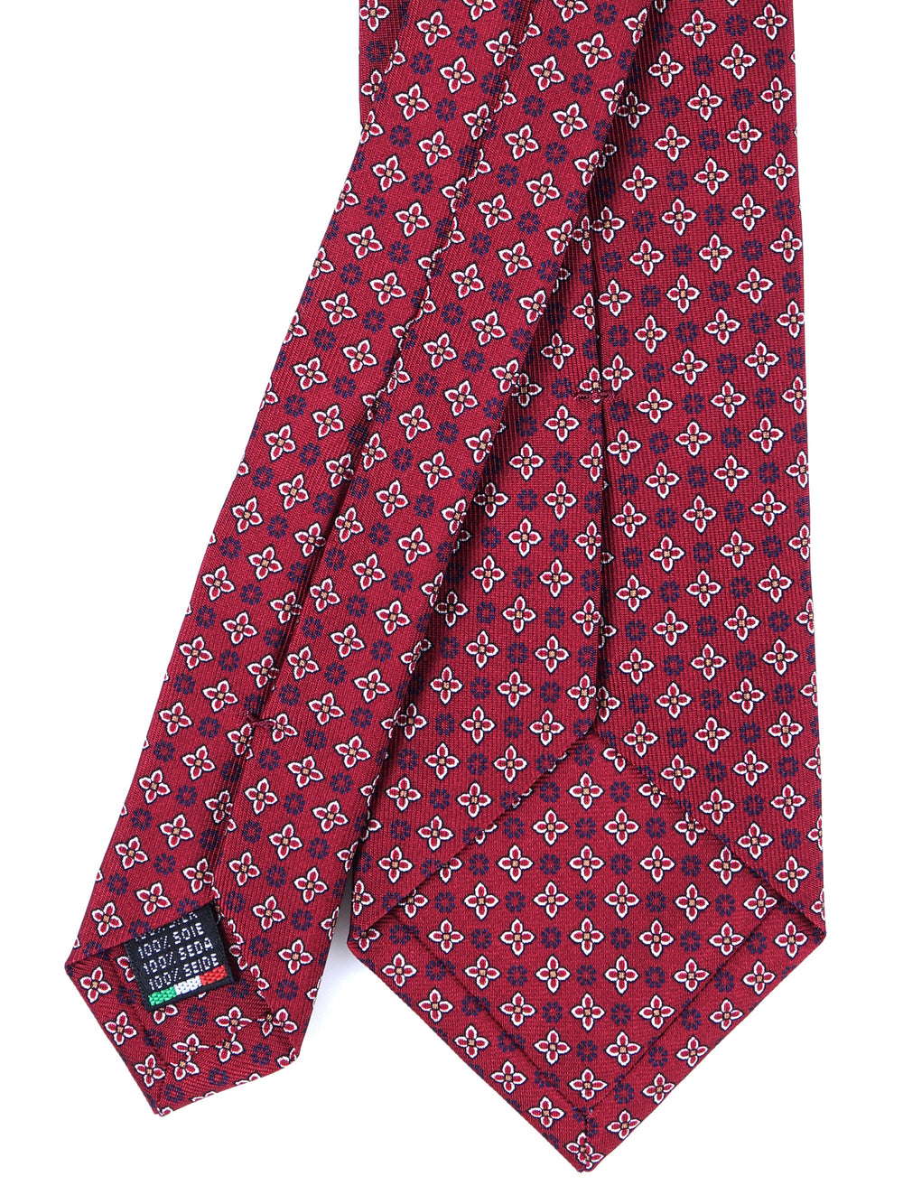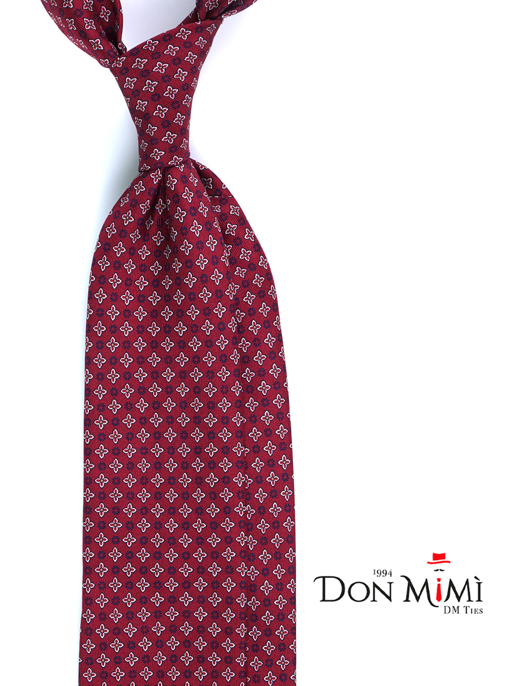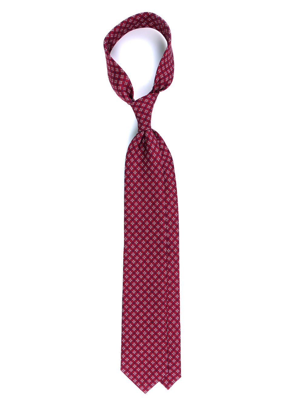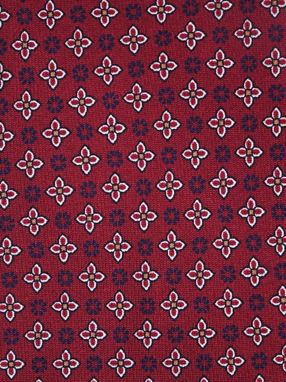 Questa cravatta è il cuore pulsante della nuova collezione Autunno/Inverno. È un inno ai colori caldi e alla ricchezza materica, un accessorio che esprime potenza e raffinatezza. Il suo colore protagonista è un profondo Bordeaux, stampato su una pregiata seta inglese per garantire una resa cromatica satura e lussuosa. Il disegno a mosaico, con dettagli blu e bianchi, aggiunge un livello di complessità visiva, mentre la trama in saia di seta assicura un nodo strutturato e una caduta impeccabile.
