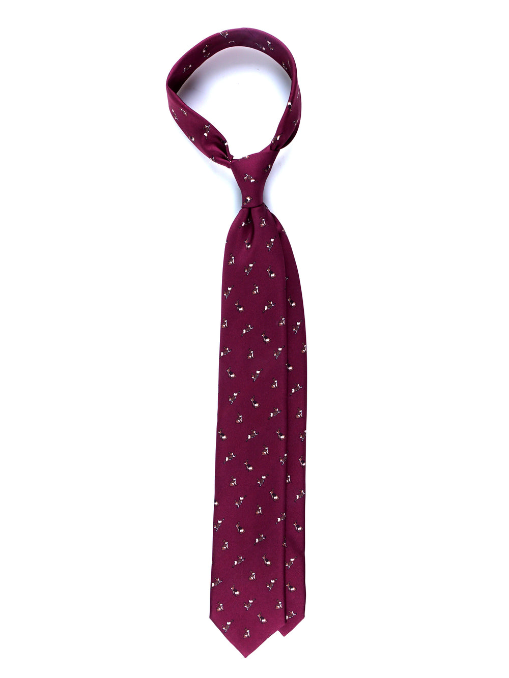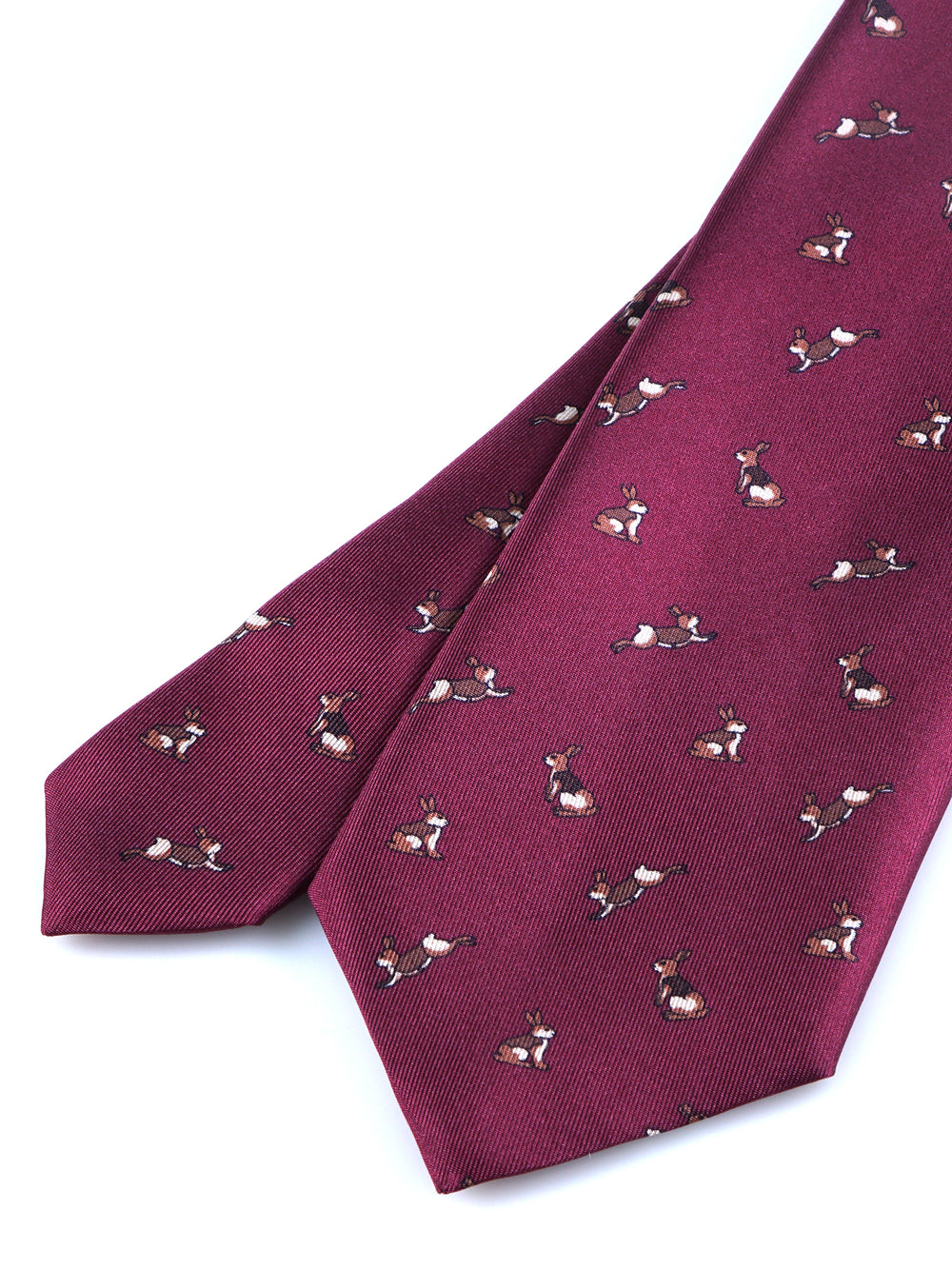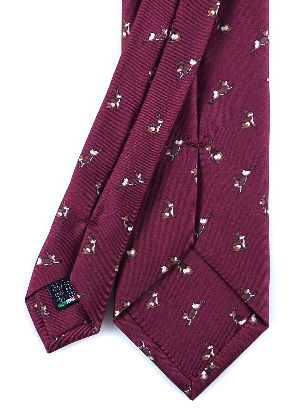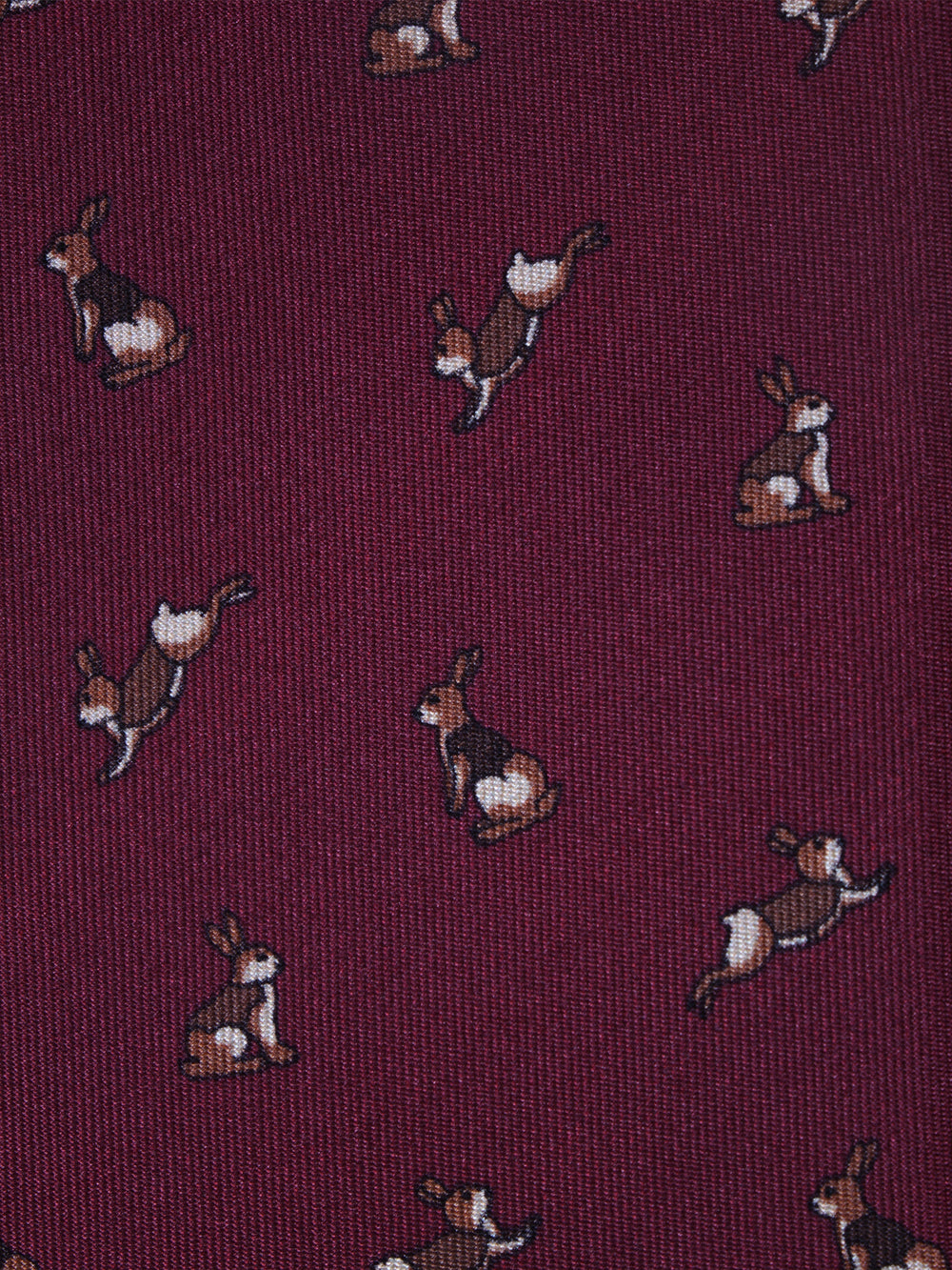 Questa cravatta è un pezzo chiave della collezione Autunno/Inverno, un accessorio che racconta una storia di eleganza e passione. Su un fondo bordeaux, caldo e potente, si muovono con grazia delle piccole lepri, un disegno iconico che evoca la tradizione e l'amore per la natura. Realizzata in una preziosa saia di seta, è un "falso unito" che da lontano appare formale, ma da vicino rivela il suo carattere unico. È la firma dell'uomo ZAZÀ: elegante, colto e mai banale.