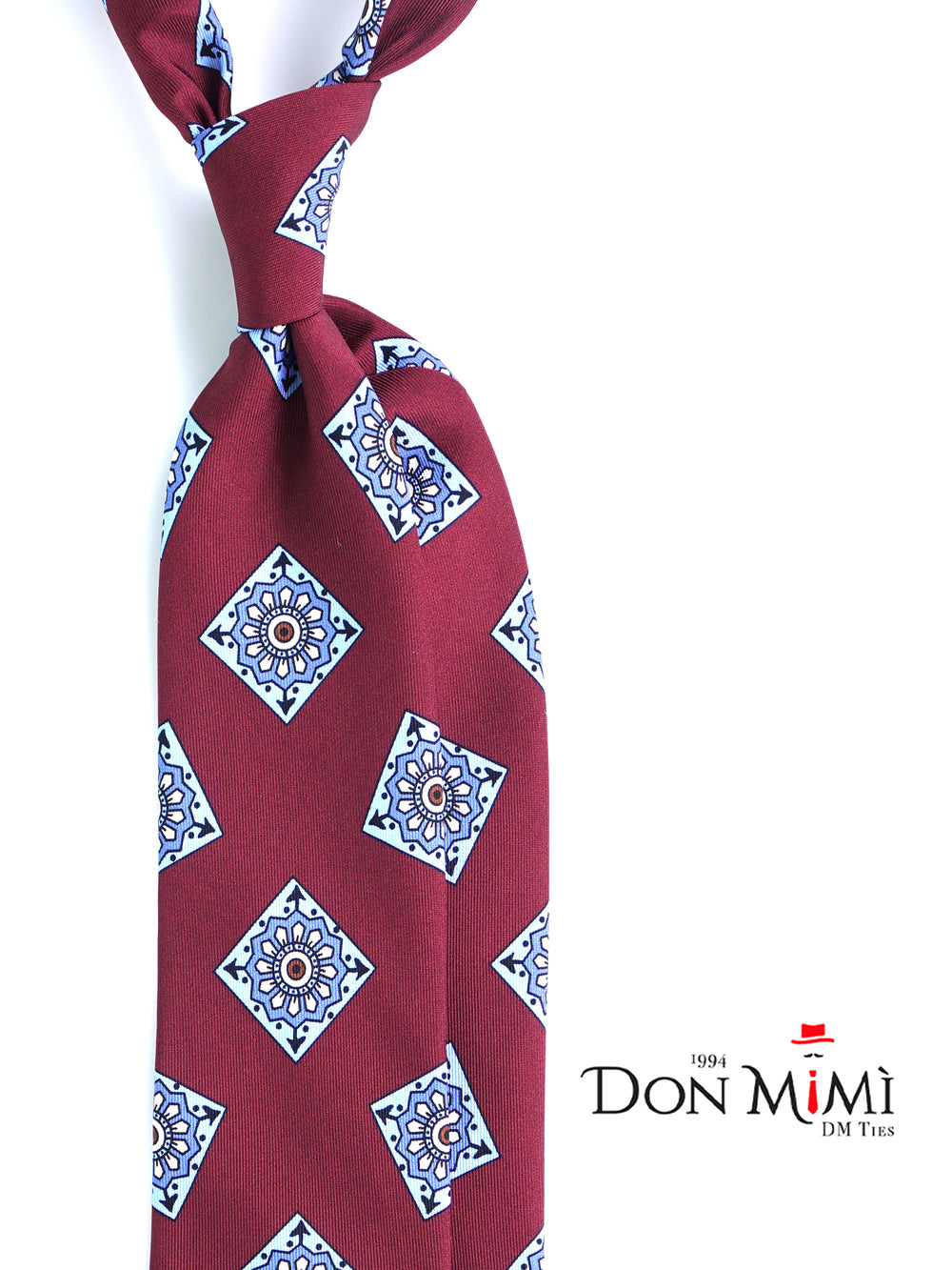 Un pezzo di grande impatto visivo, questa cravatta Don Mimì celebra l'incontro tra la tradizione sartoriale e l'ispirazione mediterranea. È realizzata in pregiata seta stampata inglese, un tessuto dalla mano liscia e dalla lucentezza discreta che garantisce un drappeggio perfetto e un nodo impeccabile. Il design si distingue per un maxi-motivo a medaglione che ricorda le antiche maioliche, dove il calore di un profondo bordeaux si sposa con la freschezza delle diverse tonalità di azzurro e blu. È un accessorio per l'uomo che vuole affermare il proprio stile con un pezzo unico e di carattere.
