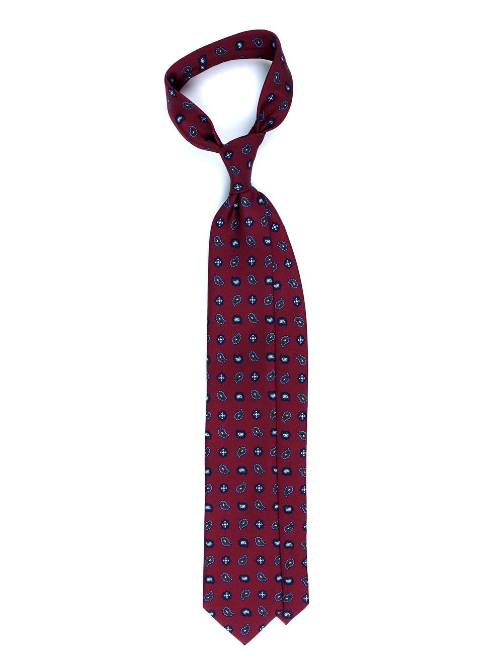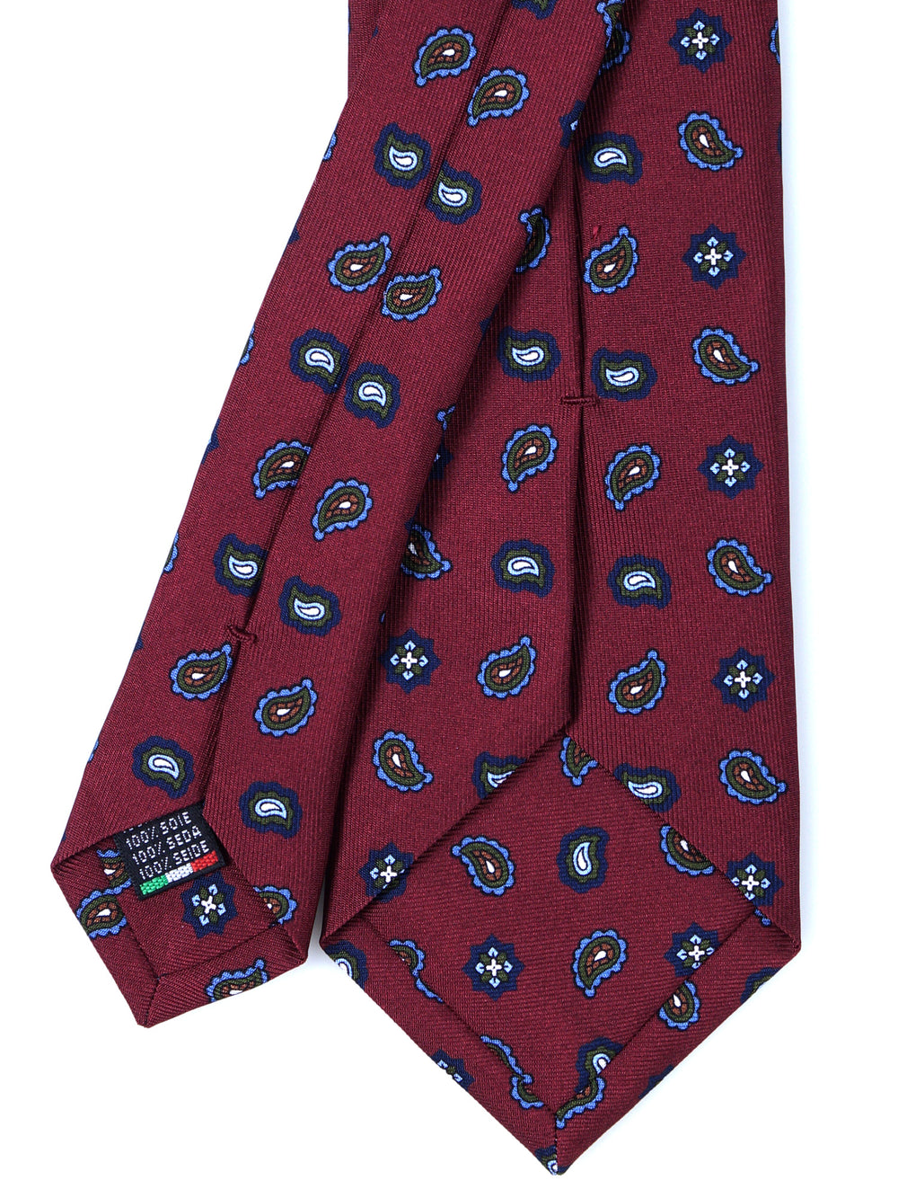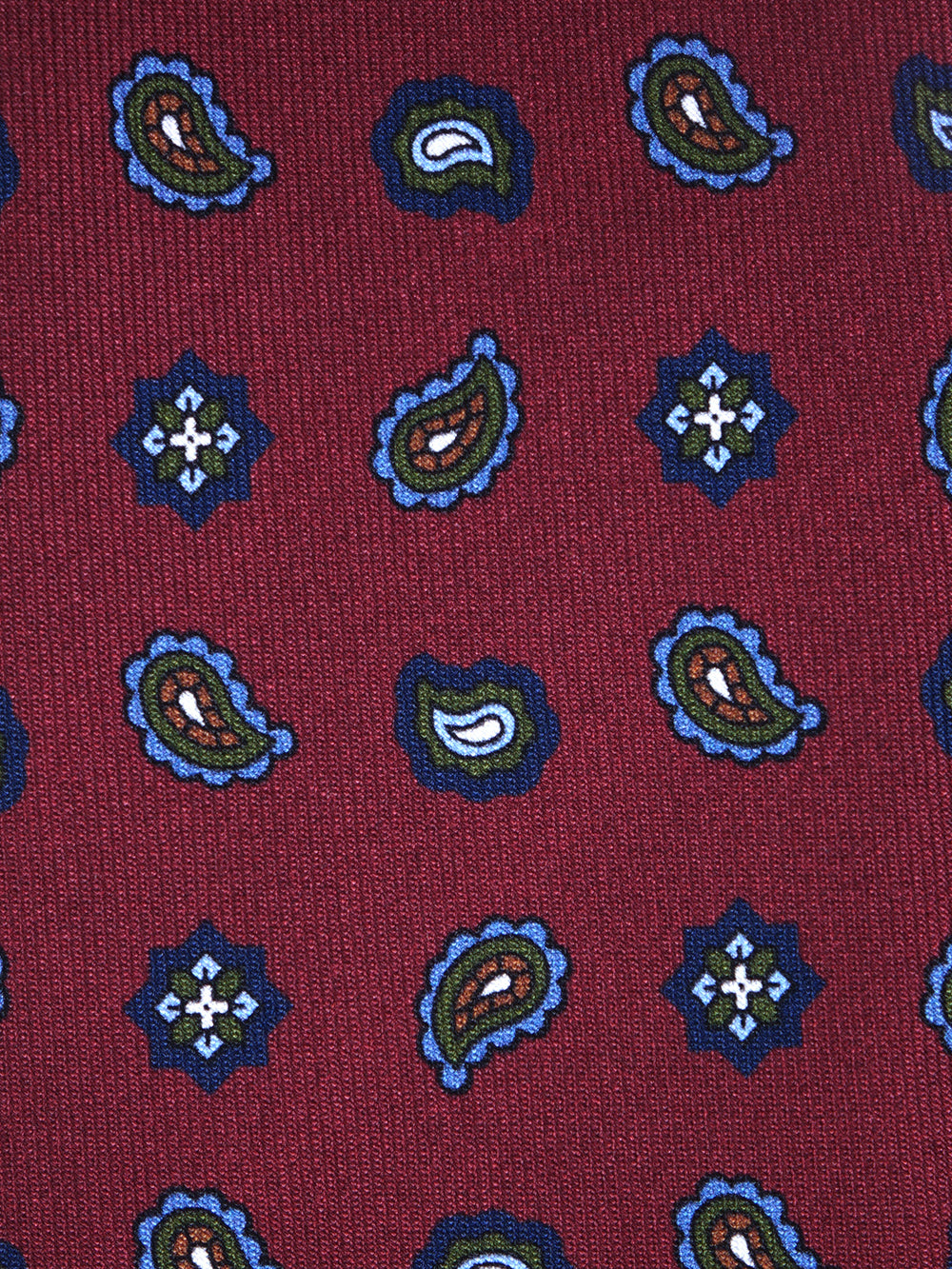 Questa cravatta è un caposaldo della collezione Autunno/Inverno, un pezzo che celebra la ricchezza cromatica del Bordeaux e la complessità dei disegni classici. Realizzata in pregiata seta inglese, presenta una fantasia che alterna motivi Paisley e geometrici. Ma è la sua complessa palette di colori a renderla un vero capolavoro: il calore del bordeaux dialoga con la freschezza dell'azzurro e le note terrose del verde. È un accessorio per l'uomo che apprezza un'eleganza colta e non banale.