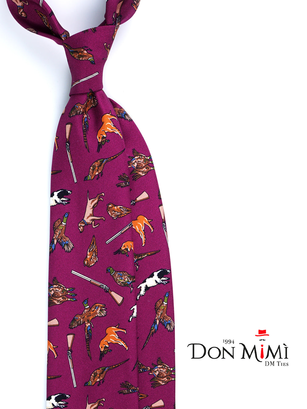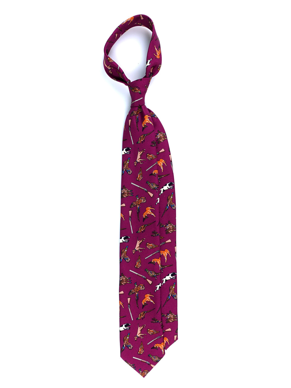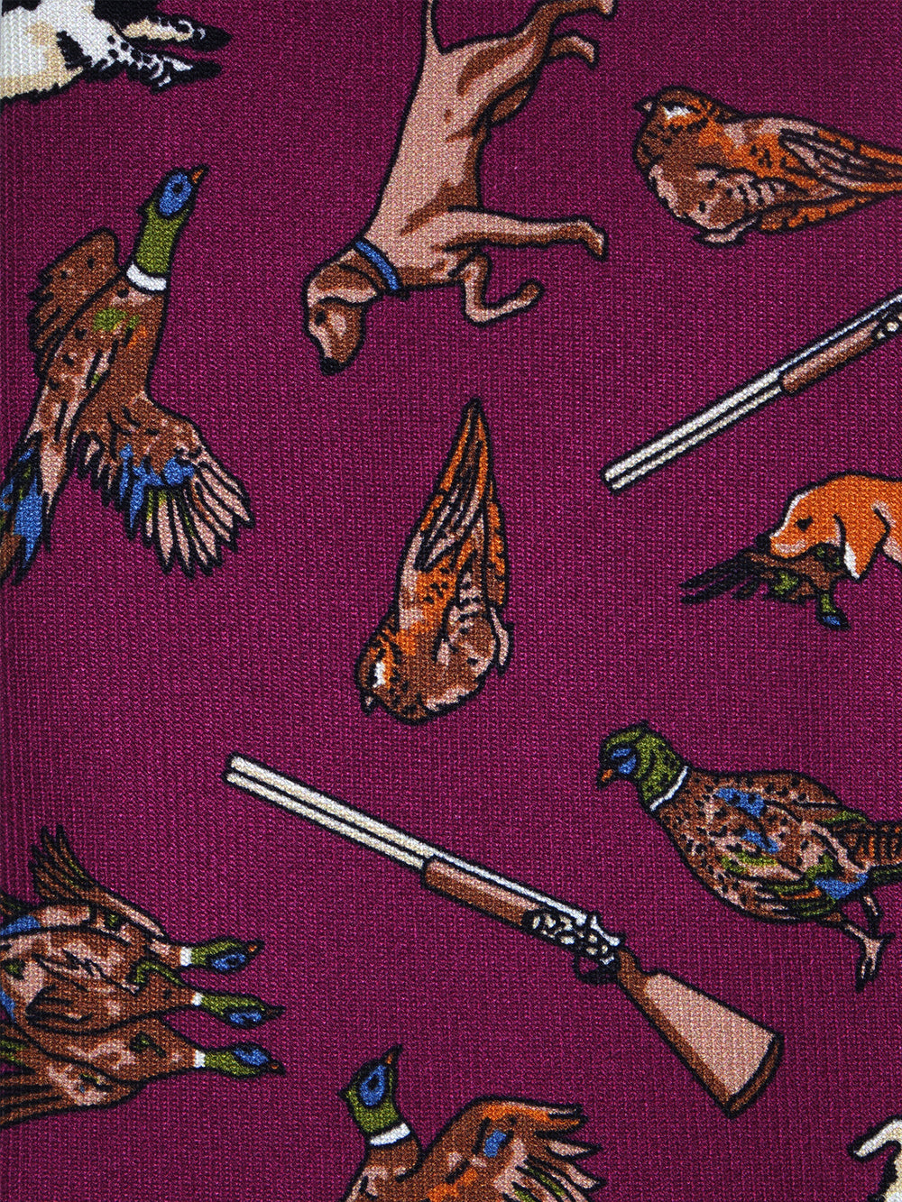 Questa cravatta non è un accessorio, è un affresco. Pezzo forte della collezione Autunno/Inverno, è un racconto dettagliato della vita di campagna, con le sue passioni e i suoi colori. Realizzata in pregiata seta inglese, la sua unicità risiede nel colore di fondo: un audace e vibrante magenta, che trasforma un classico tema "sporting" in una dichiarazione di stile contemporanea e anticonformista. È la cravatta per l'uomo che non ha paura di esprimere il suo stile e le sue passioni.